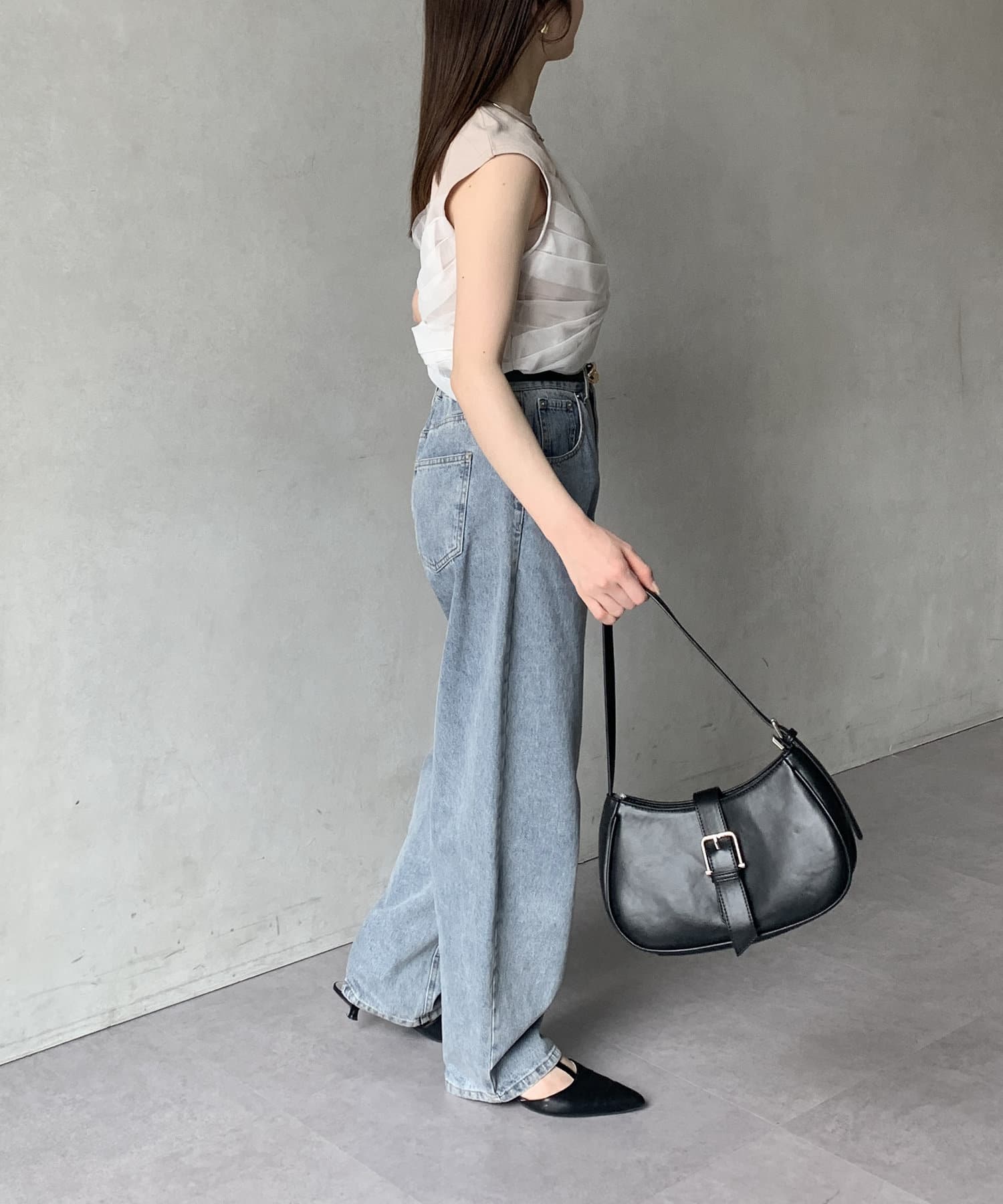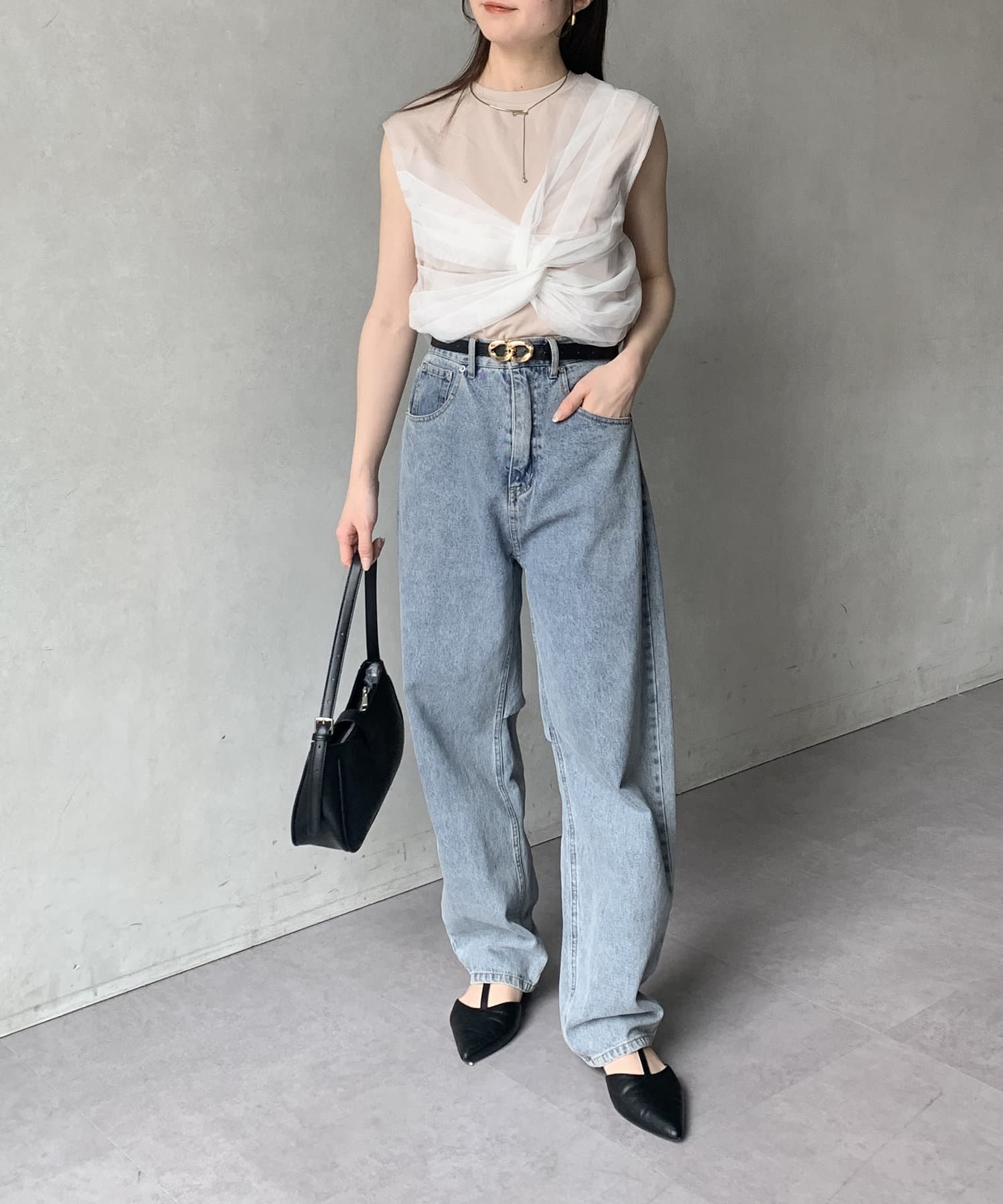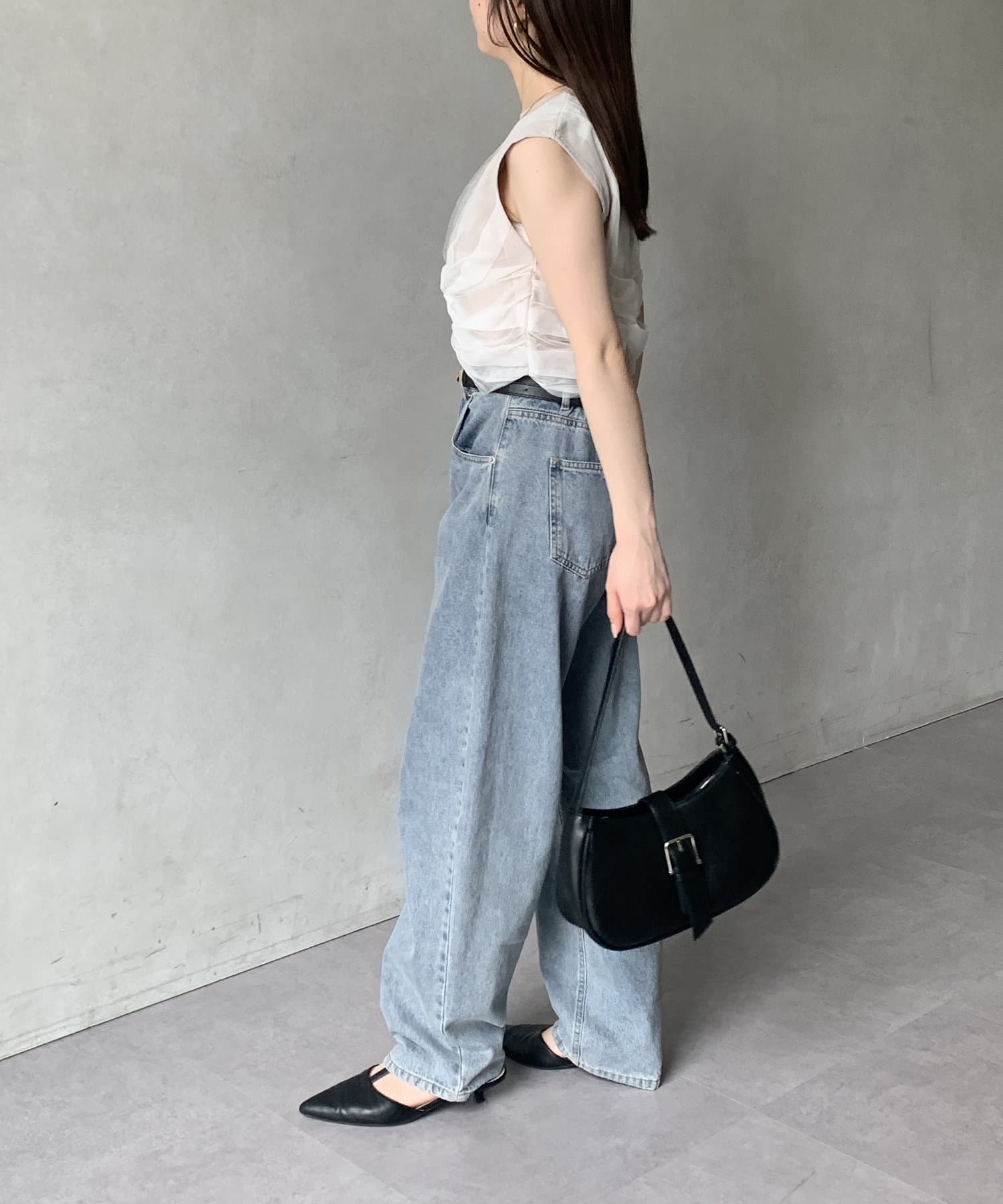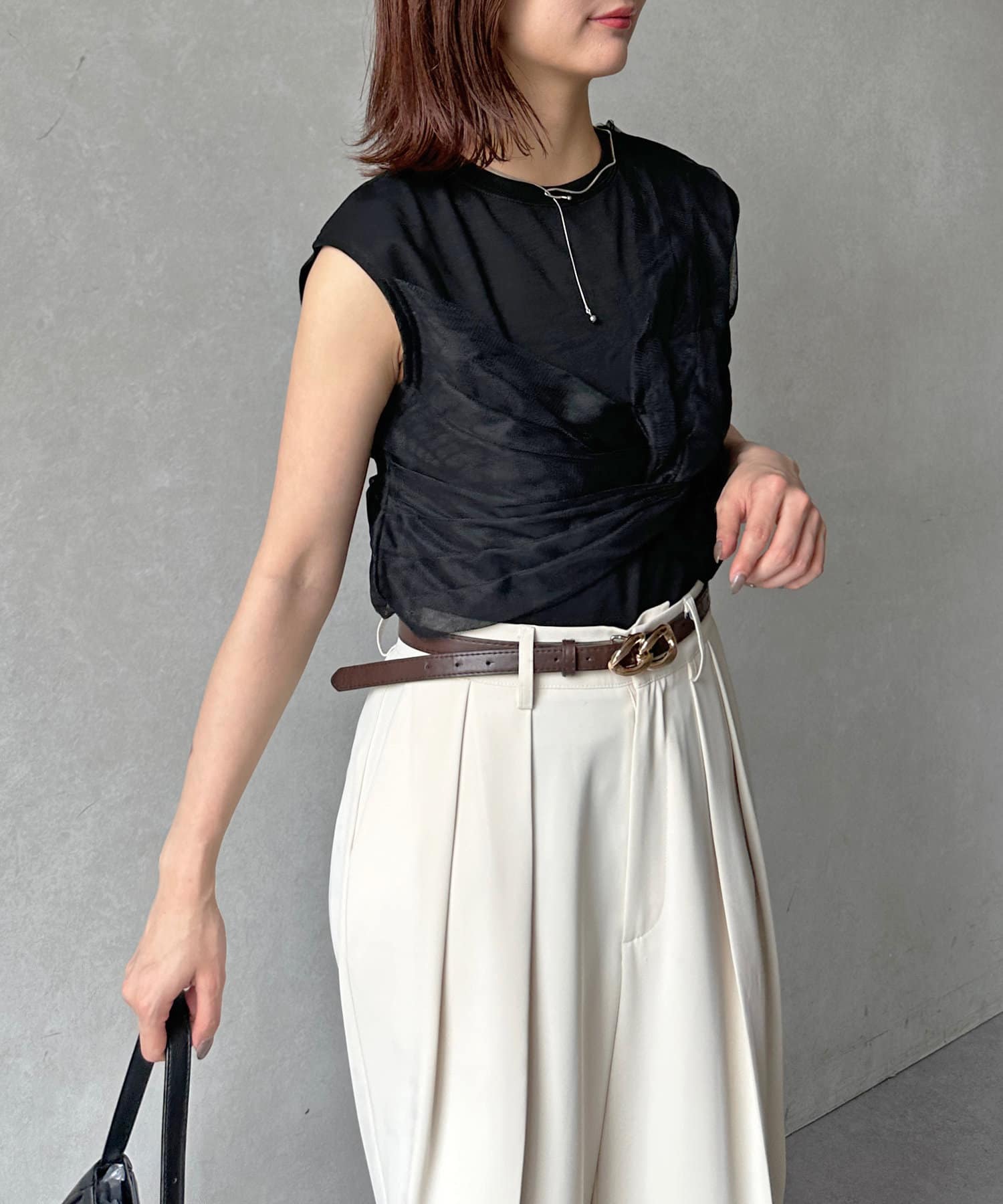パンツにアクセントをプラスしたスタイリングも楽しめます。