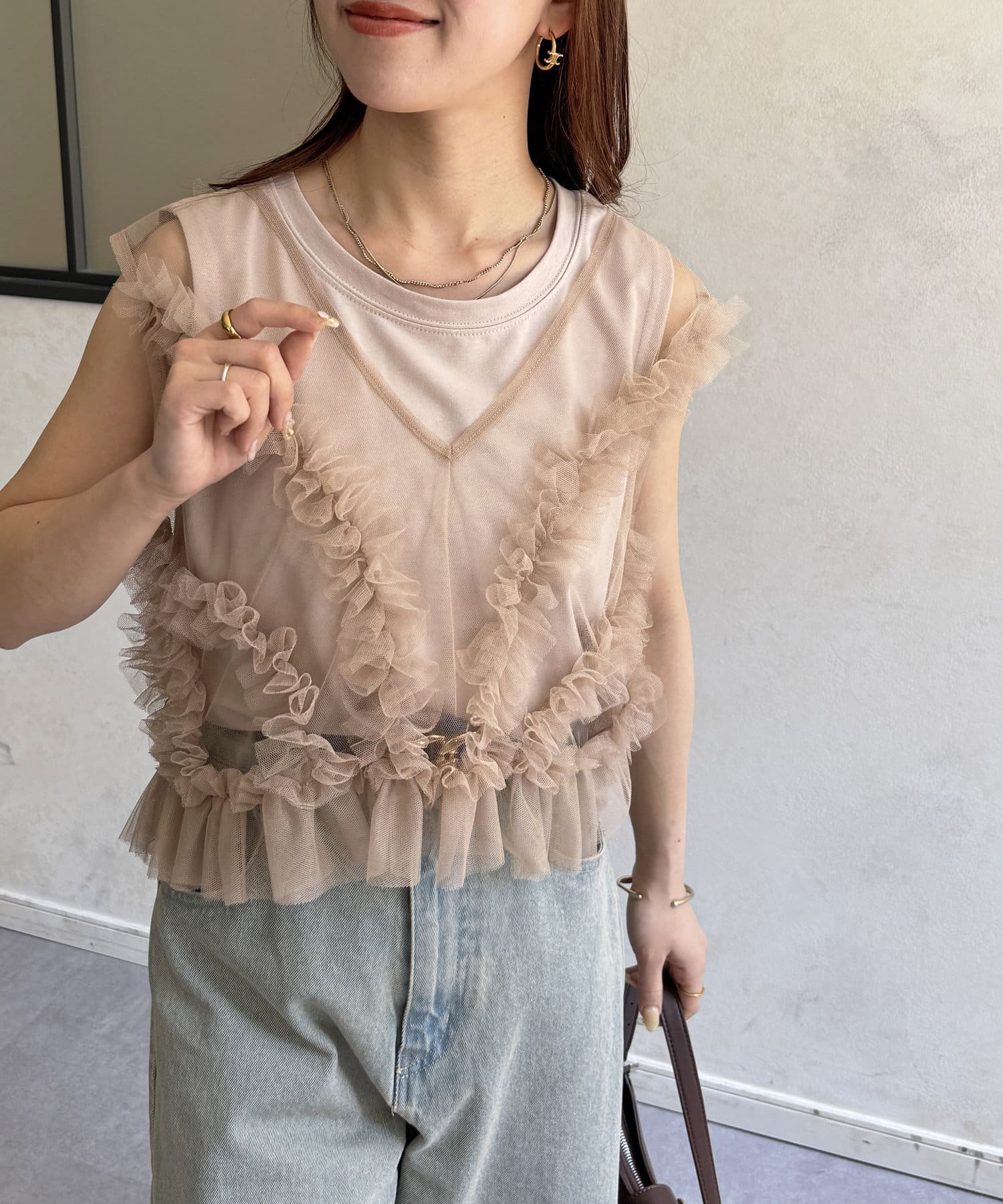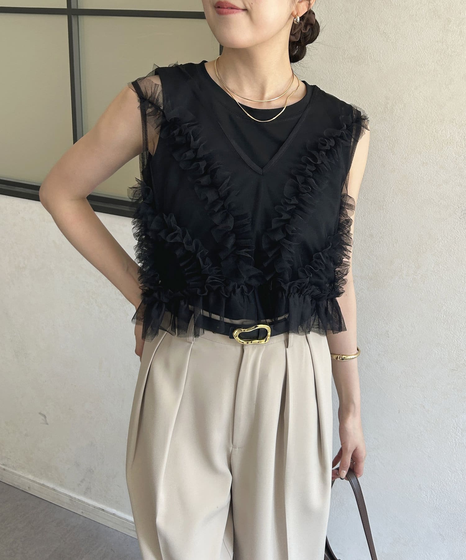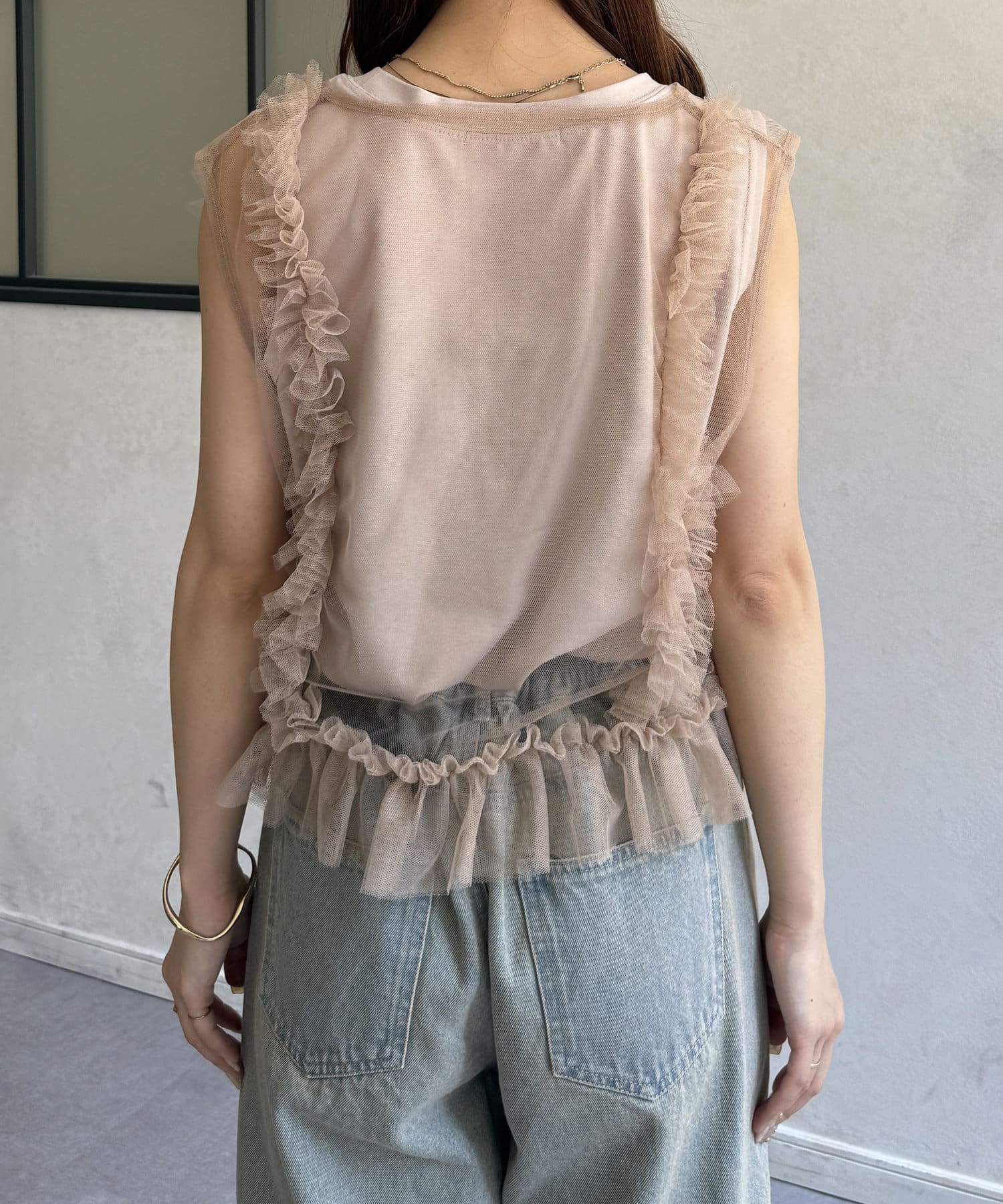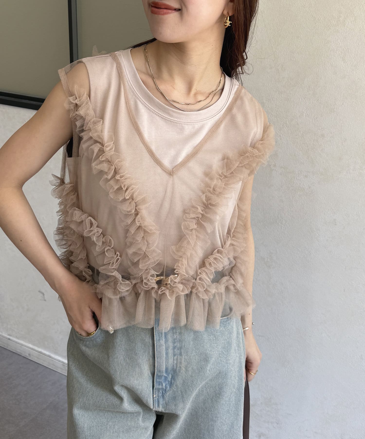 TOP > Thevon. > レディース > トップス > Tシャツ/カットソー > チュールフリルベスト×ノースリセットプルオーバー