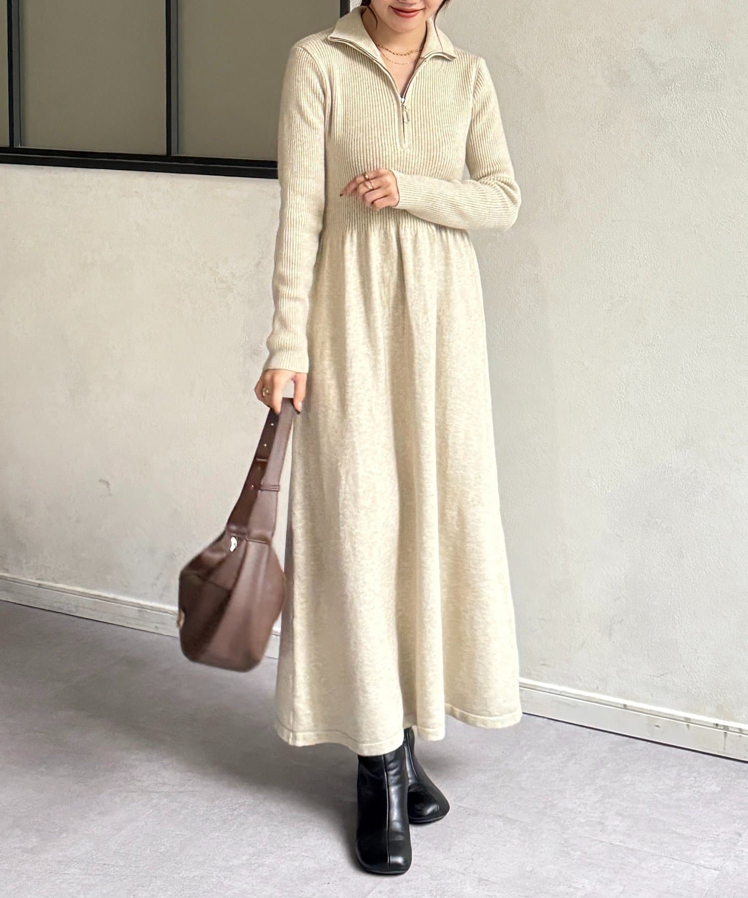 #ニットワンピース #ハーフジップ #フレアワンピース #リブニット