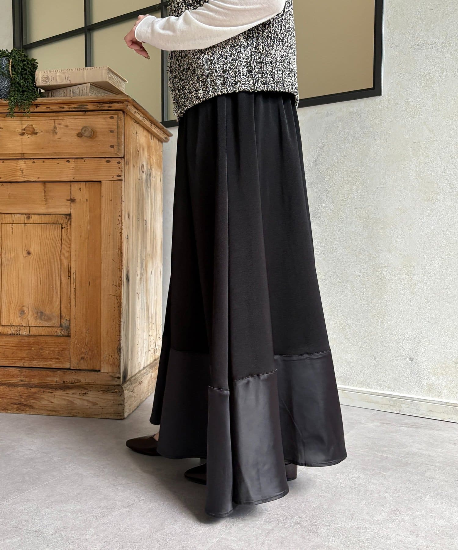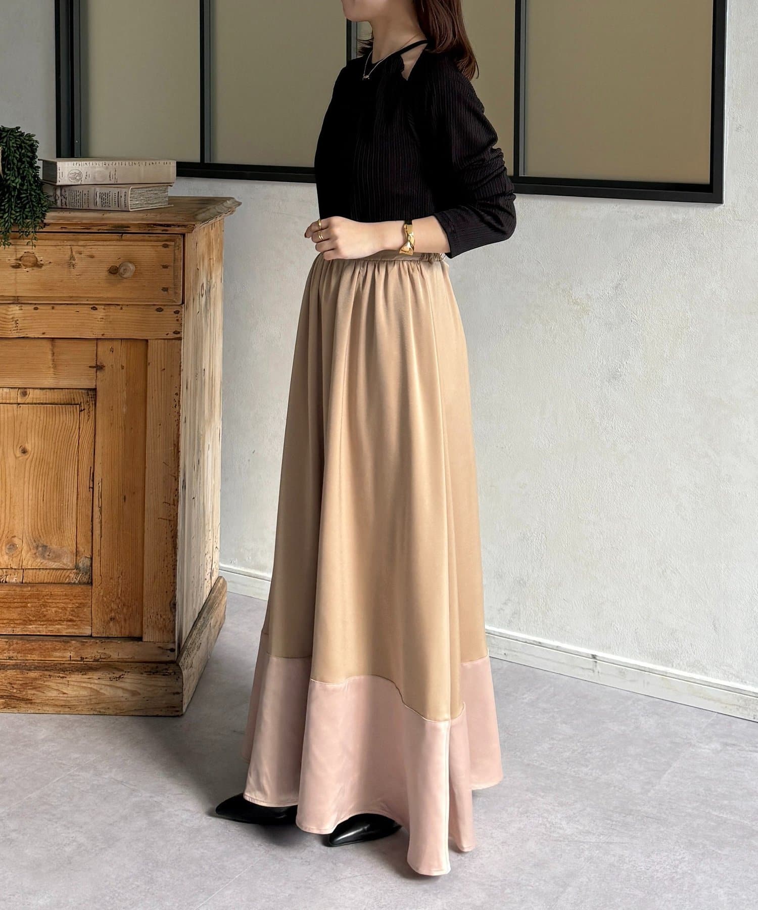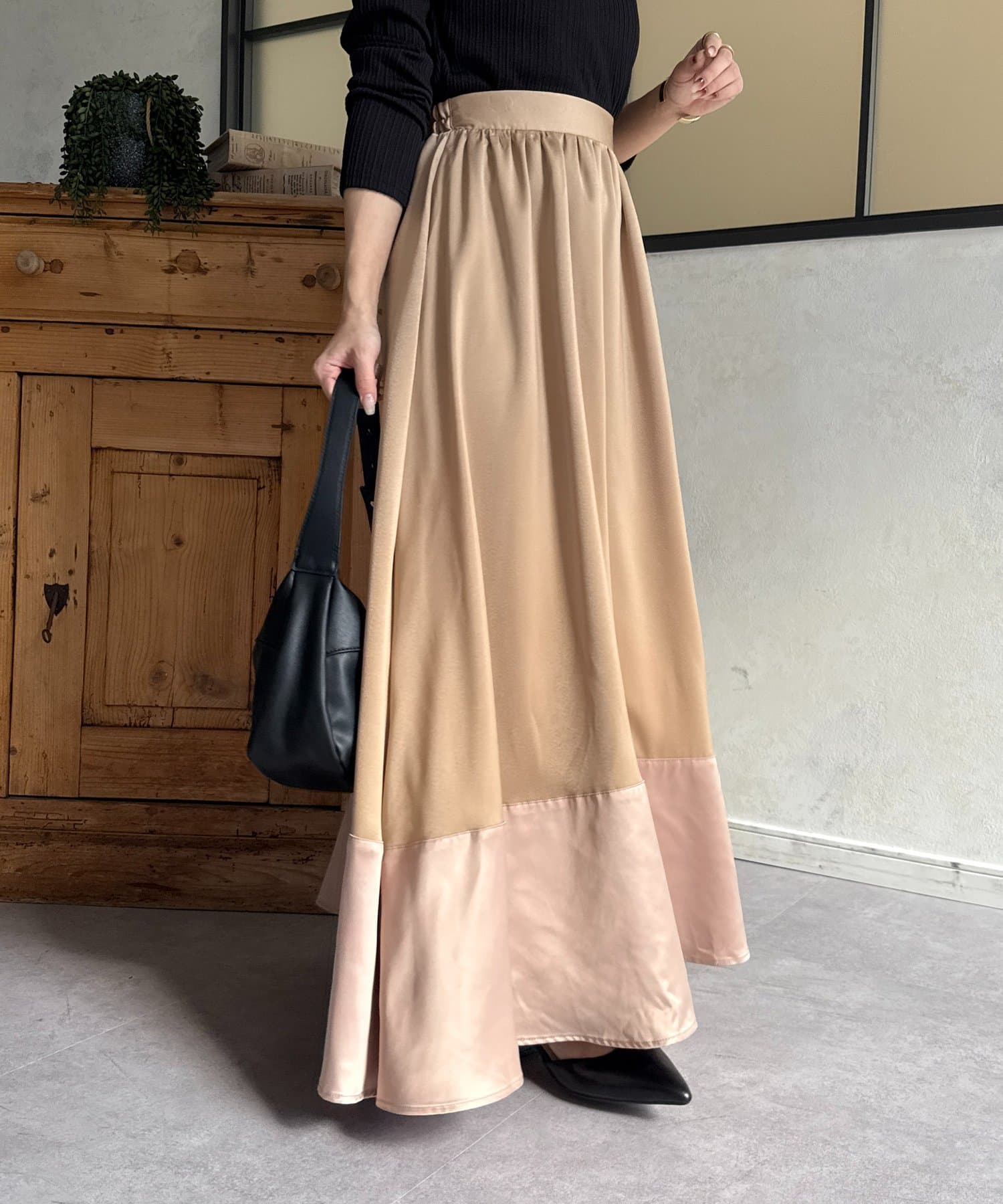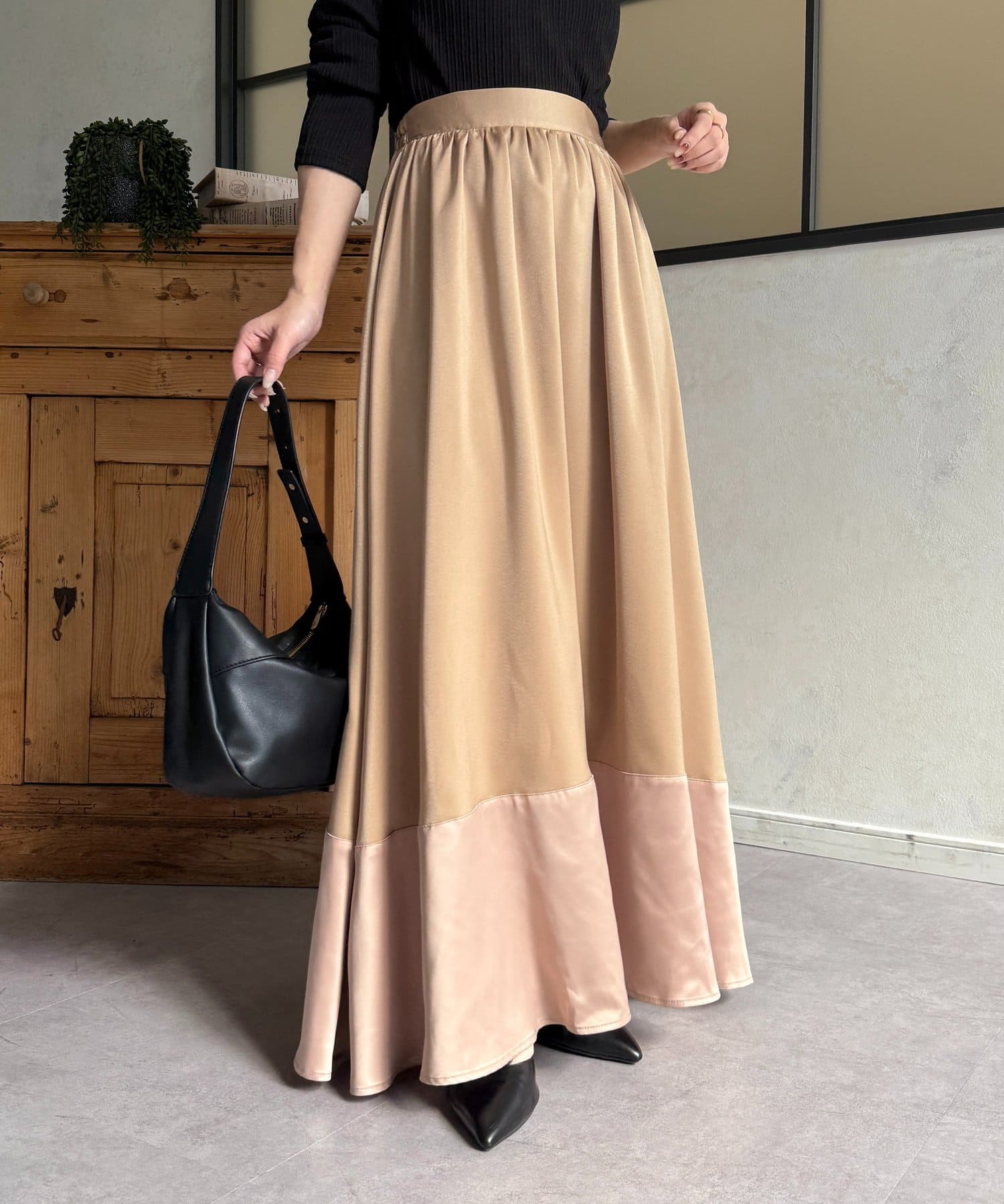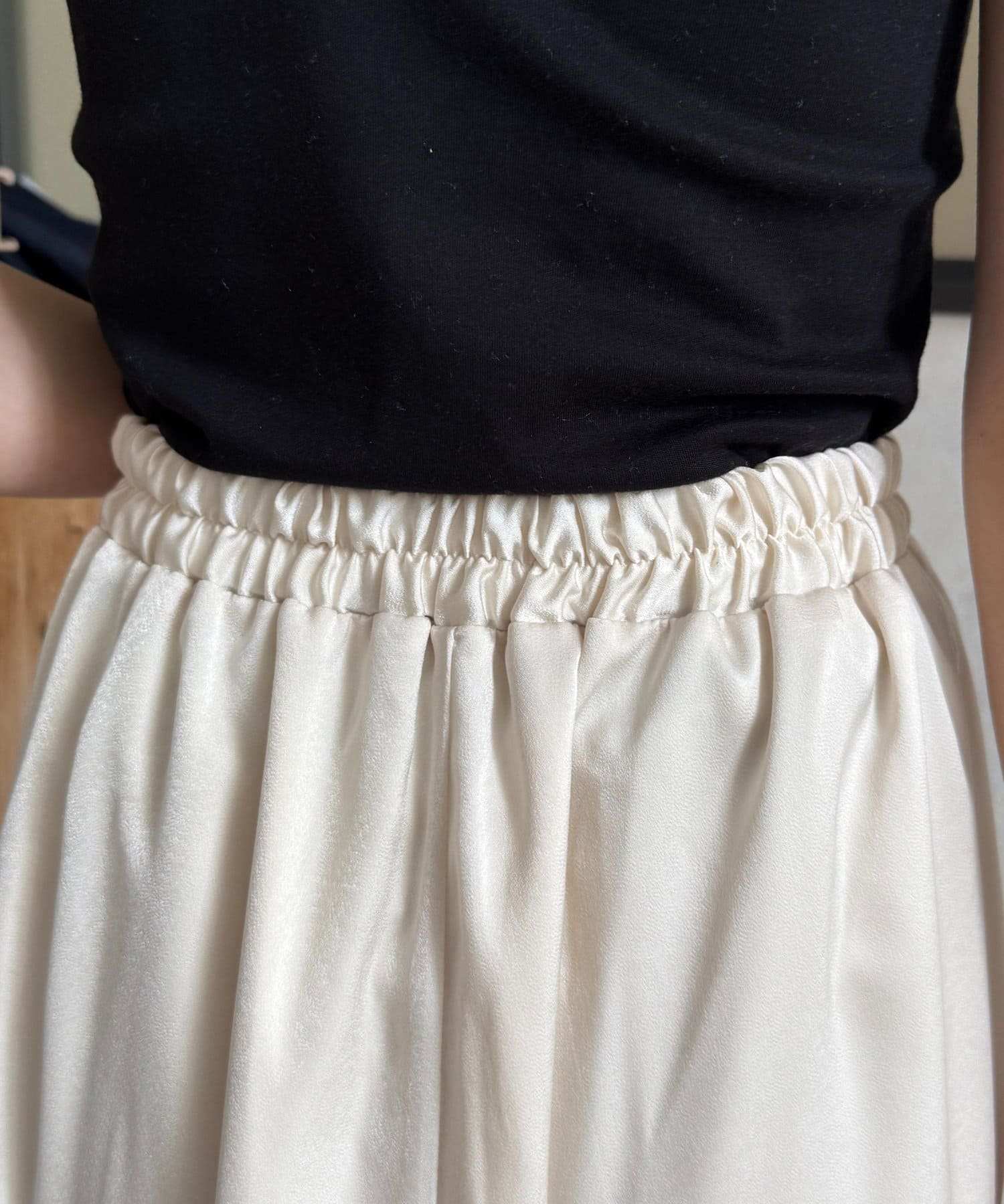 裾切替マットサテンギャザーフレアスカート