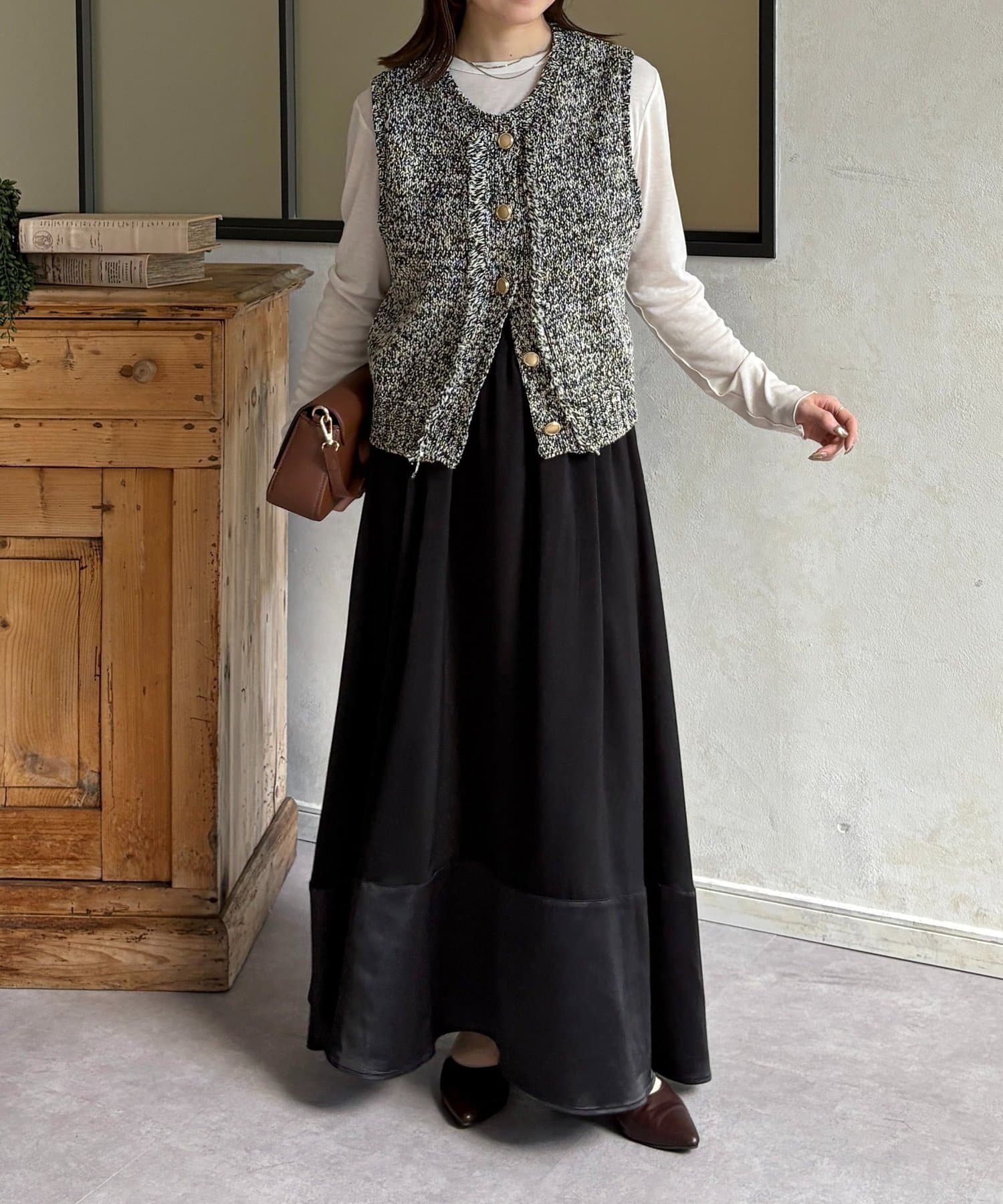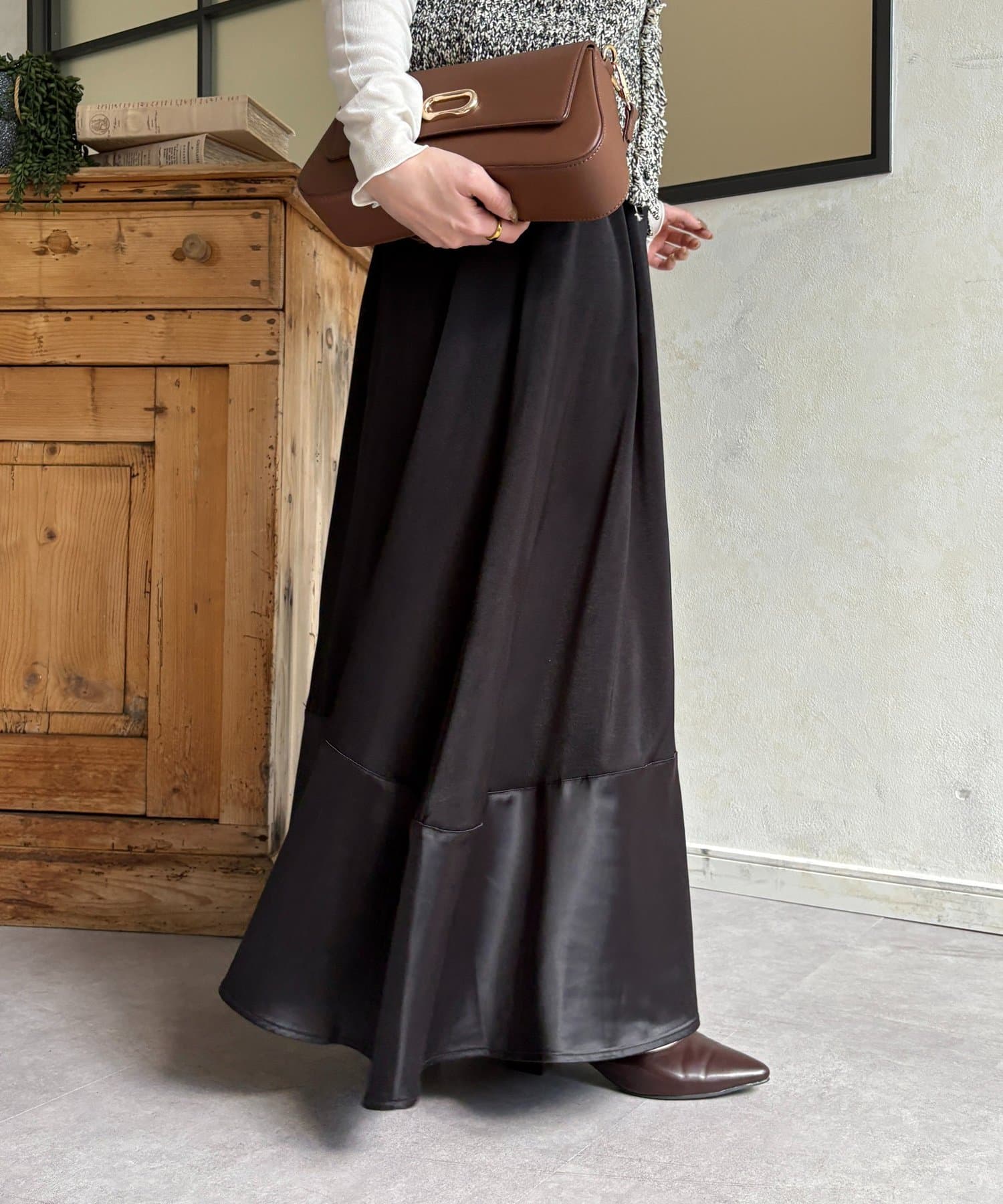 ・タイトめなトップスをインして、スカートのシルエットを際立たせて足元は