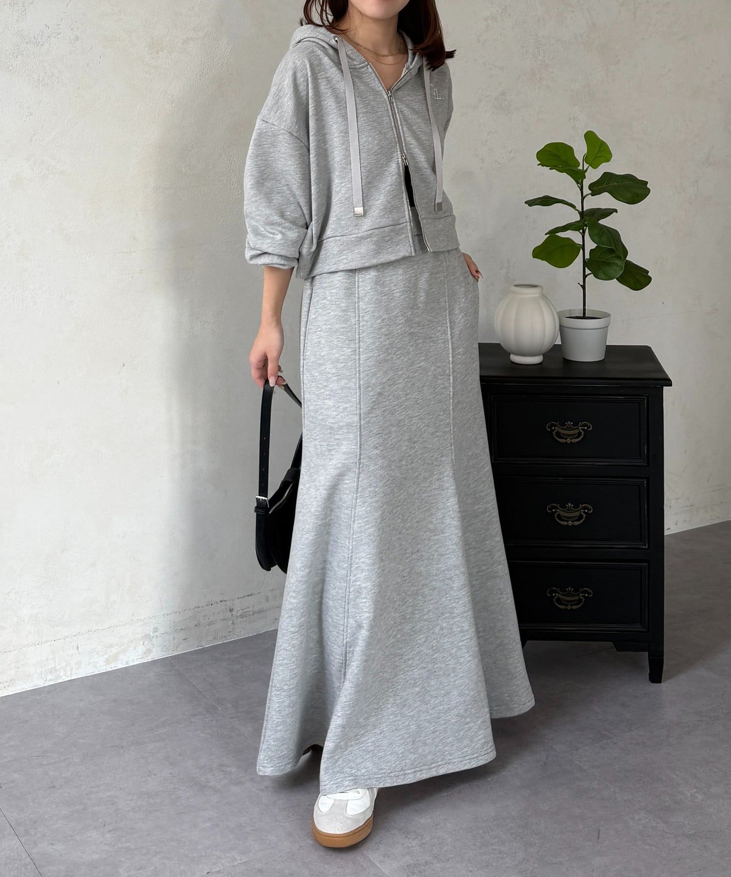 ・同素材のトップスを合わせてとことんカジュアルに。足元にはパンプスで