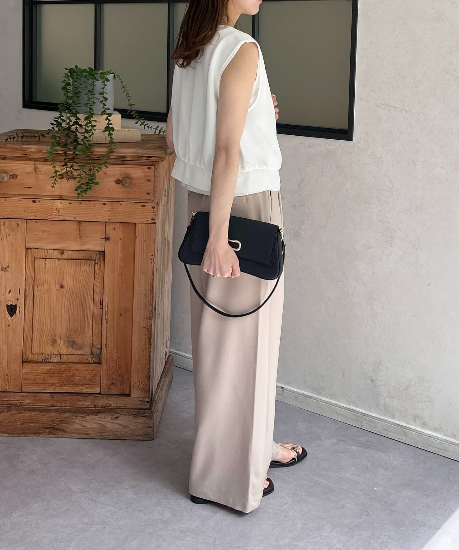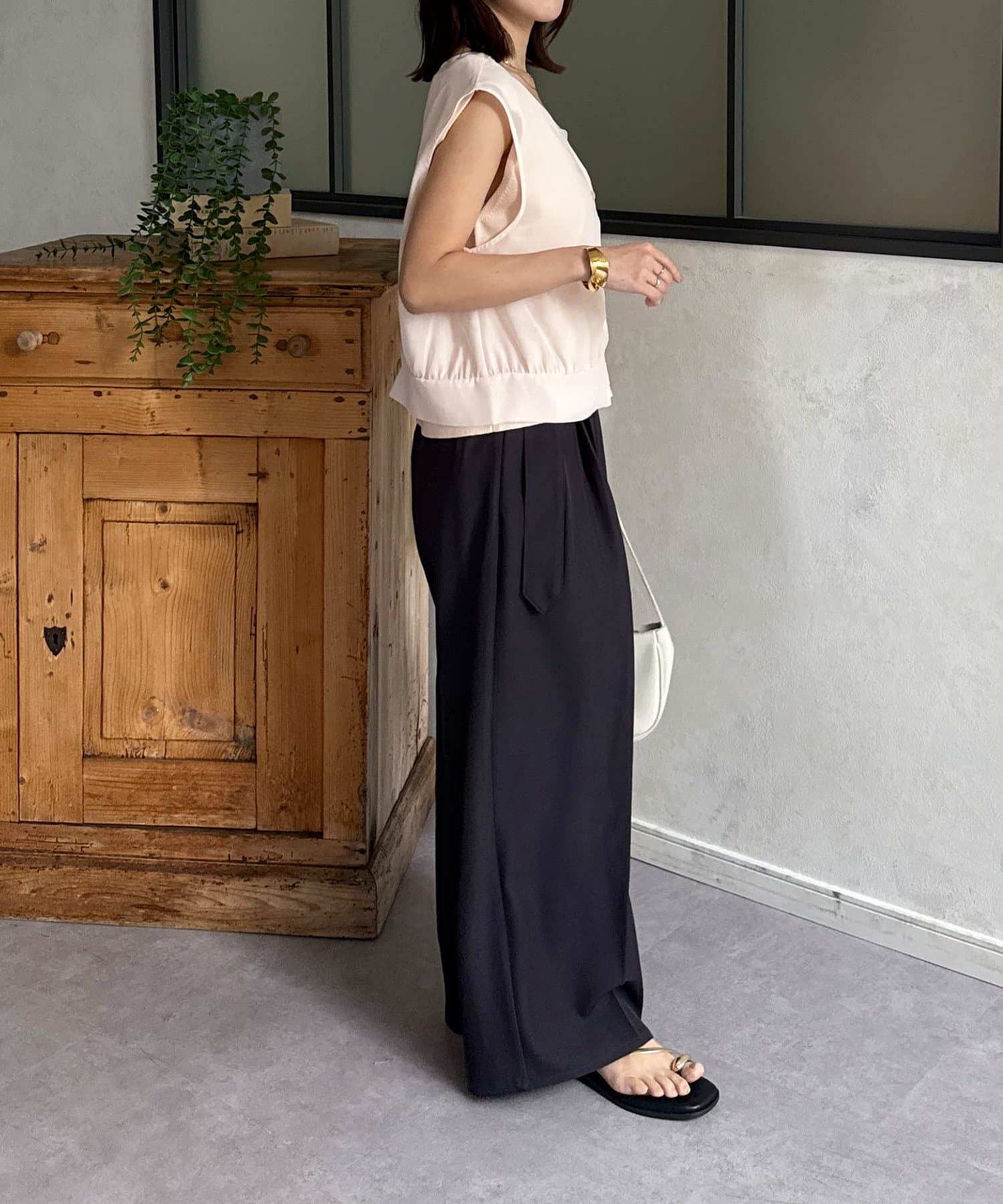 足元は華奢なサンダルで、女性らしく仕上げて。