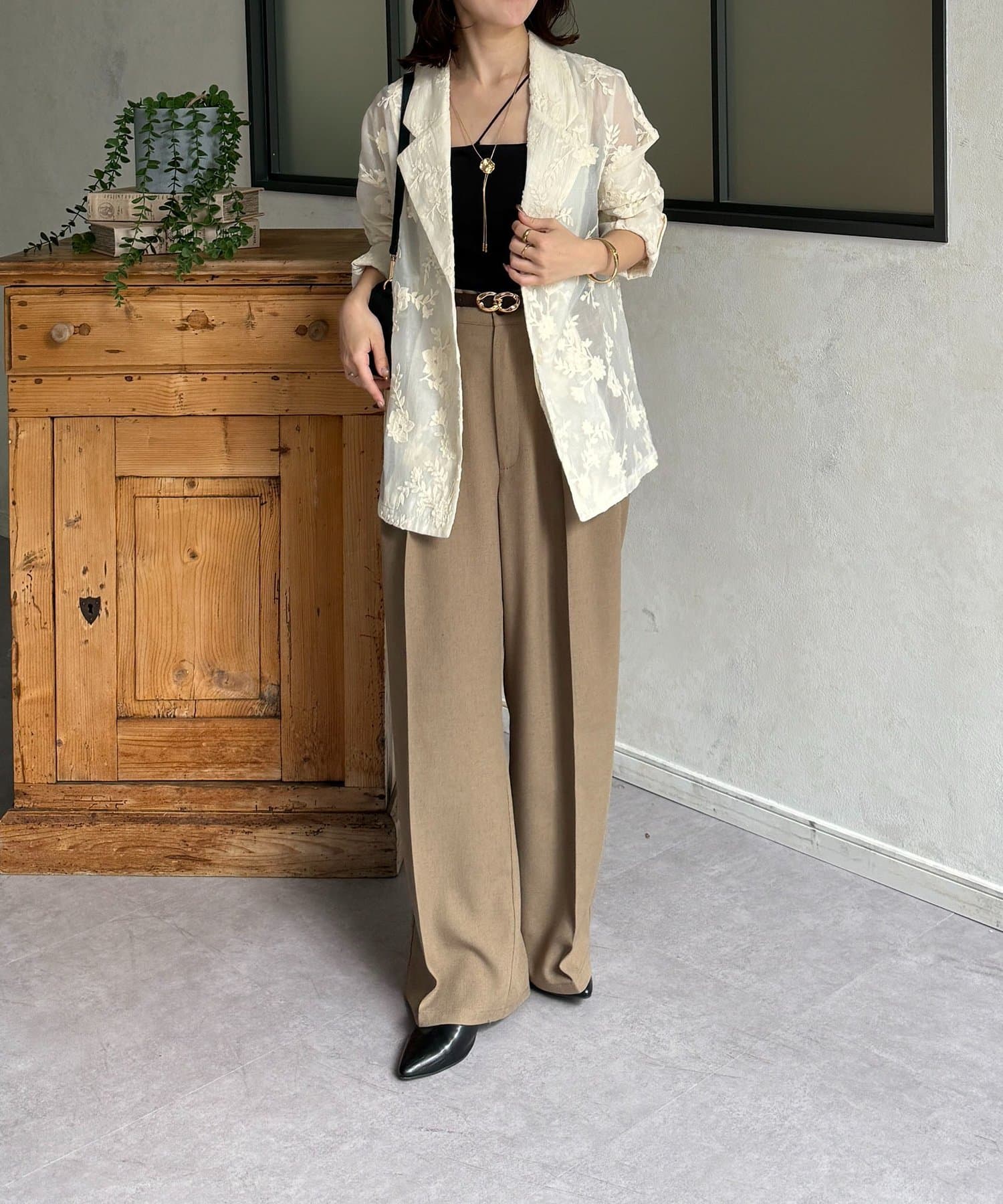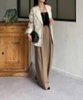 ・インナーにシンプルなブラウスを合わせ、テーパードパンツとパンプスを。