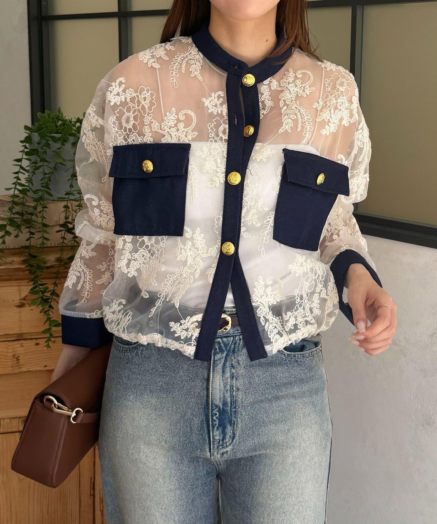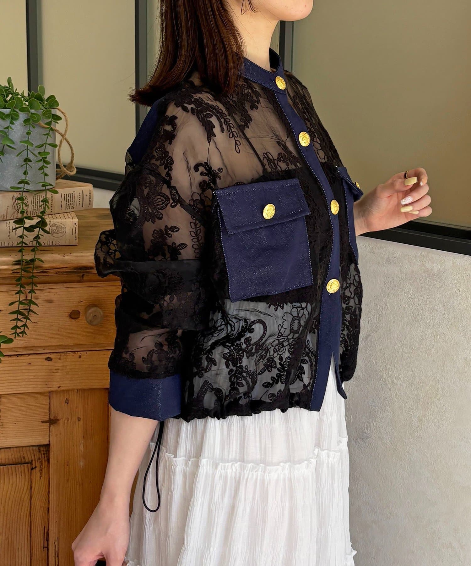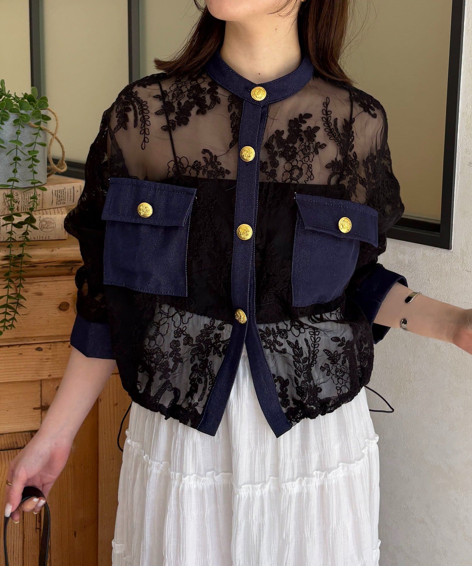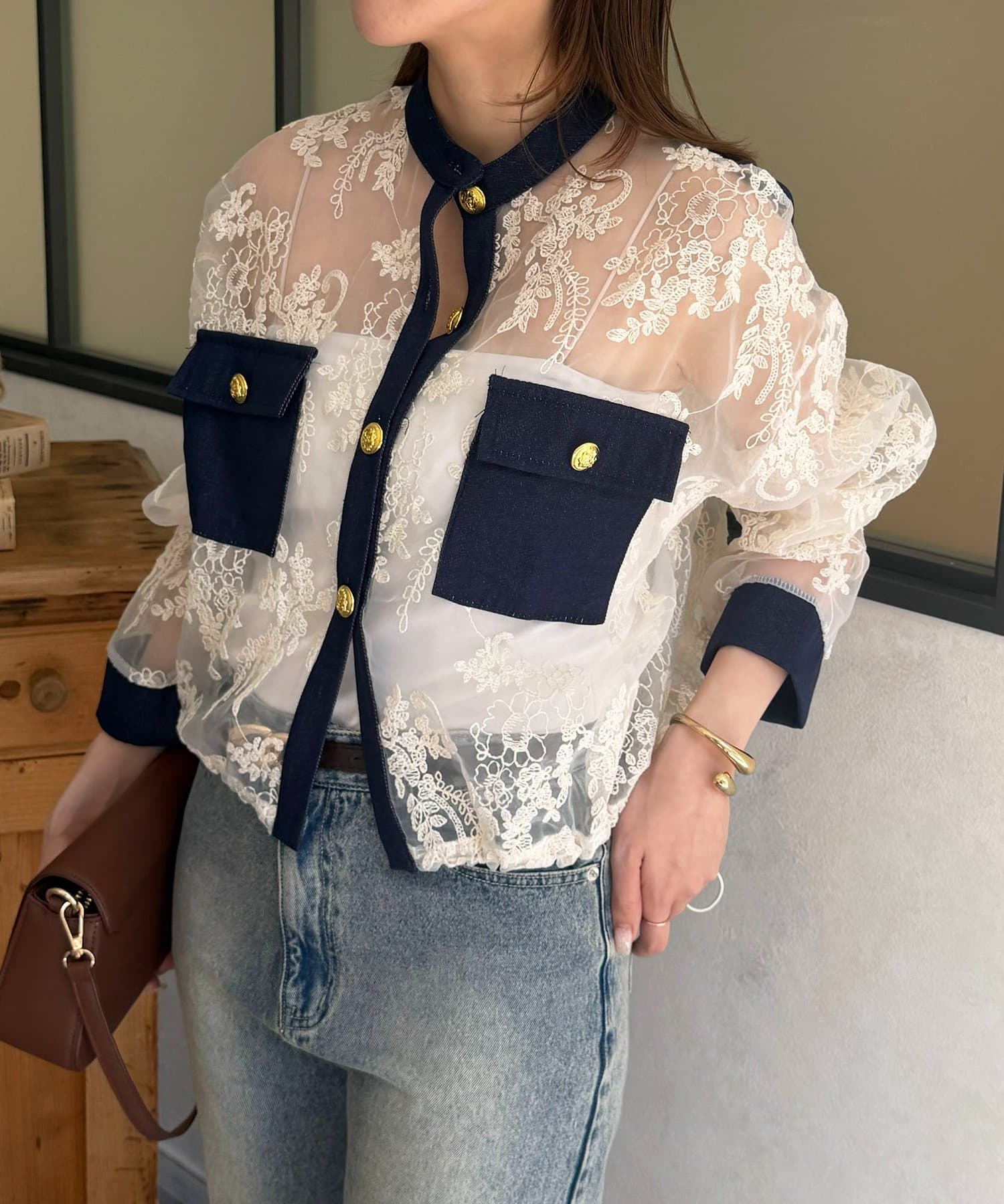 GOLD釦デニム切替レースジャケット