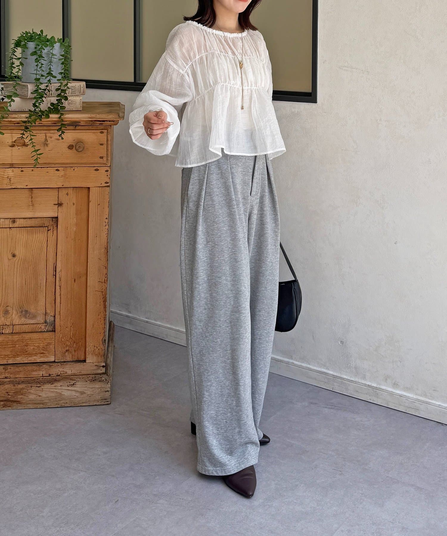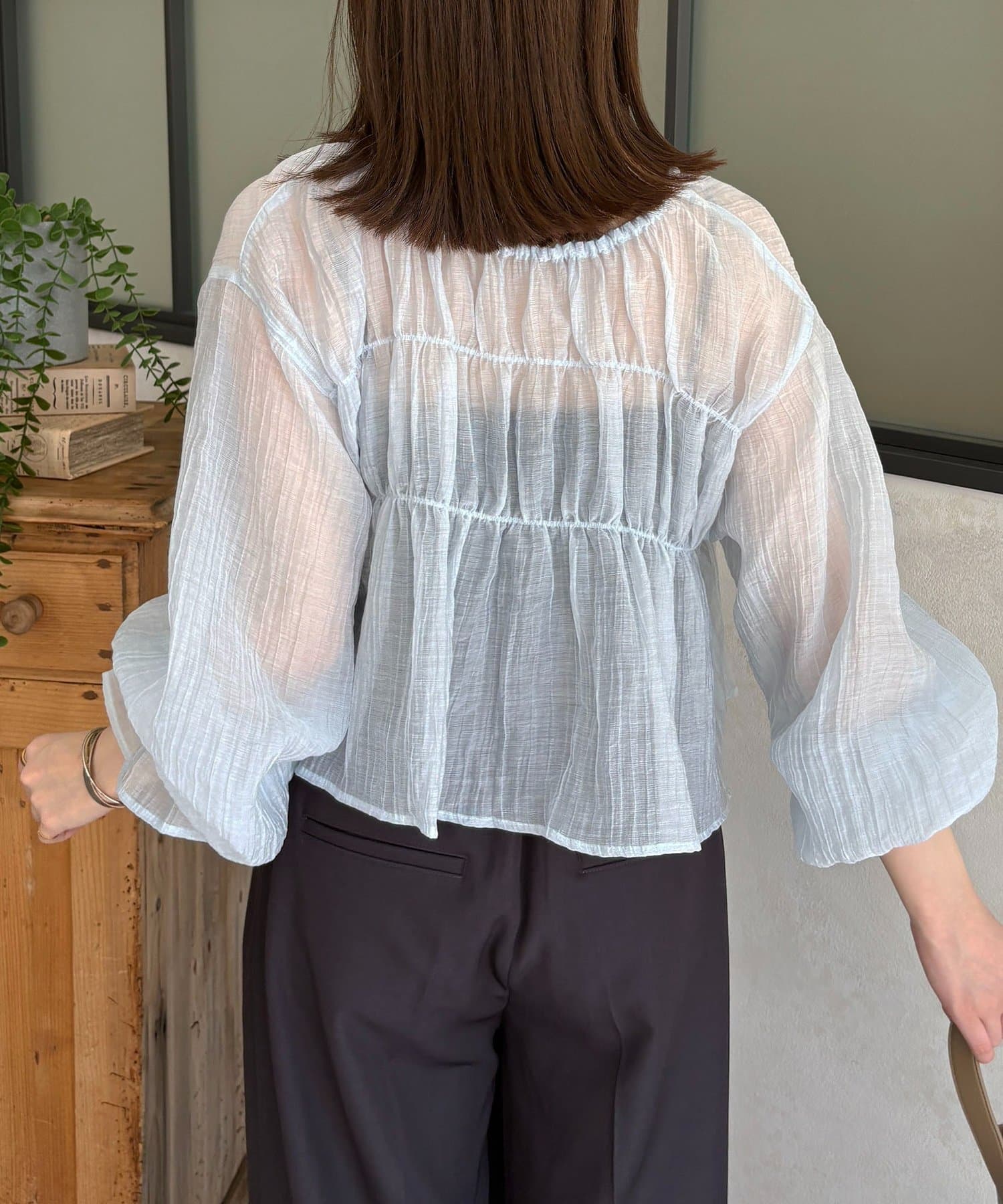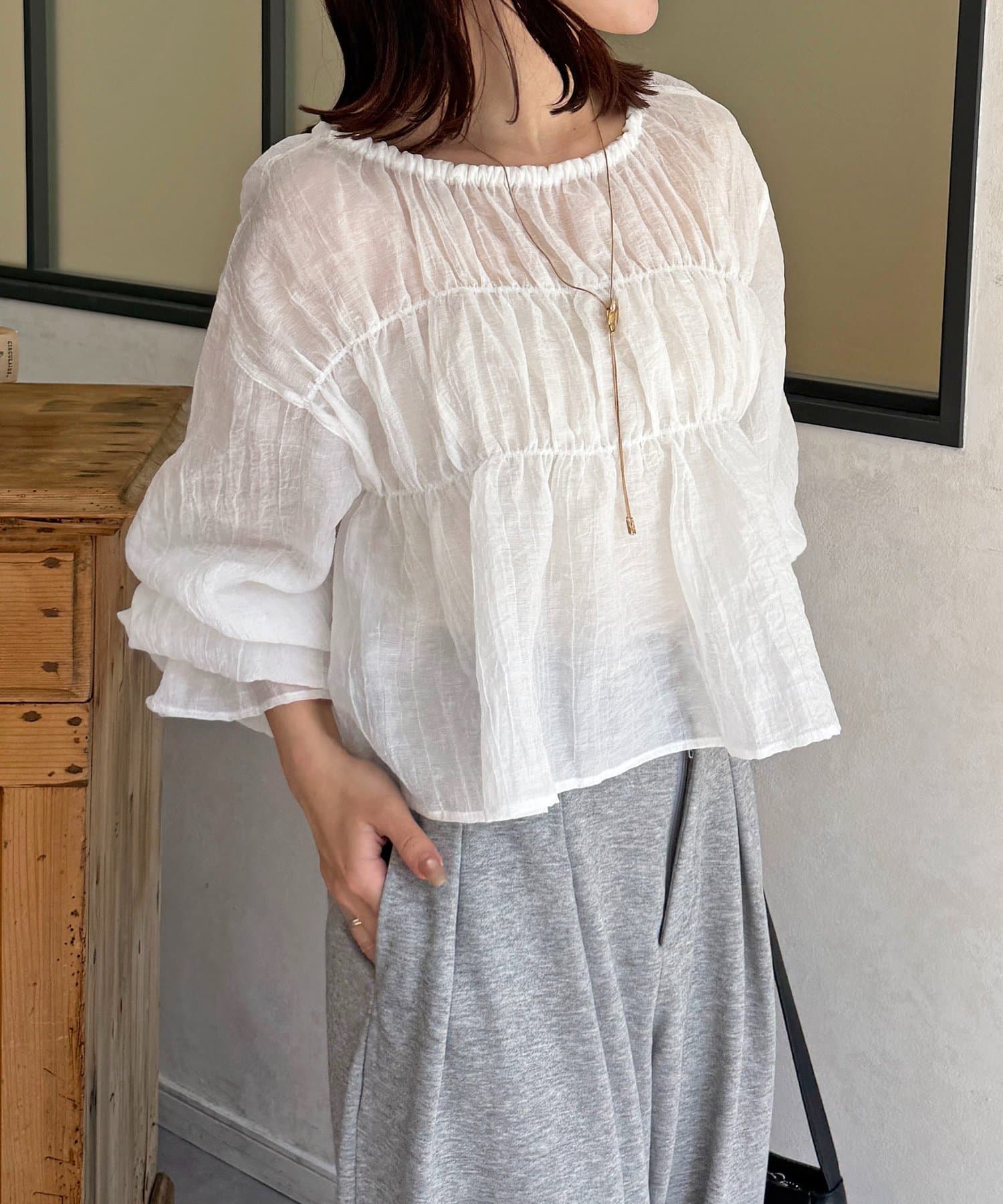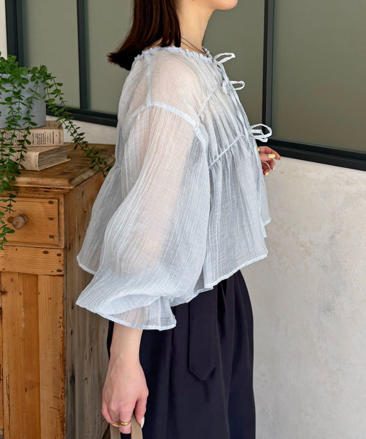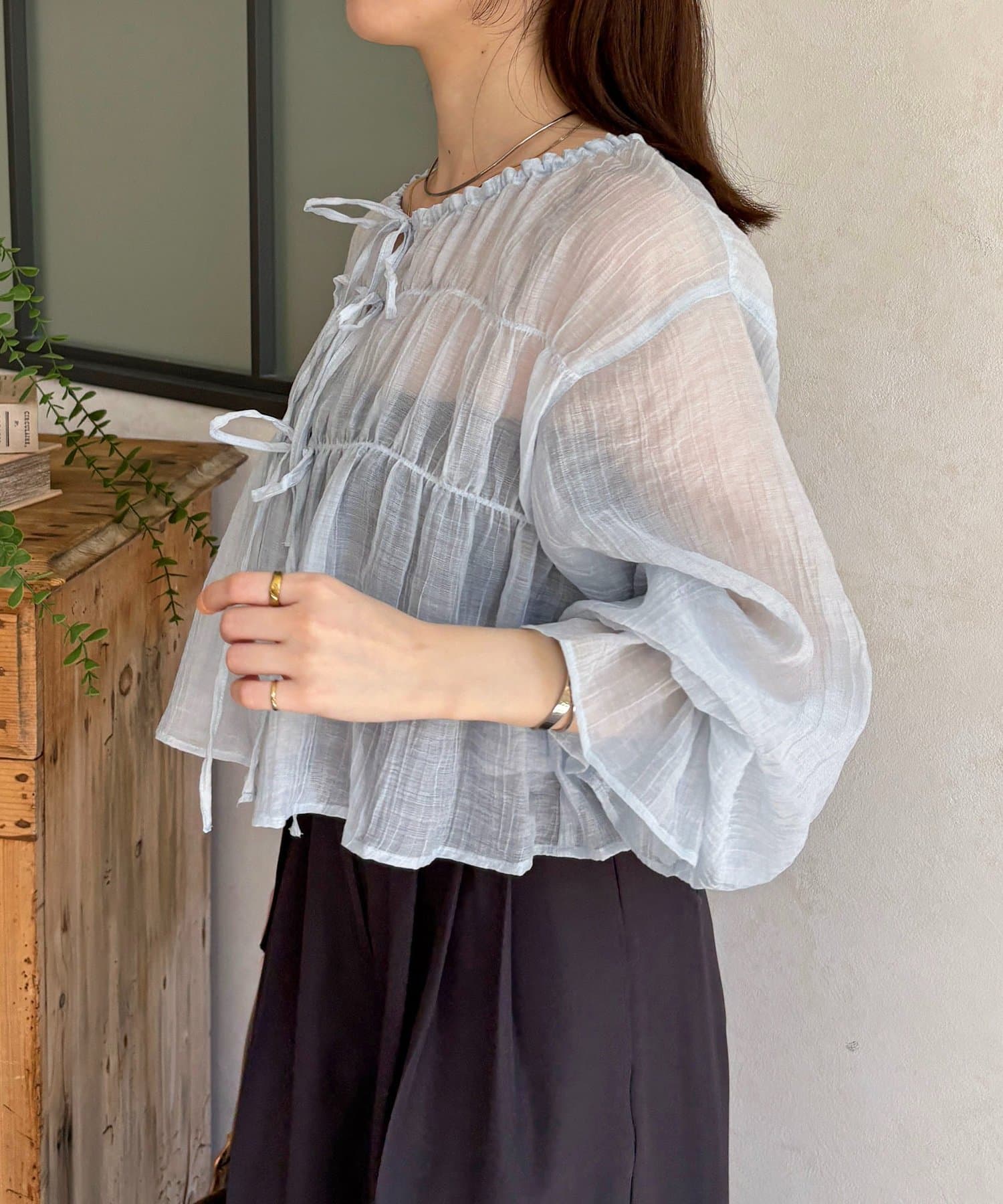 楊柳シアー素材が、動くたびにふわりと揺らめくブラウス