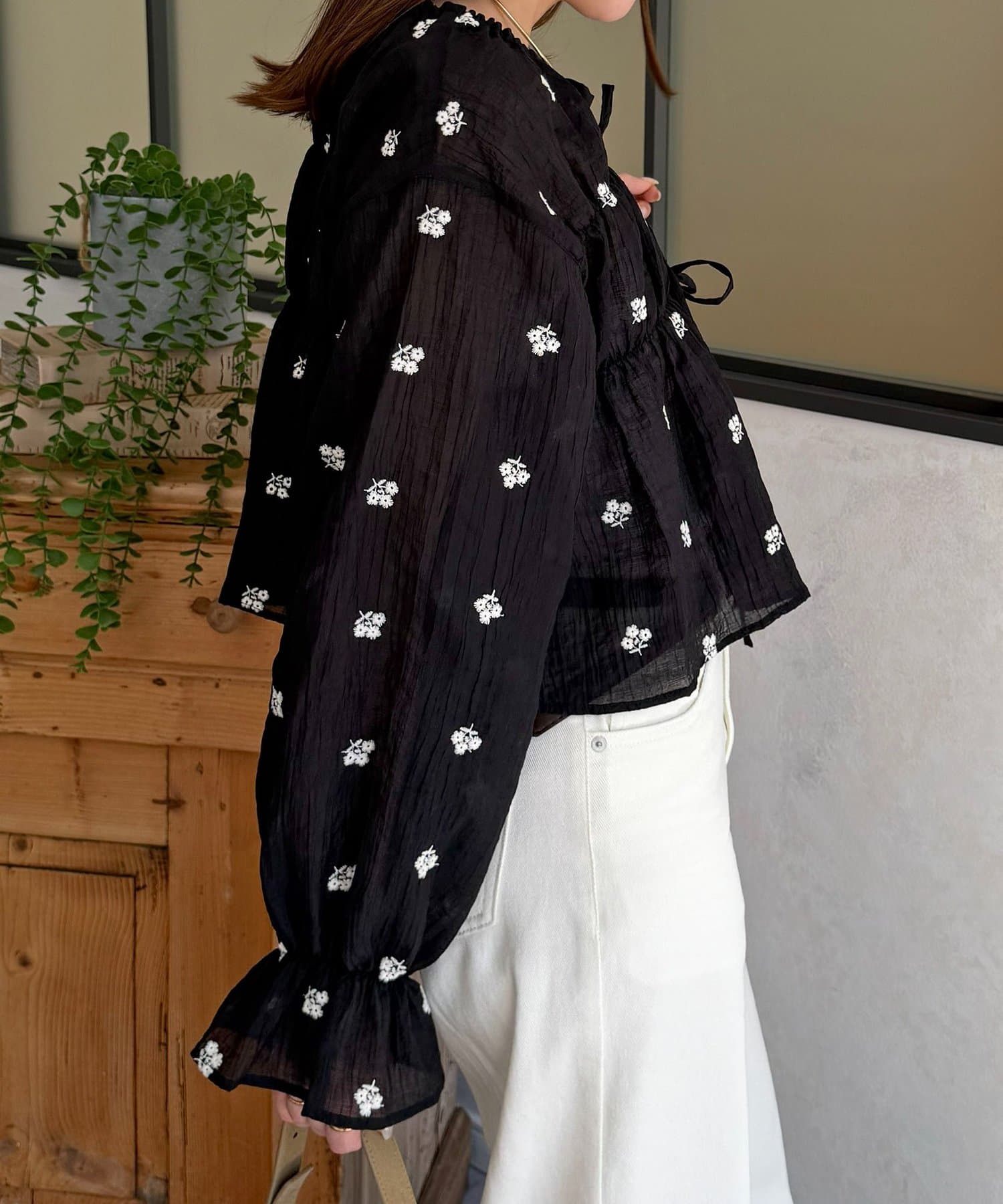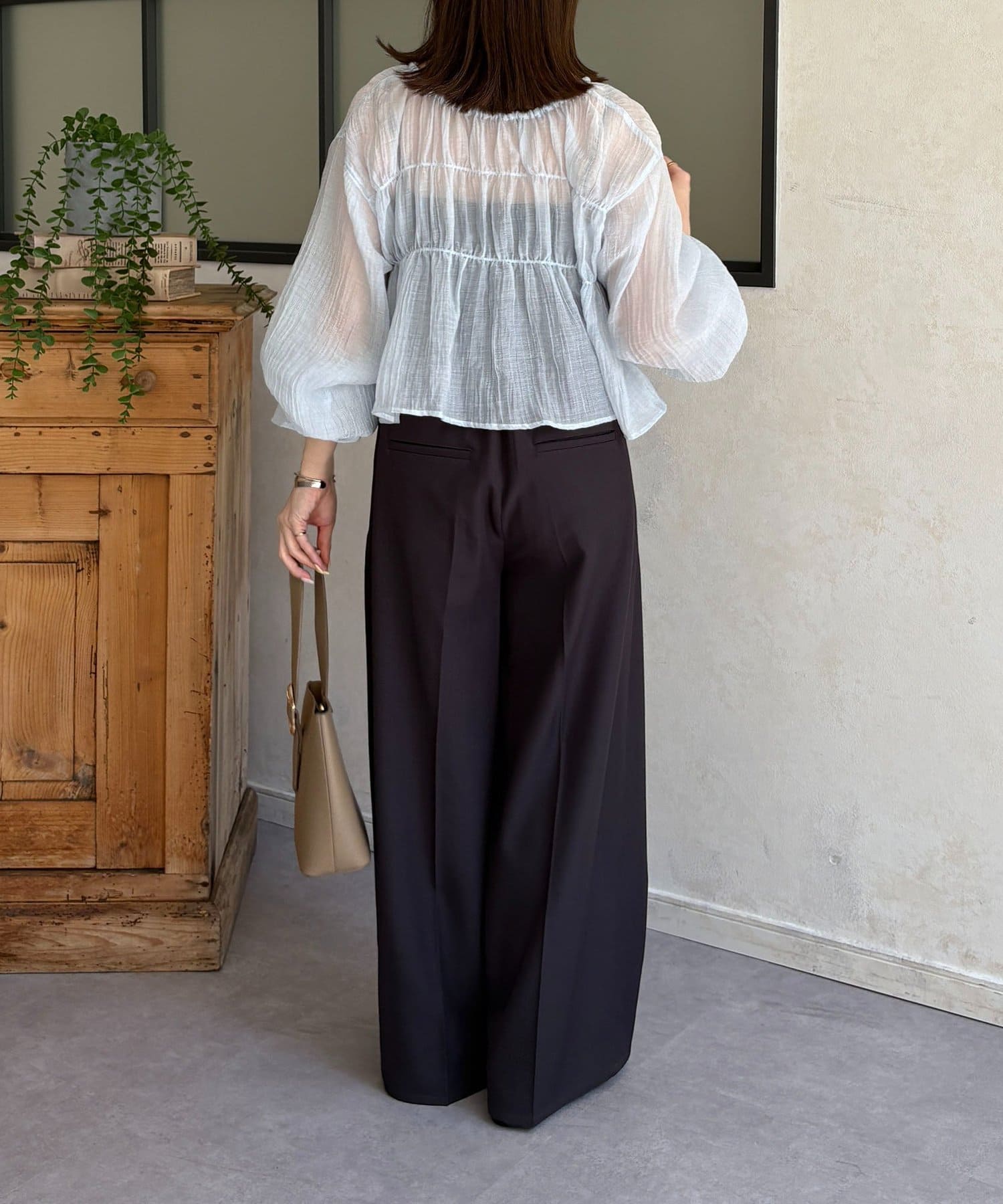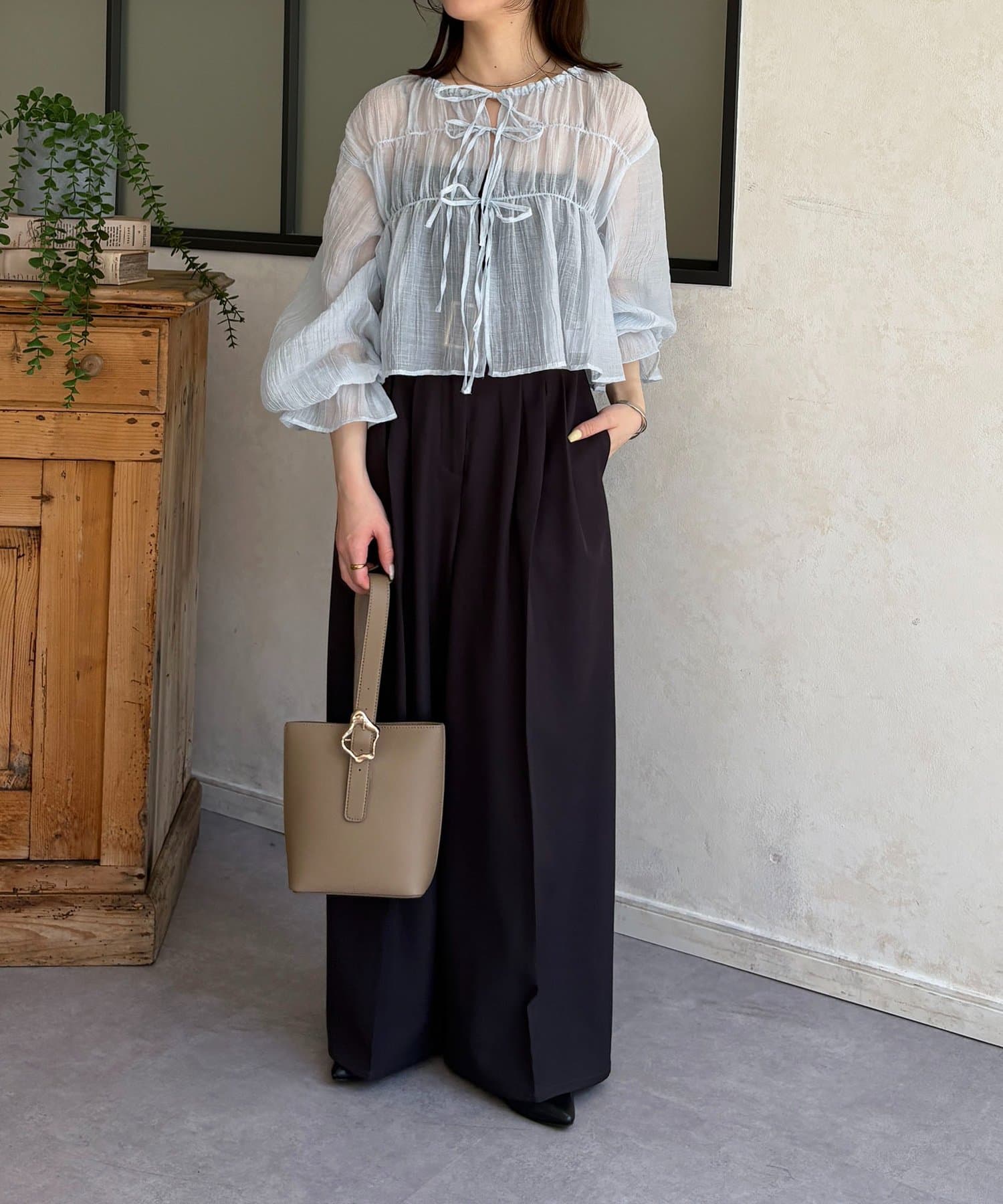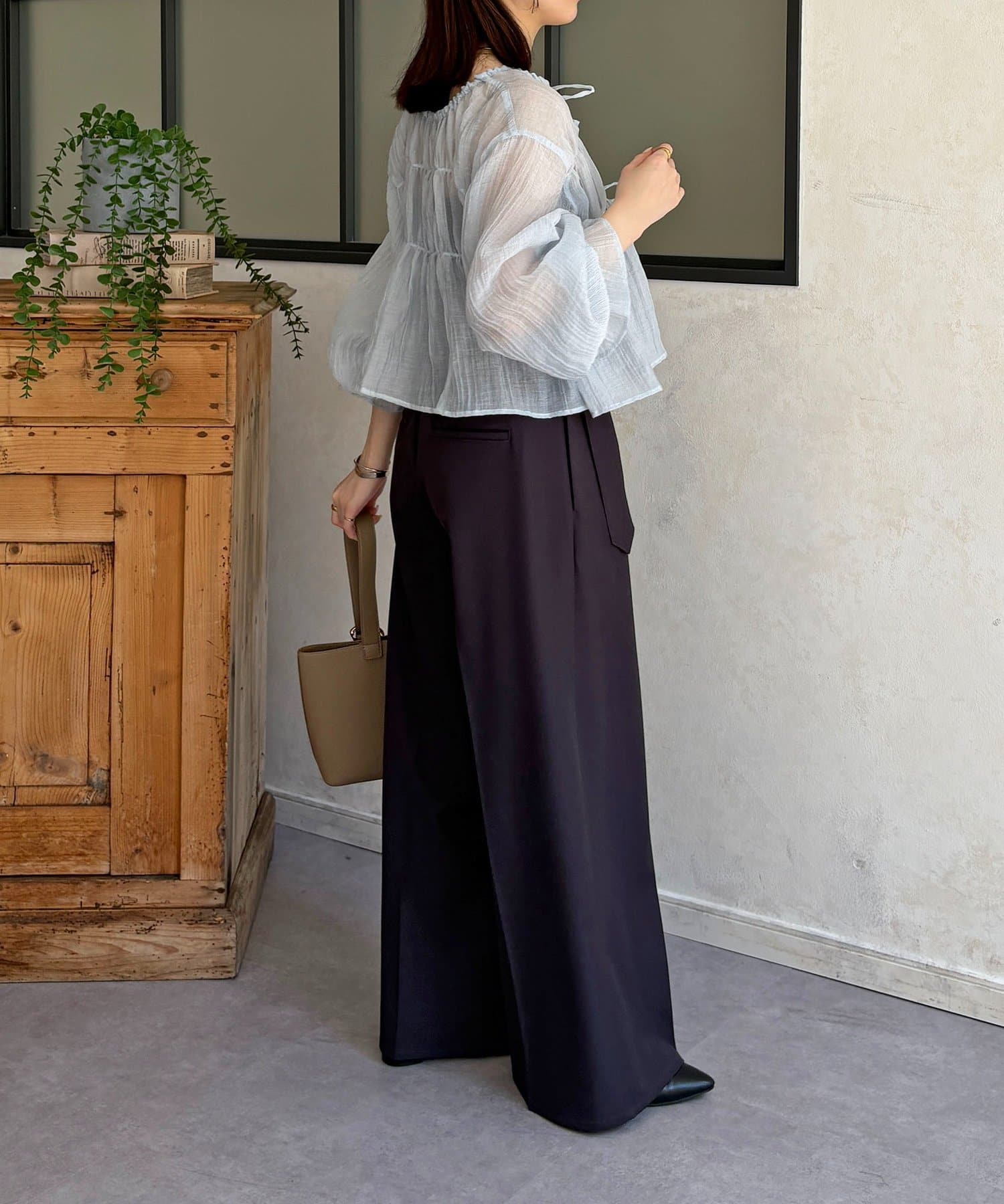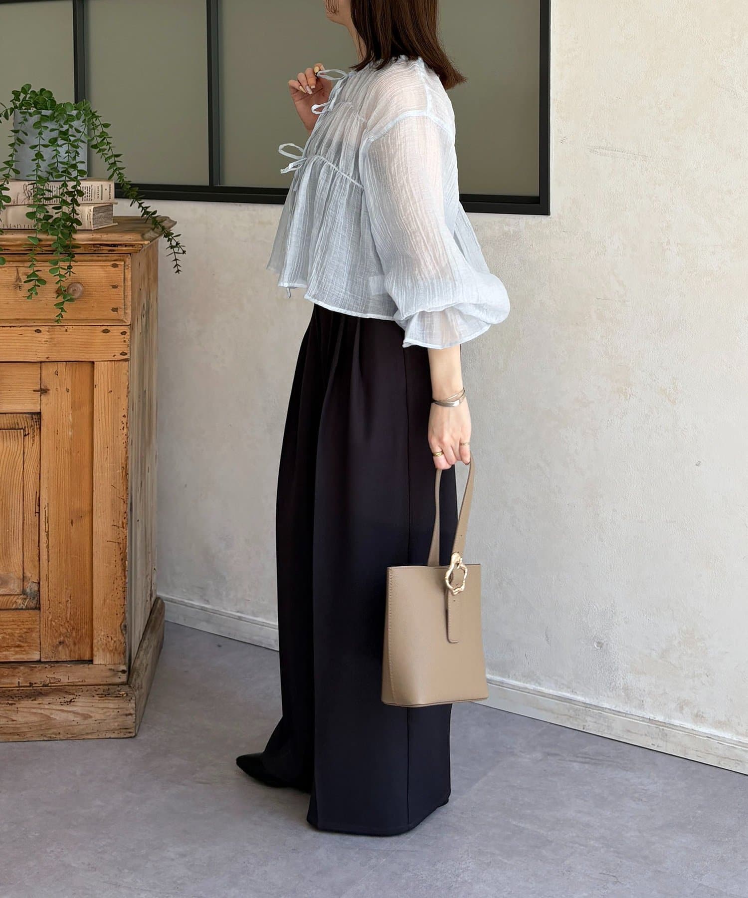 楊柳シアー素材が、動くたびにふわりと揺らめくブラウス