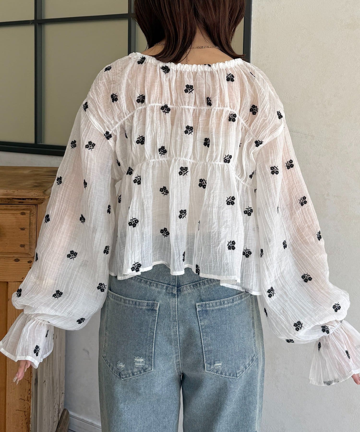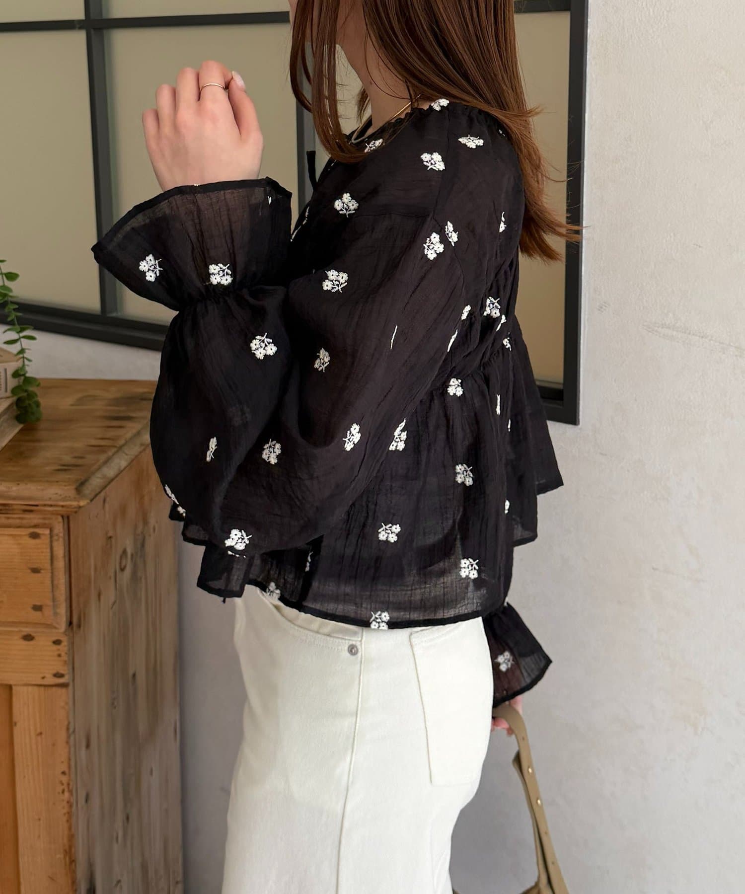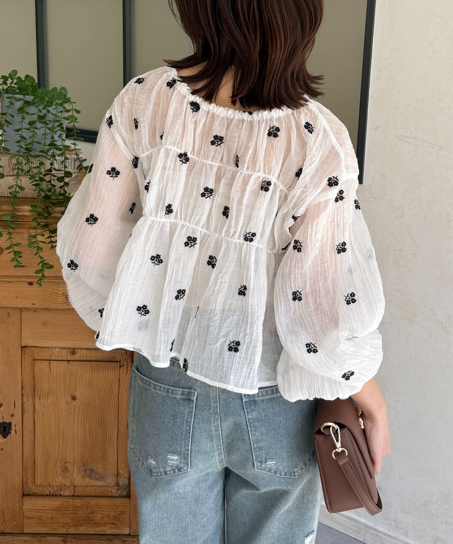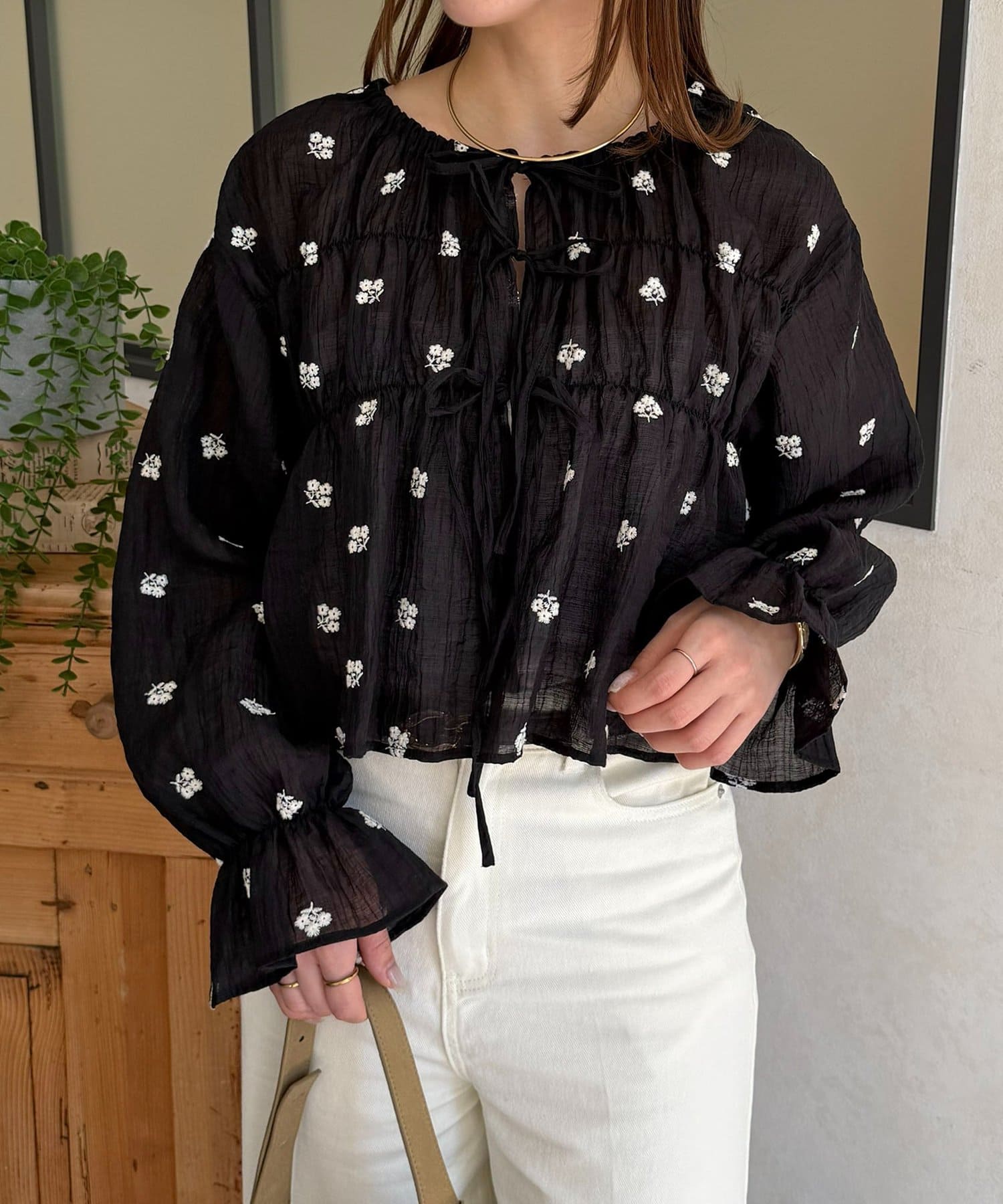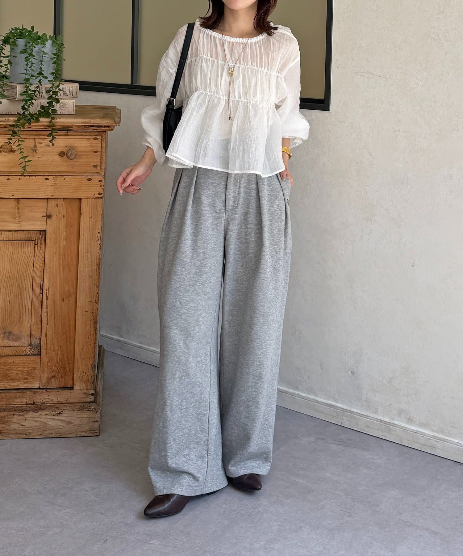 楊柳シアー素材が、動くたびにふわりと揺らめくブラウス