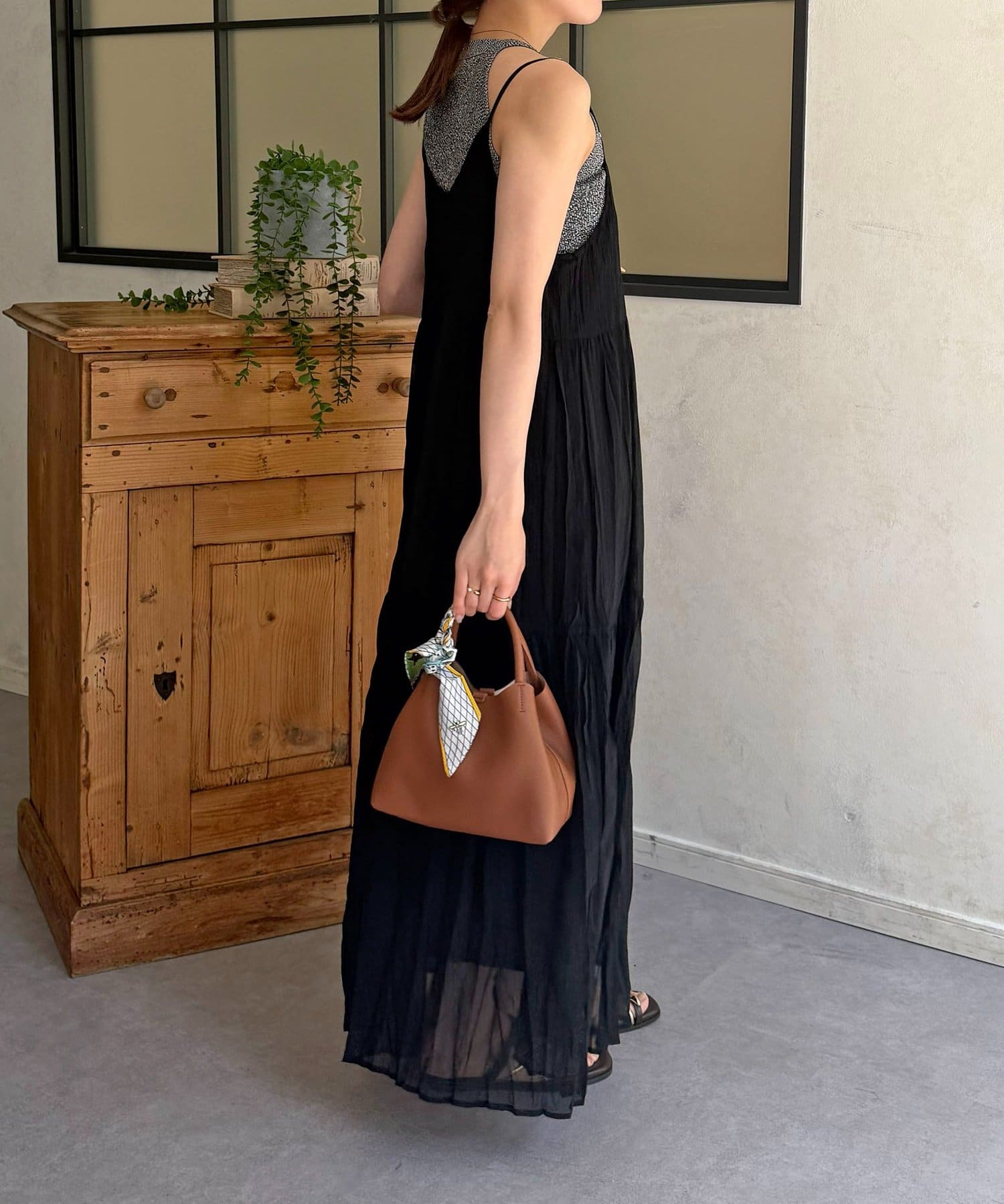 ・すとんと落ちるシルエットと、華奢な肩紐が女性らしさを引き立てる