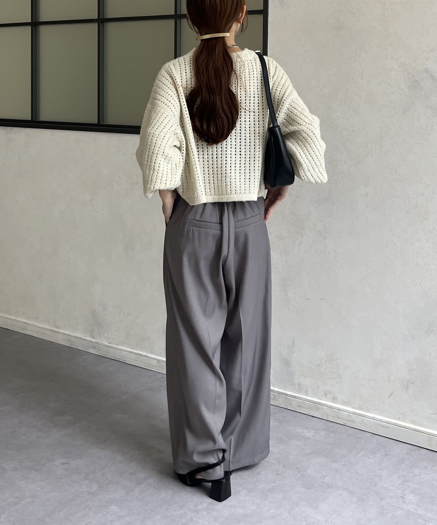コンパクトなニットを合わせて縦ラインを強調した
