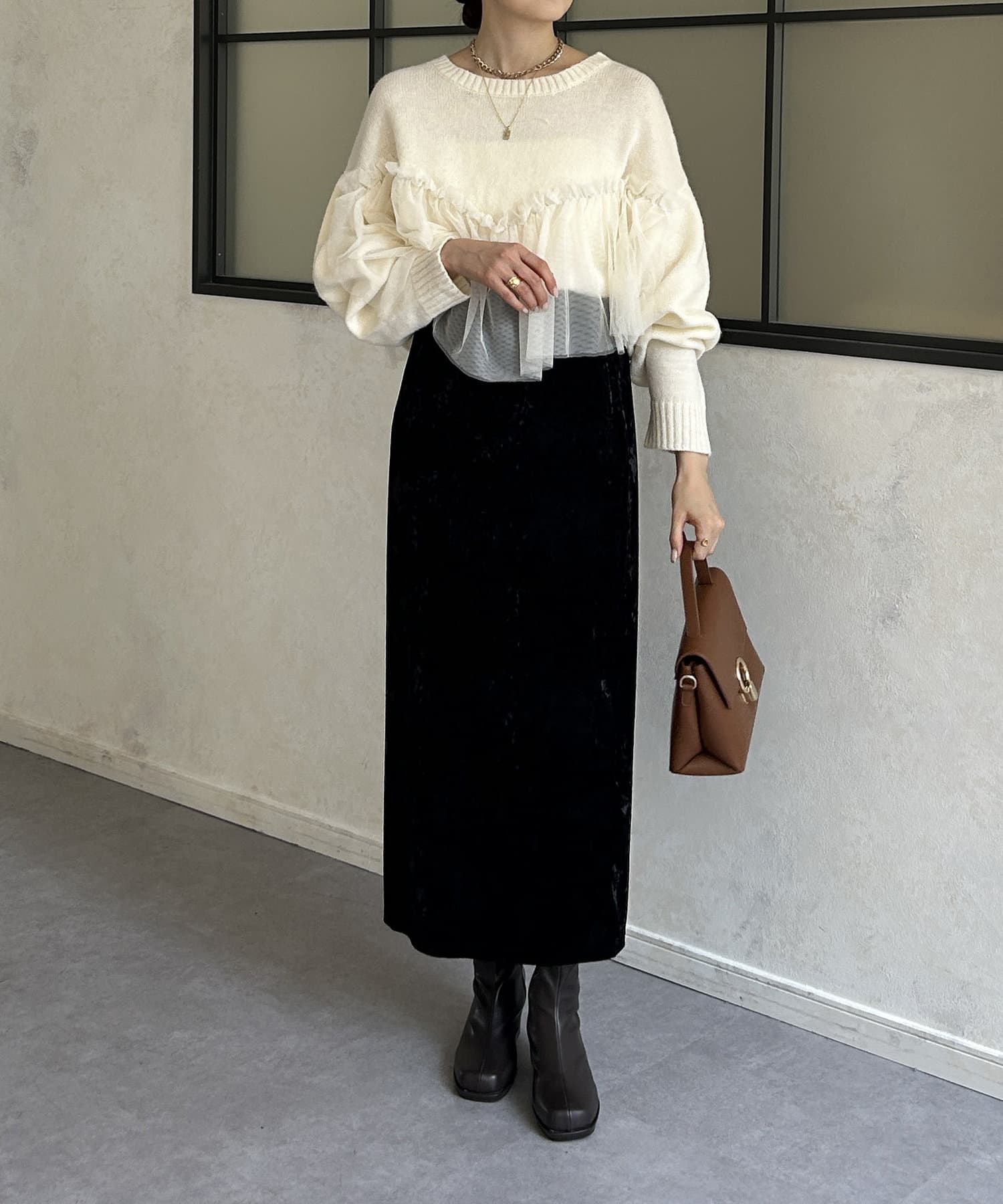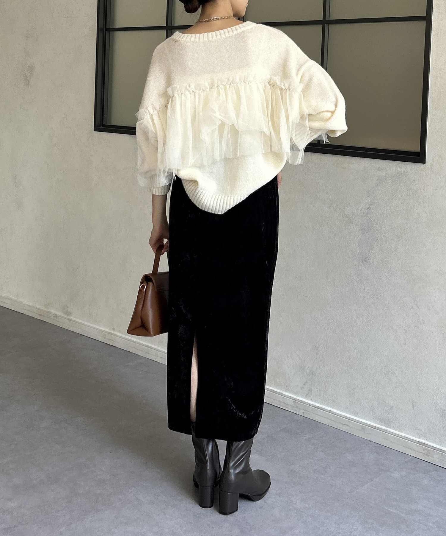 購入場所:パルクローゼット1枚で着てもチクチクせずモチフワな感触。モノトーンなのでチュールが甘過ぎず良い感じです。