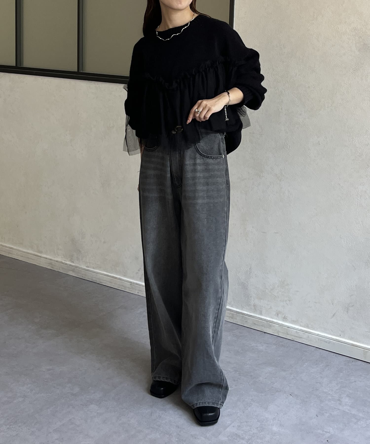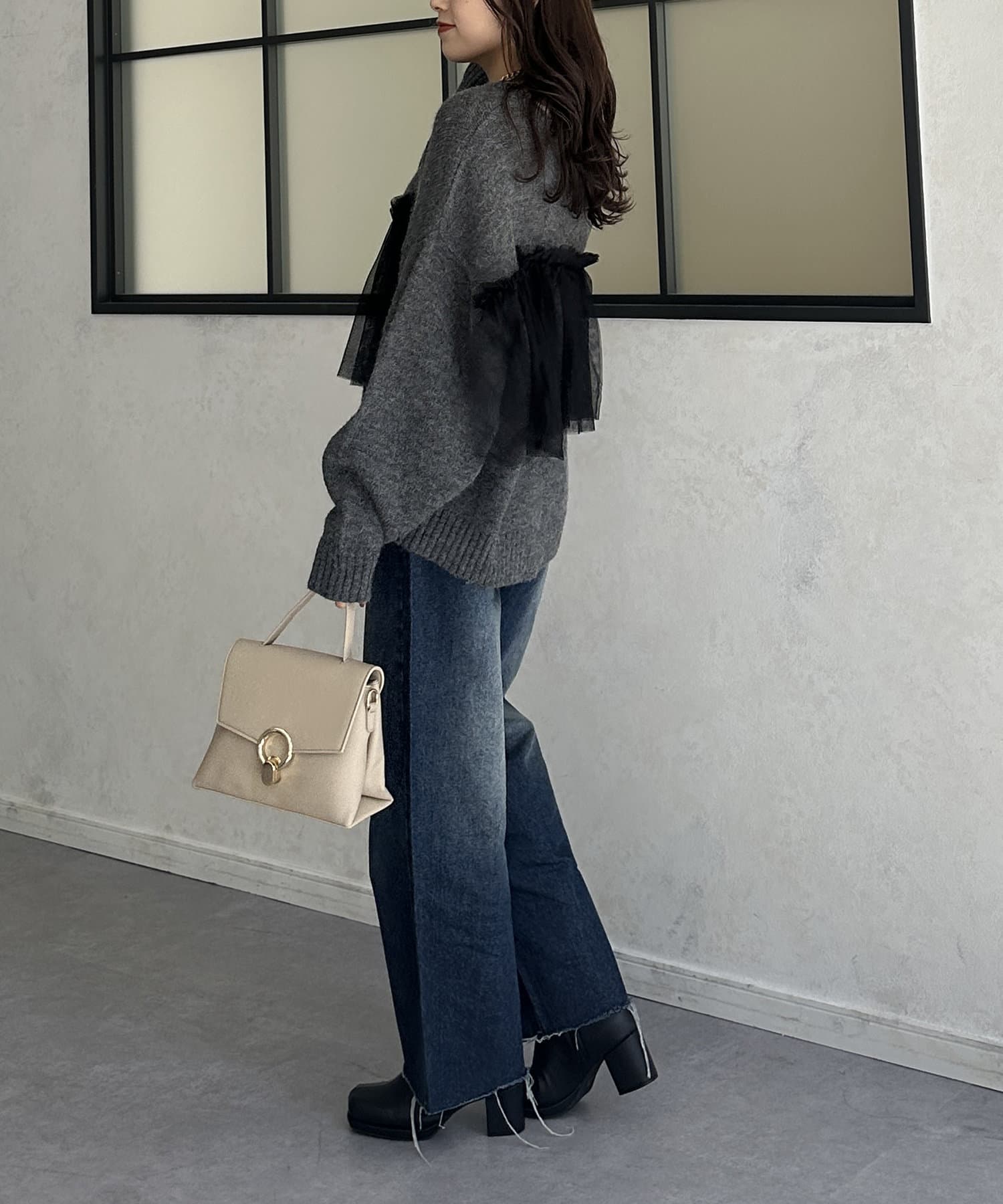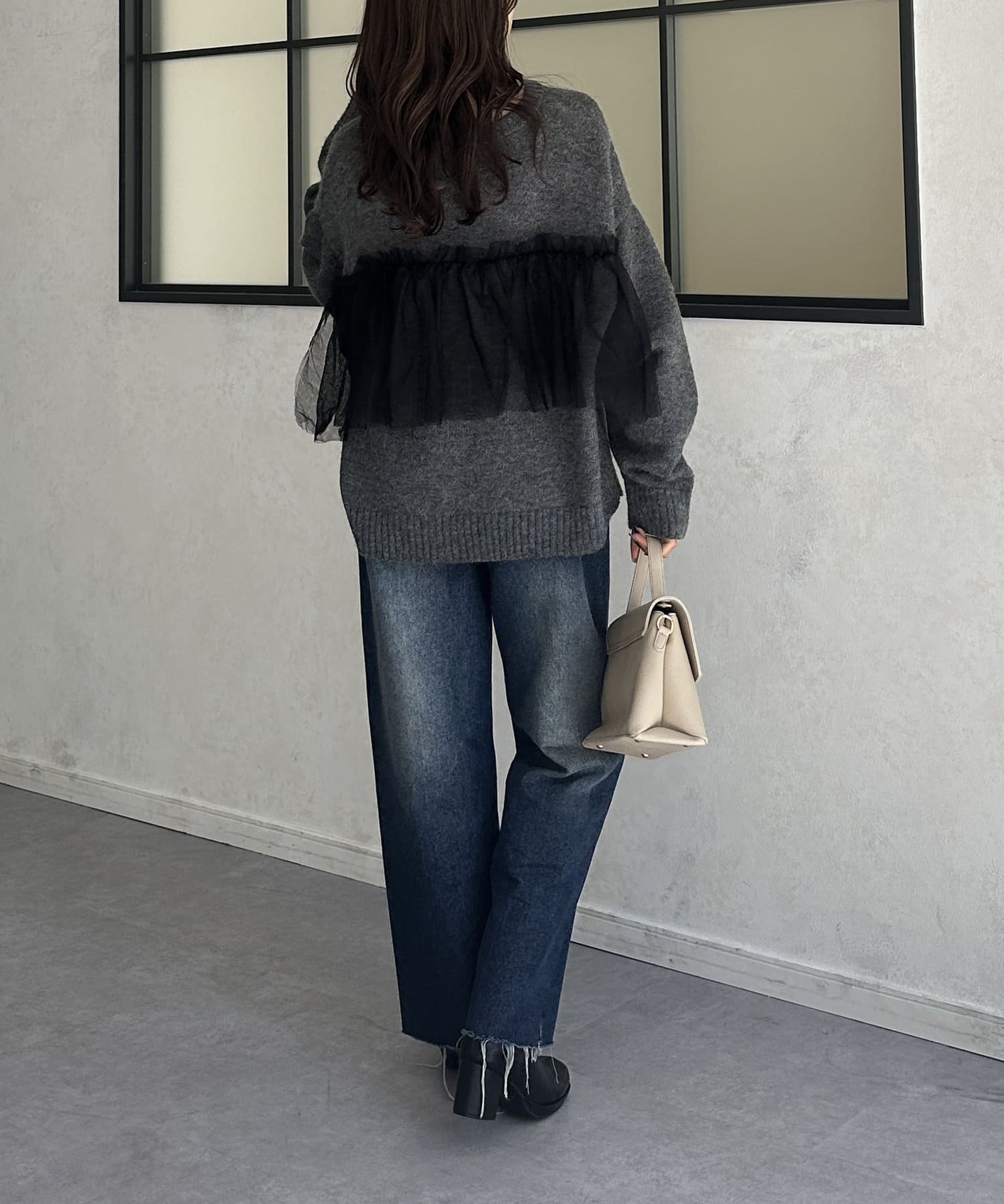 適度の首周り、あったかいけど分厚過ぎずちょうど良く全くチクチクしない生地、チュールのデザインの完璧なバランス。インしてチュールアウトでベルト透けていい感じ!セールでかなりお得に買えてラッキーでした!