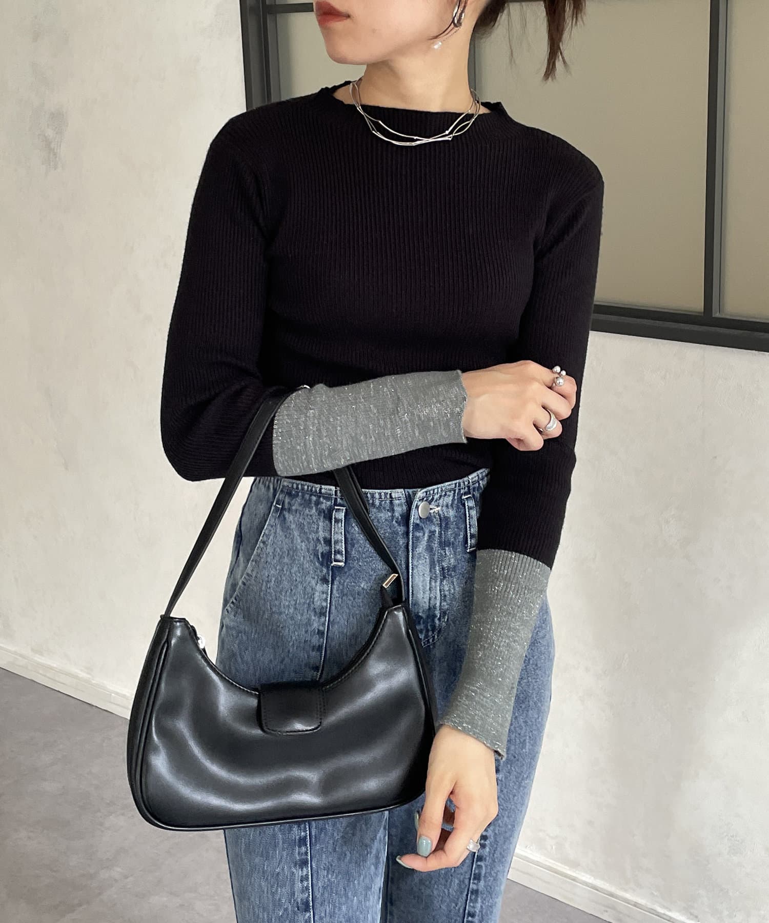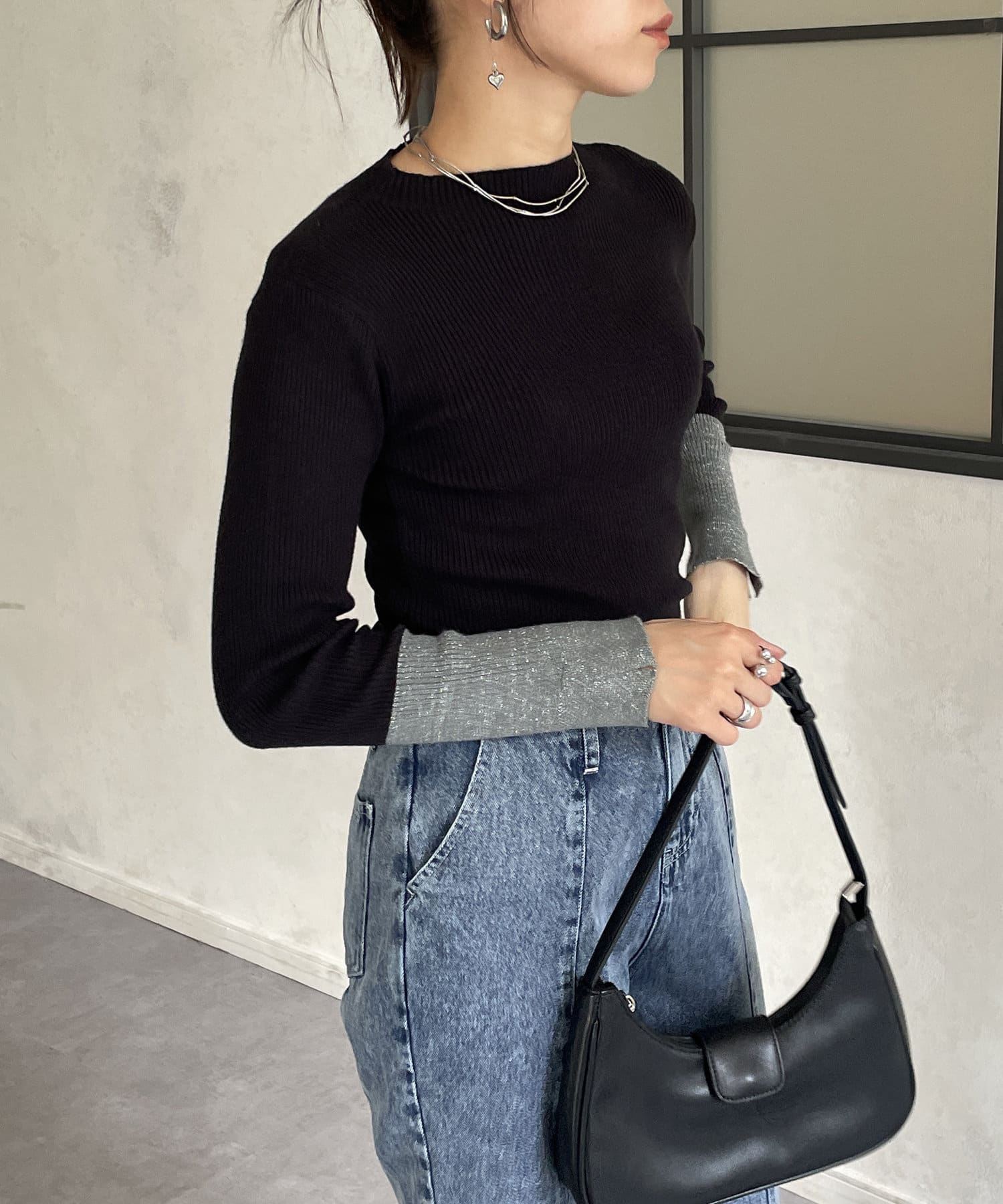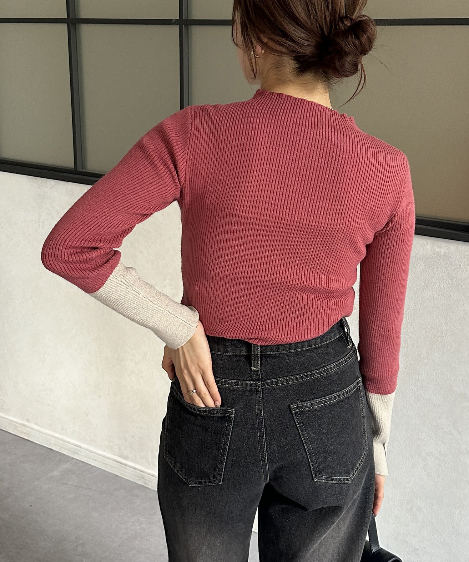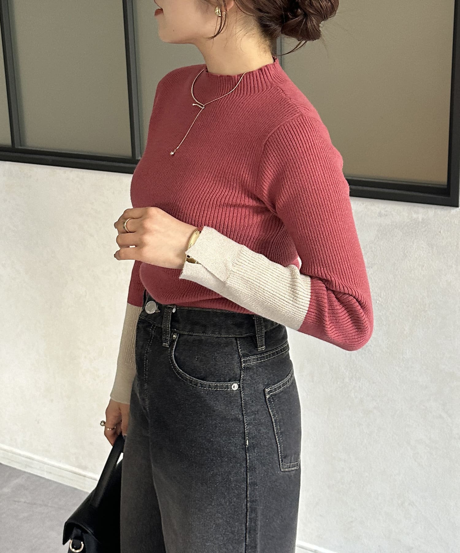 ・袖の配色デザインがポイントのニットなので、