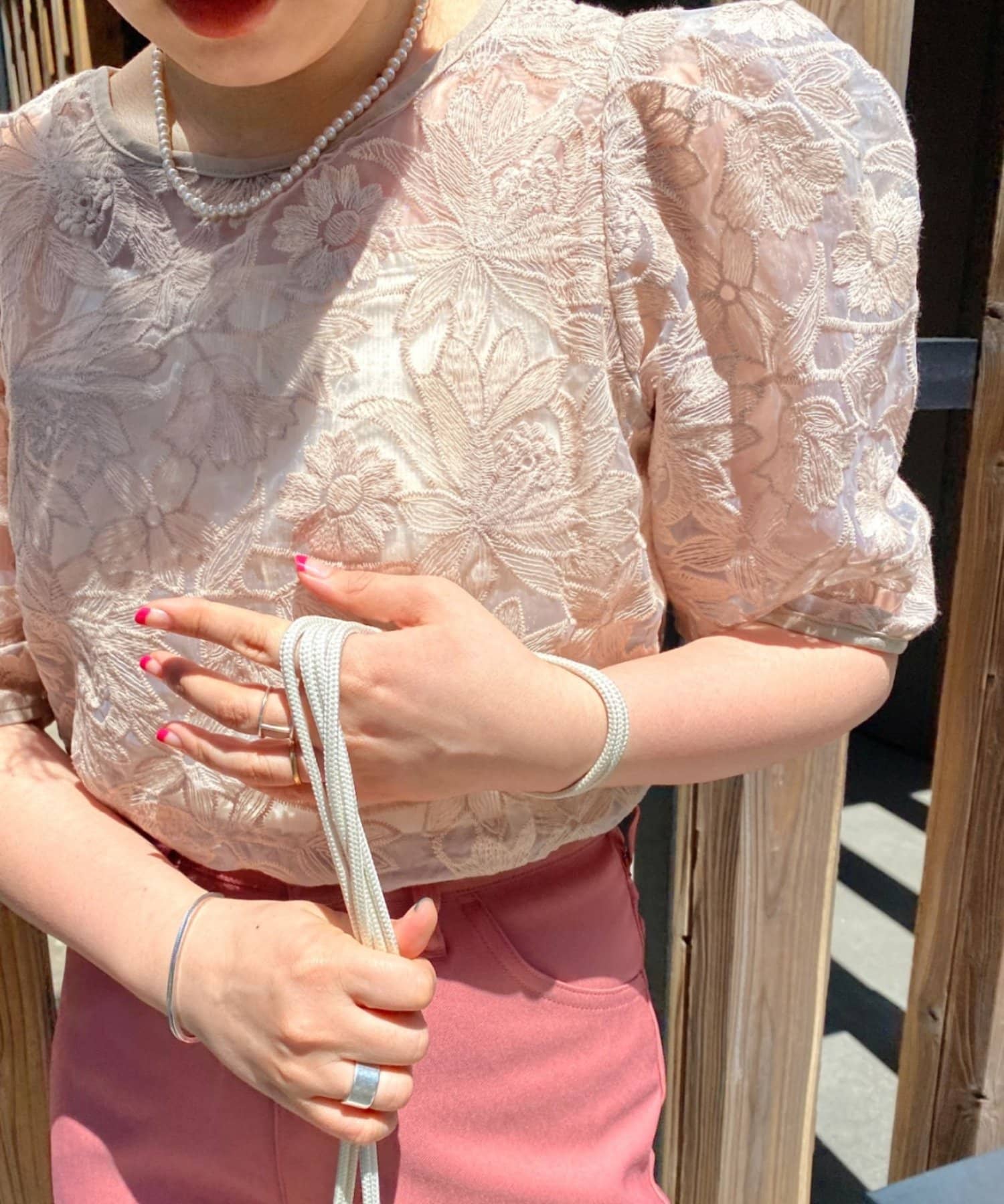 大きめの花柄レースデザインが目を惹くアイテム。
