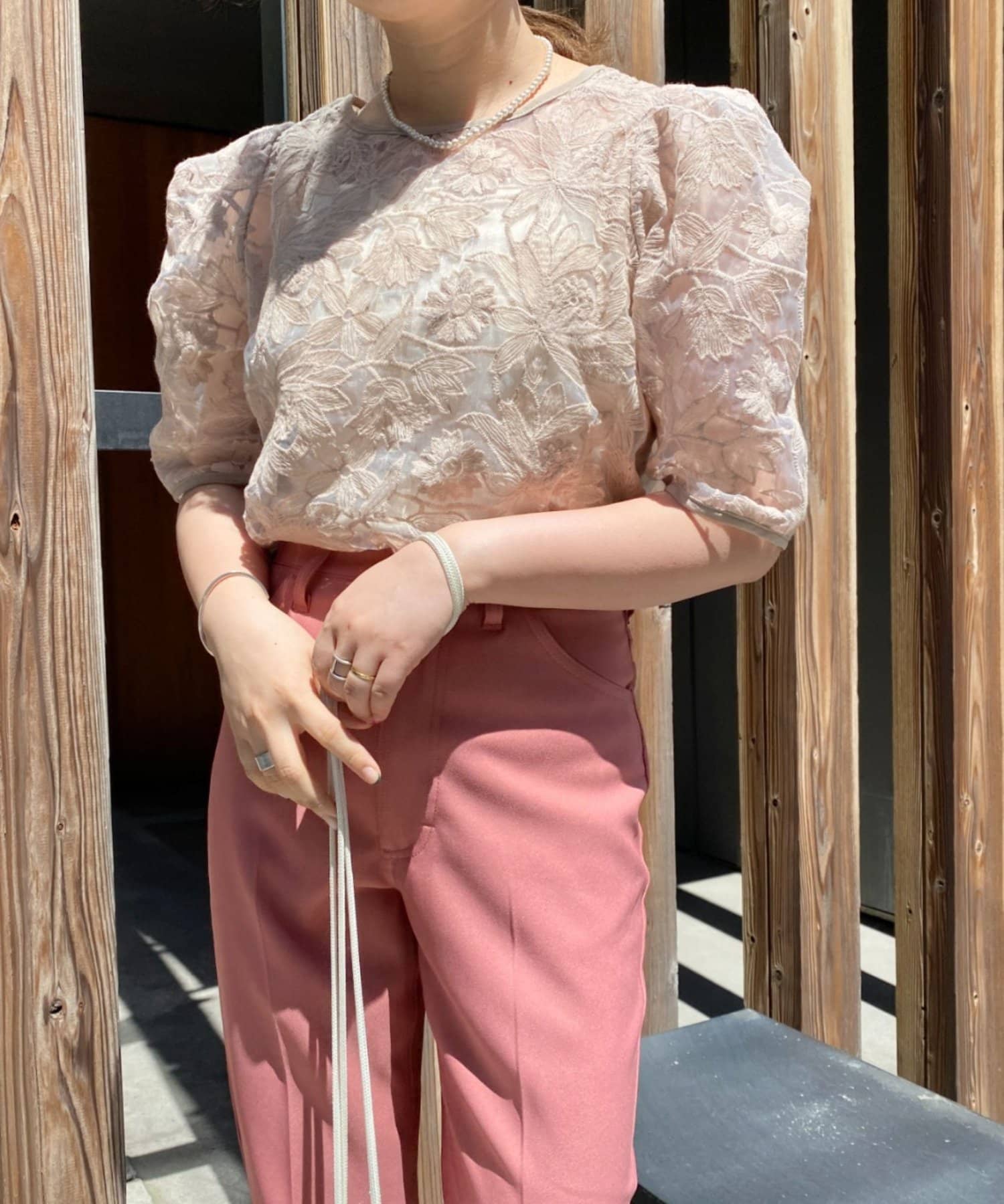 ノースリーブのトップスやワンピースに羽織るのがおすすめ。