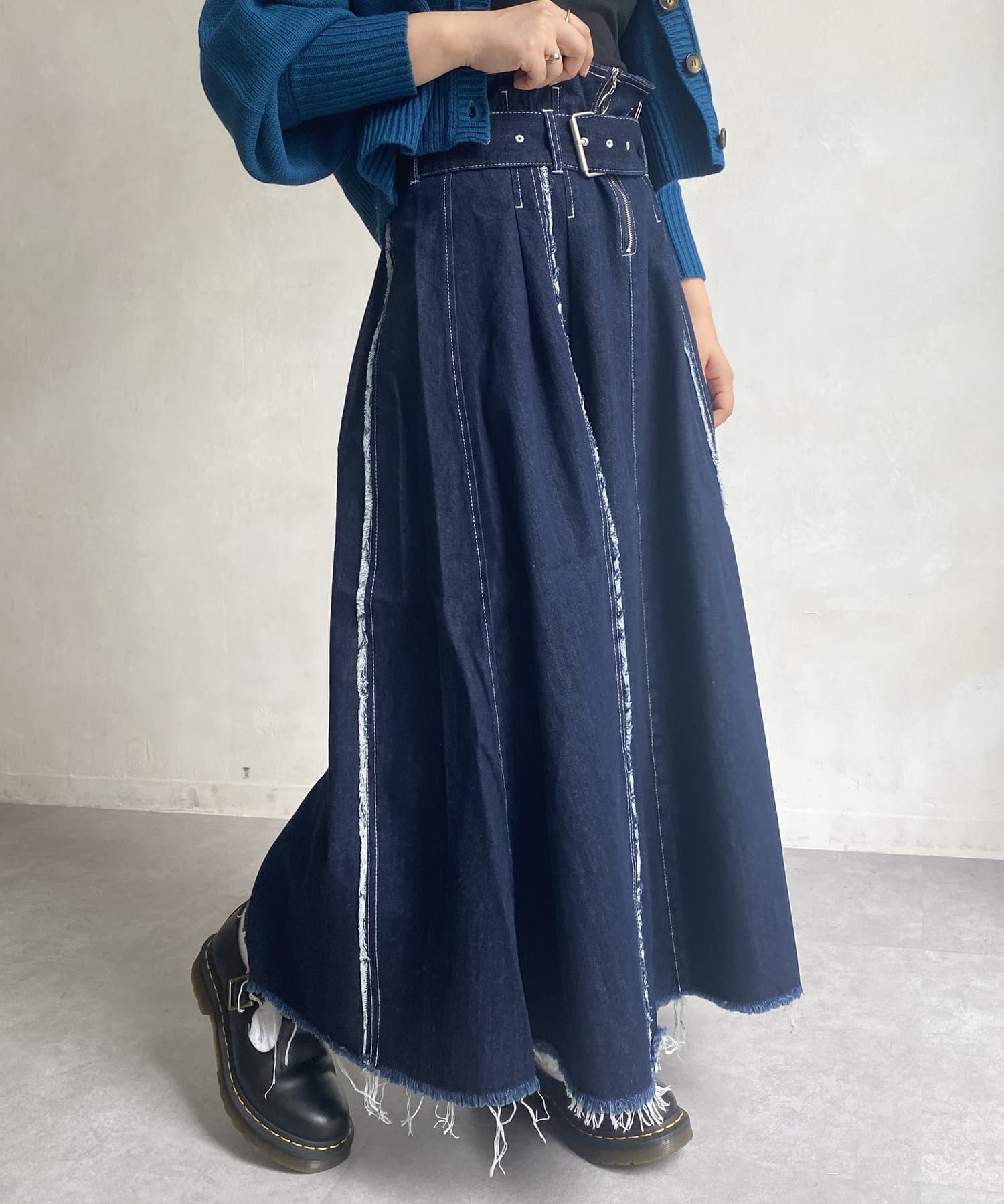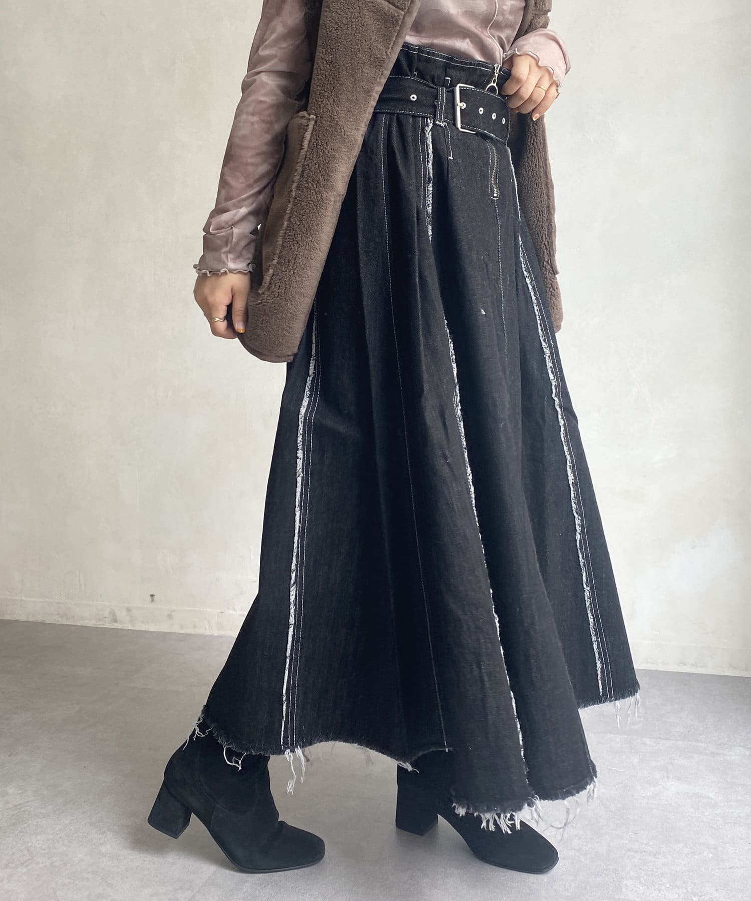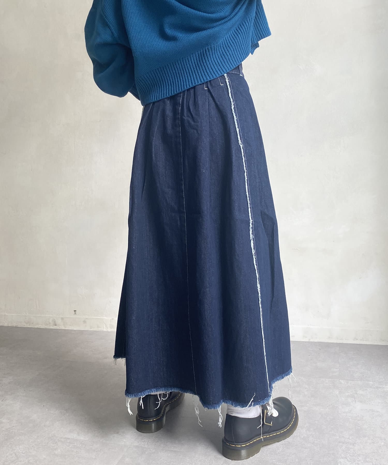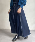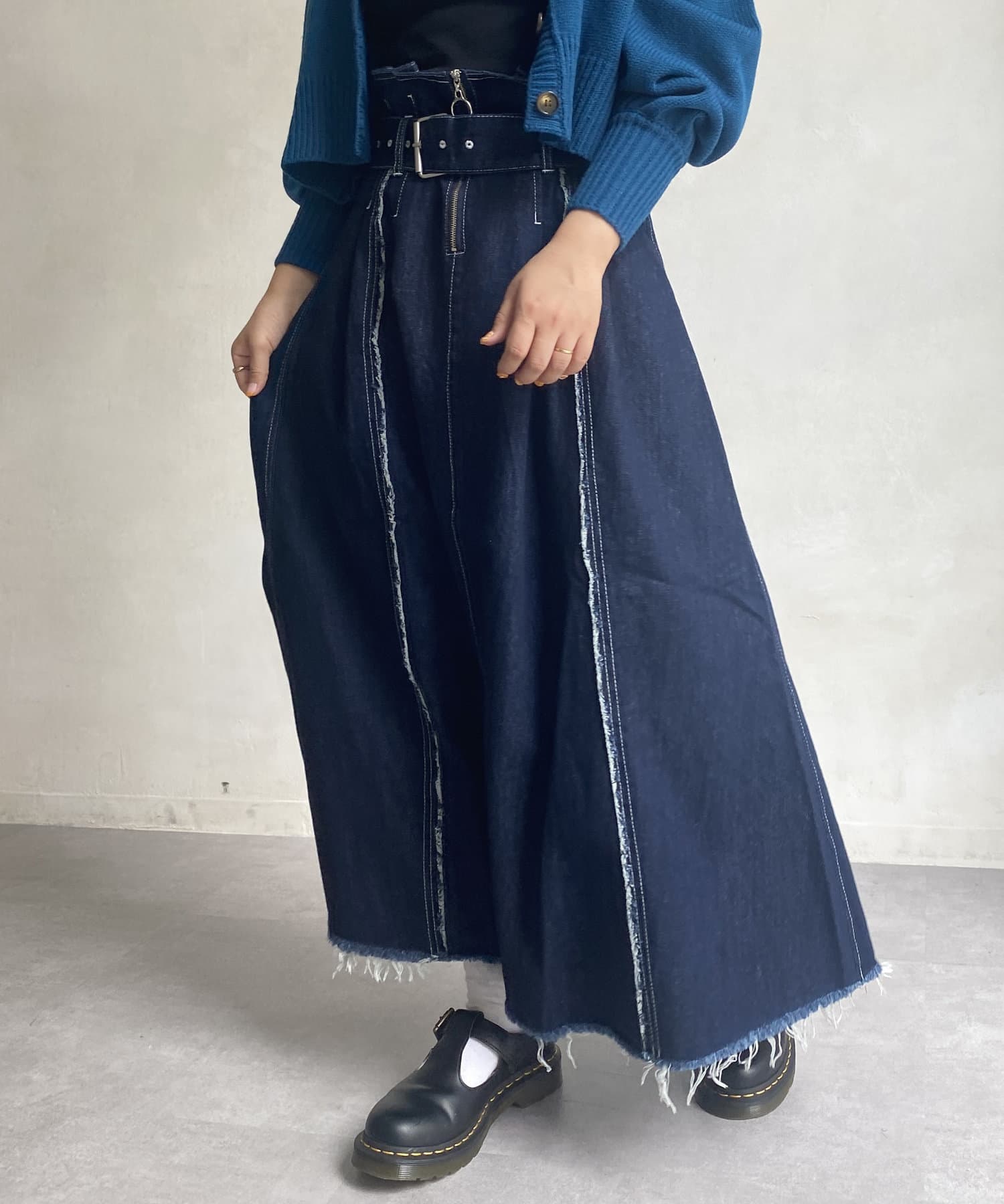 フリンジステッチがアクセントになり、縦ラインを強調しスタイルアップが叶います。