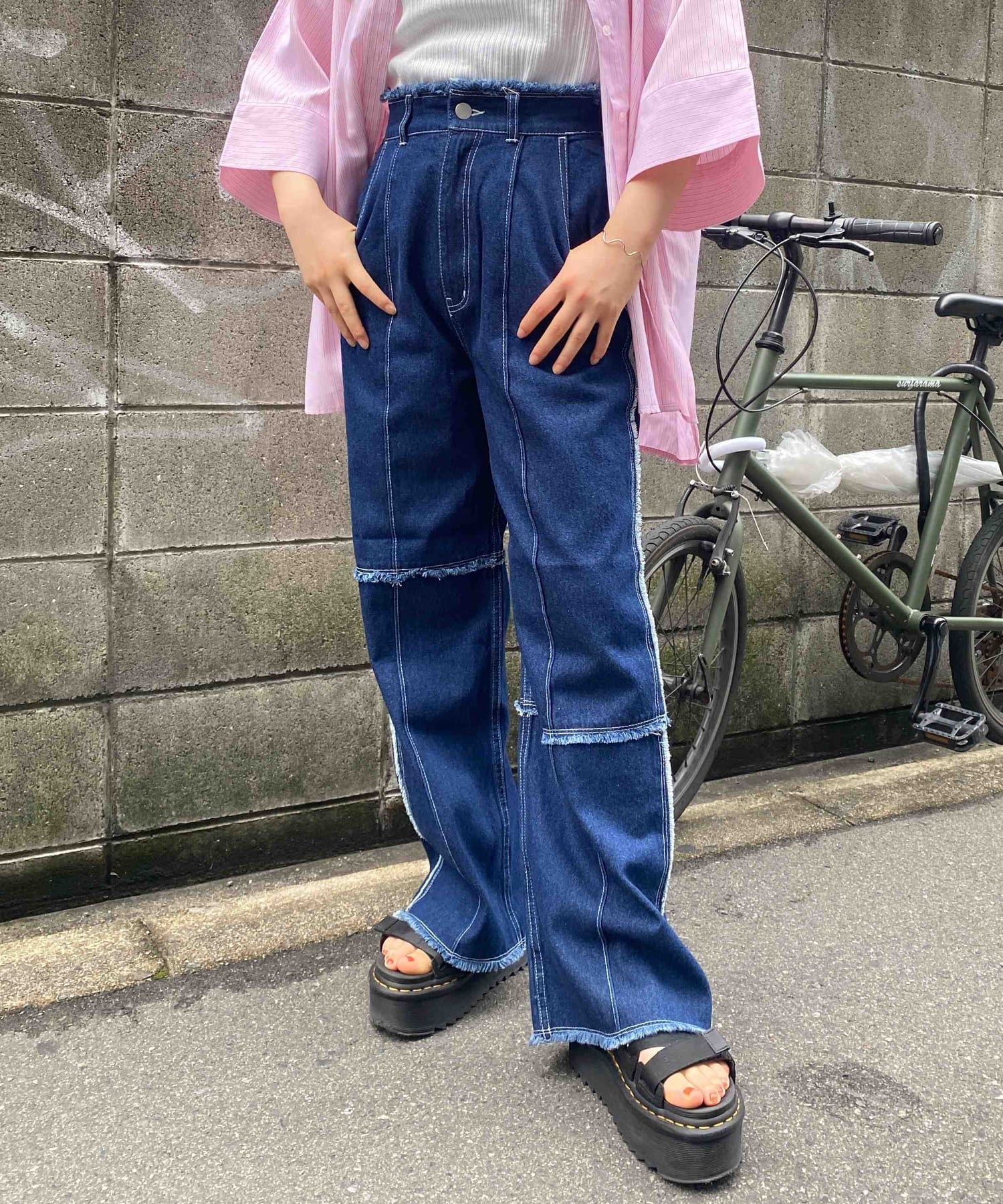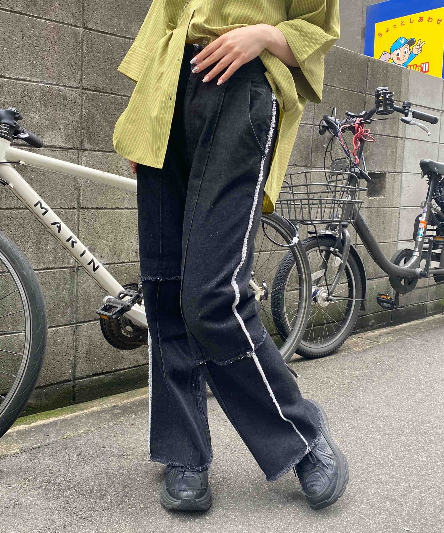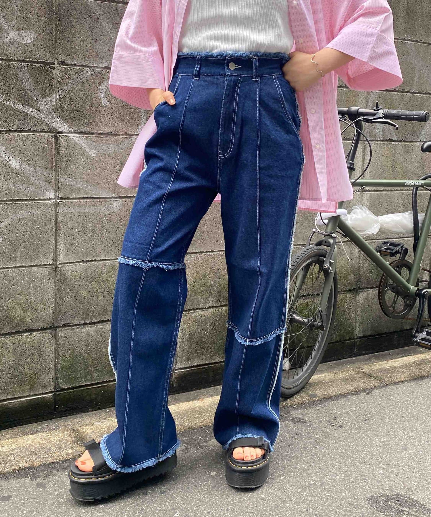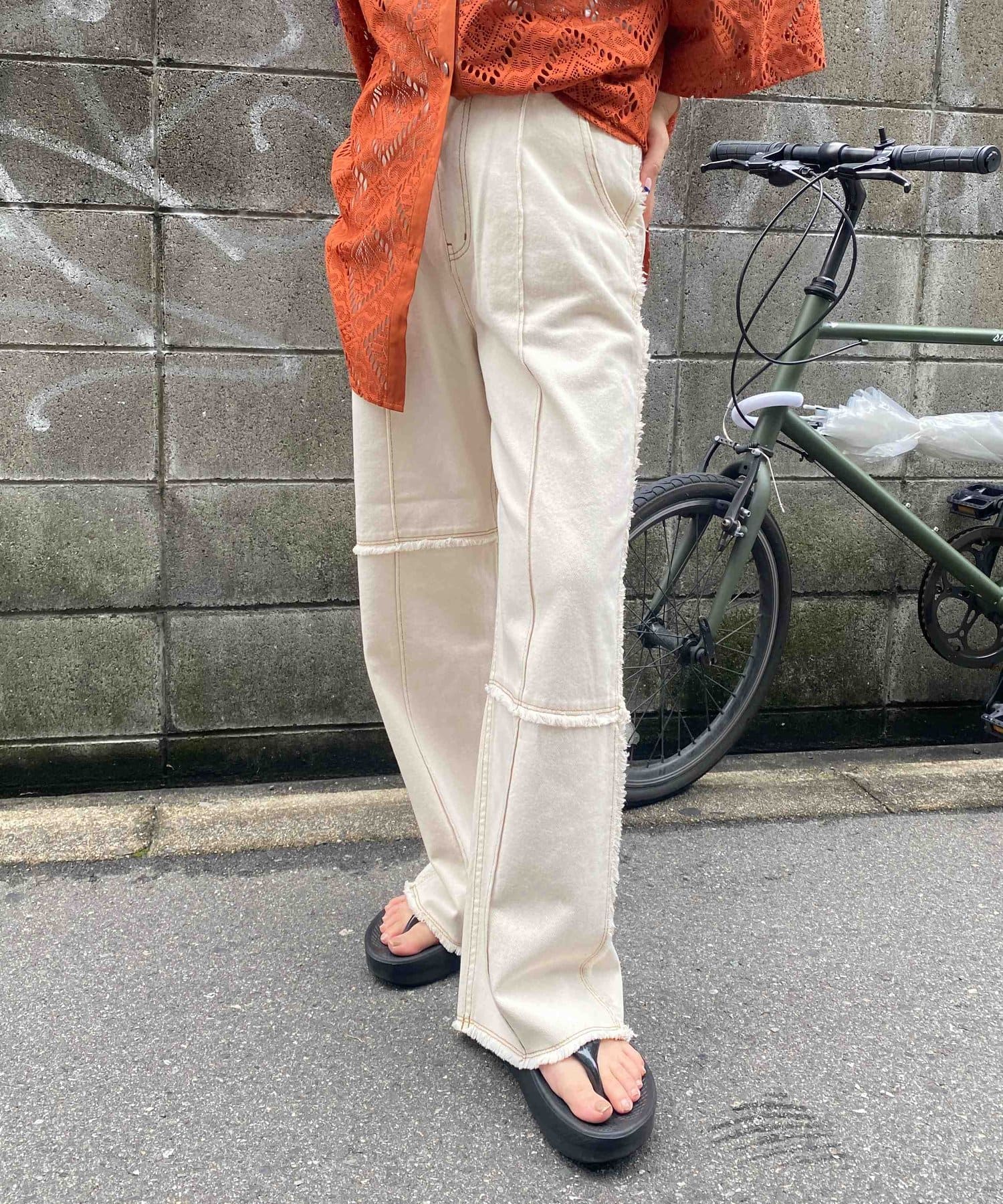 生地をつなぎ合わせたデザインで切りっぱなし感が可愛らしいツイルパンツ。