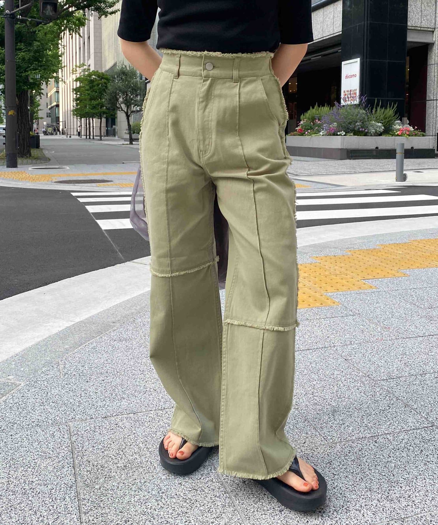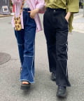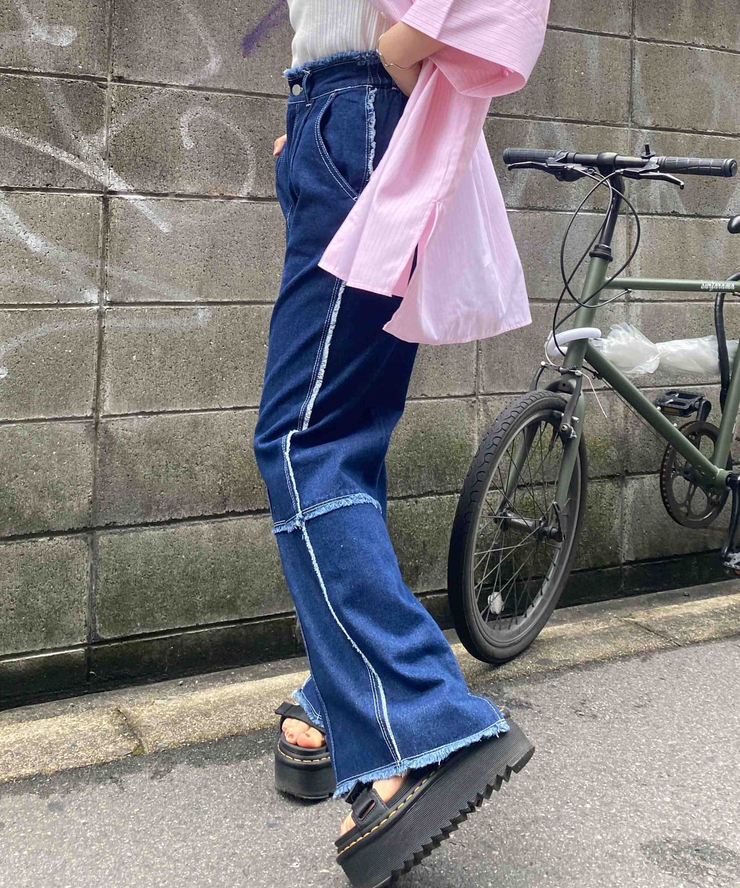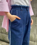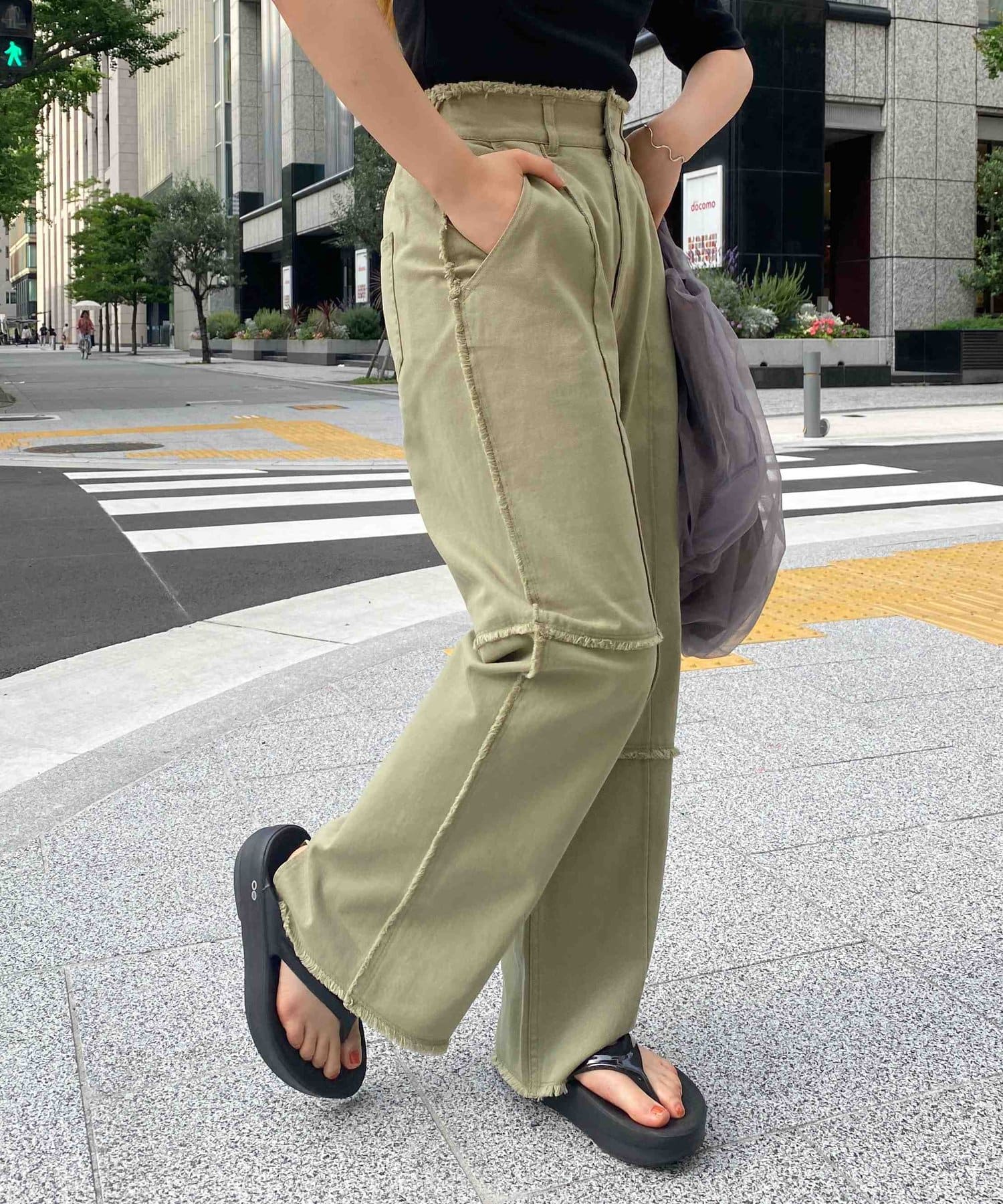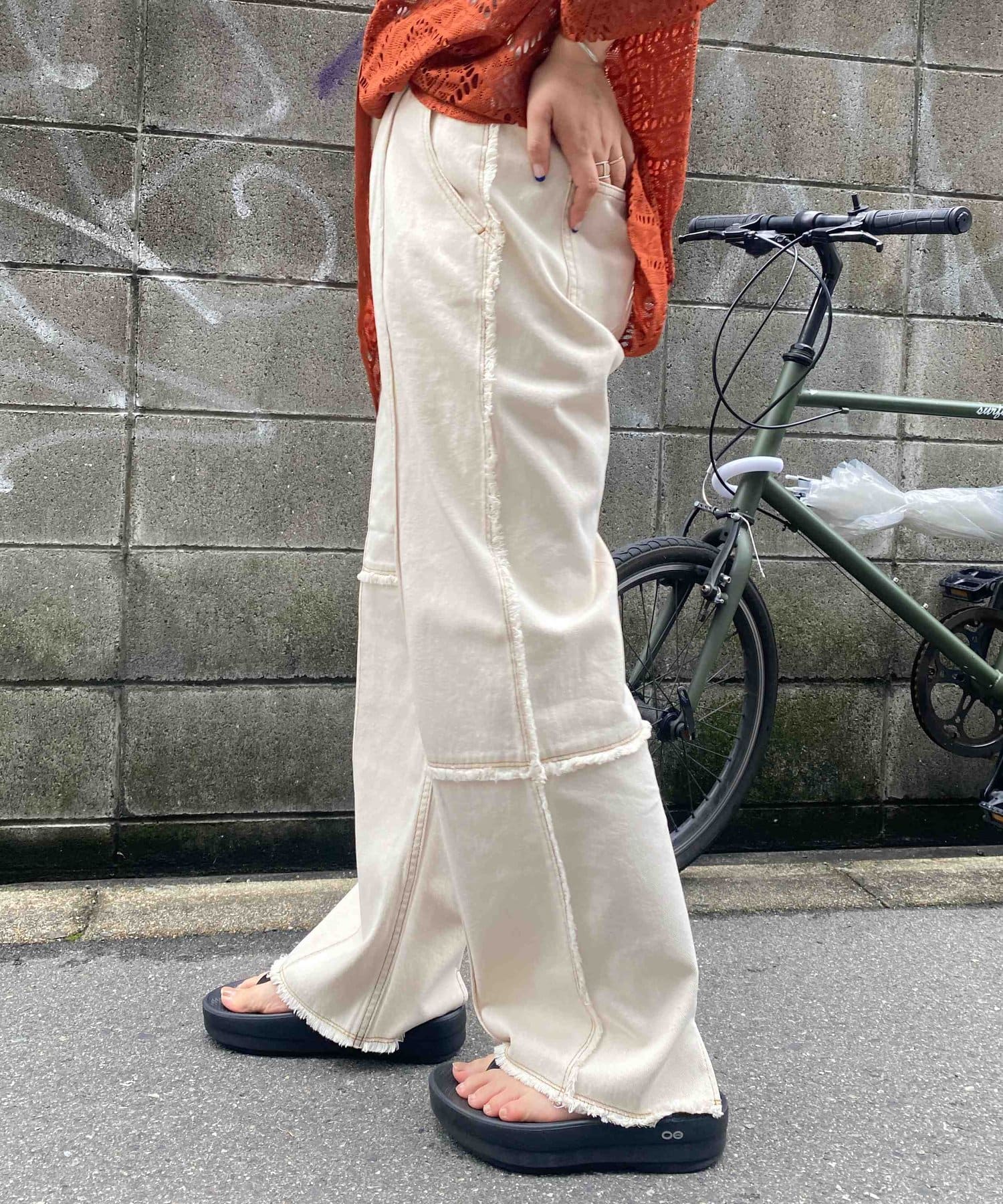 生地をつなぎ合わせたデザインで切りっぱなし感が可愛らしいツイルパンツ。