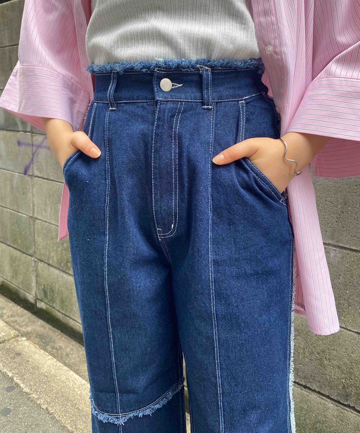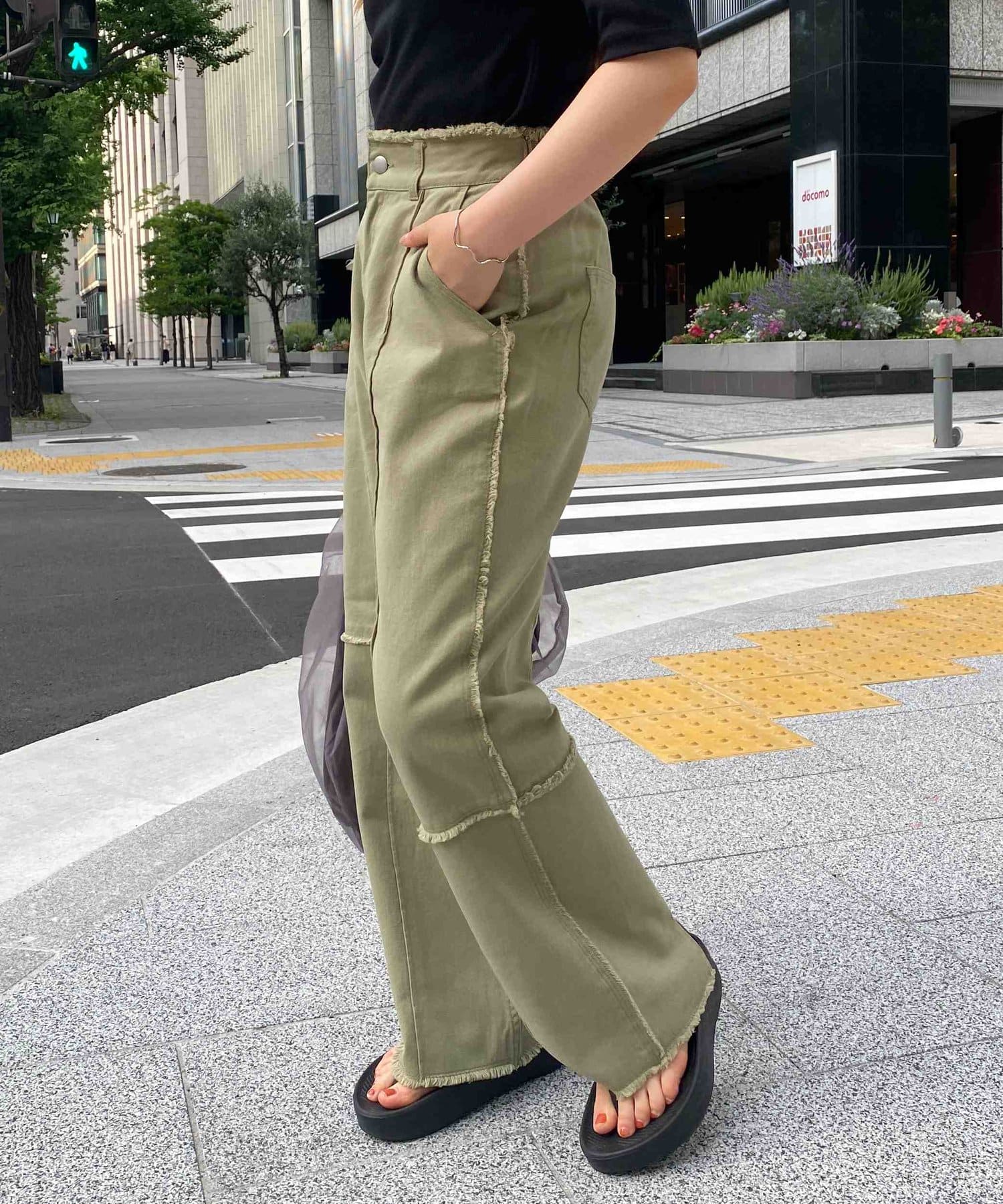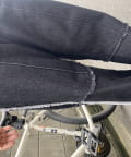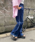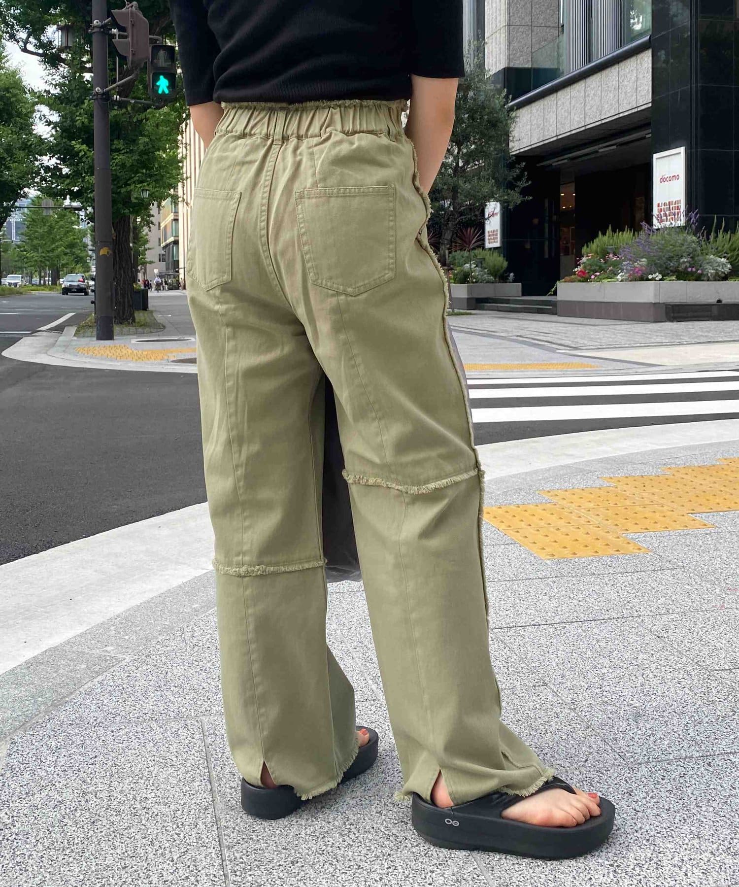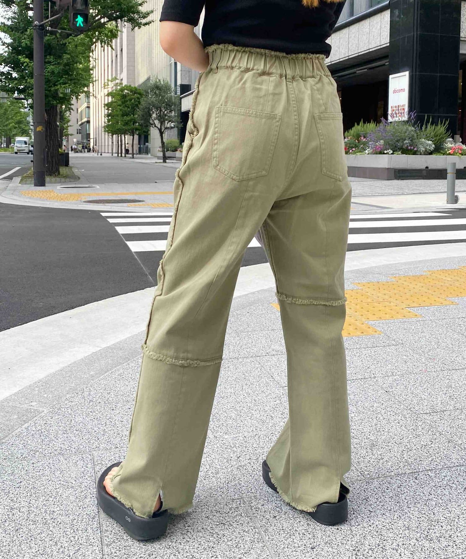生地をつなぎ合わせたデザインで切りっぱなし感が可愛らしいツイルパンツ。