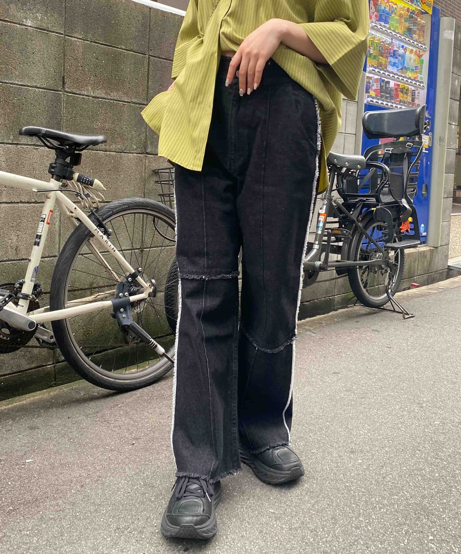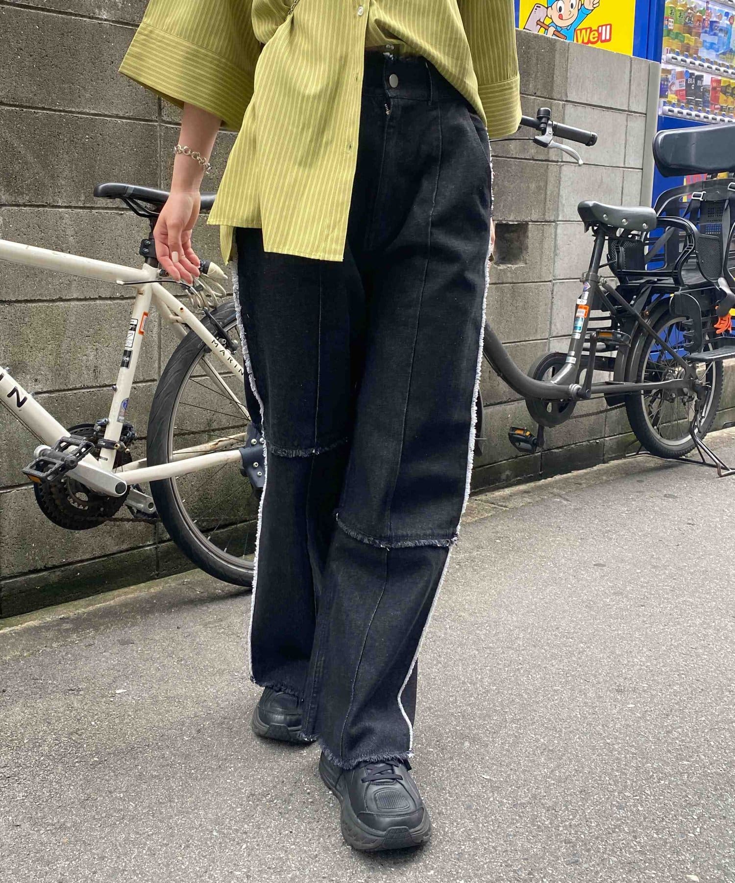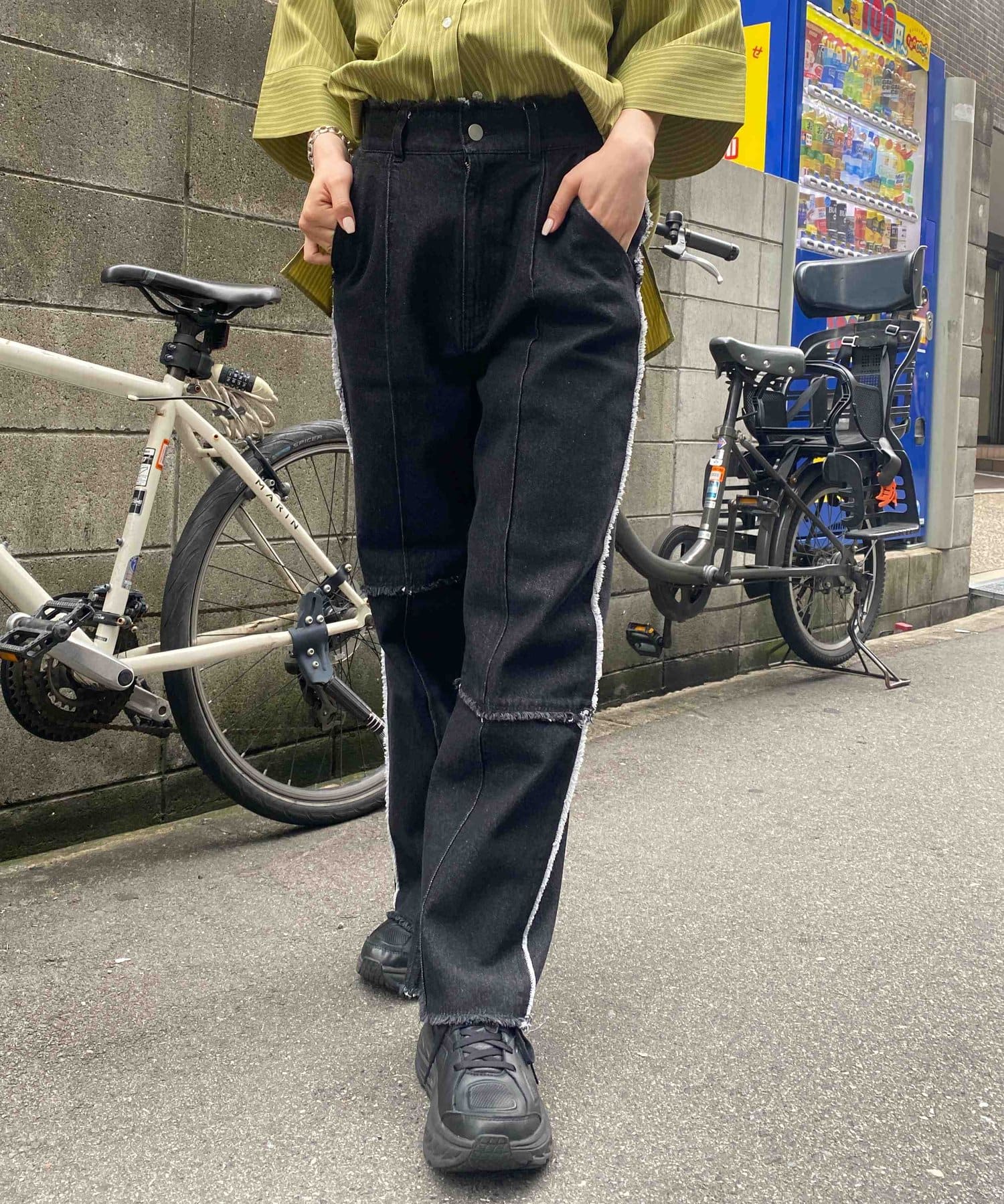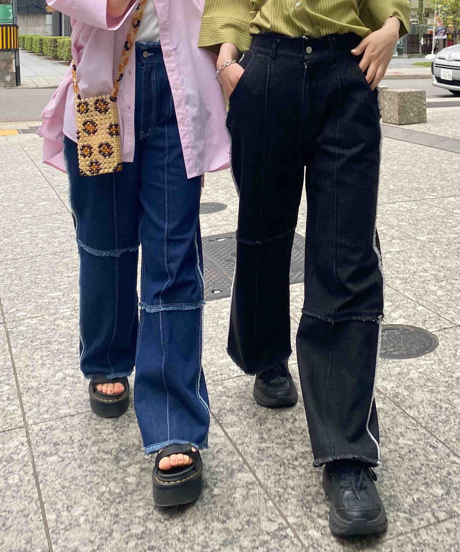 生地をつなぎ合わせたデザインで切りっぱなし感が可愛らしいツイルパンツ。