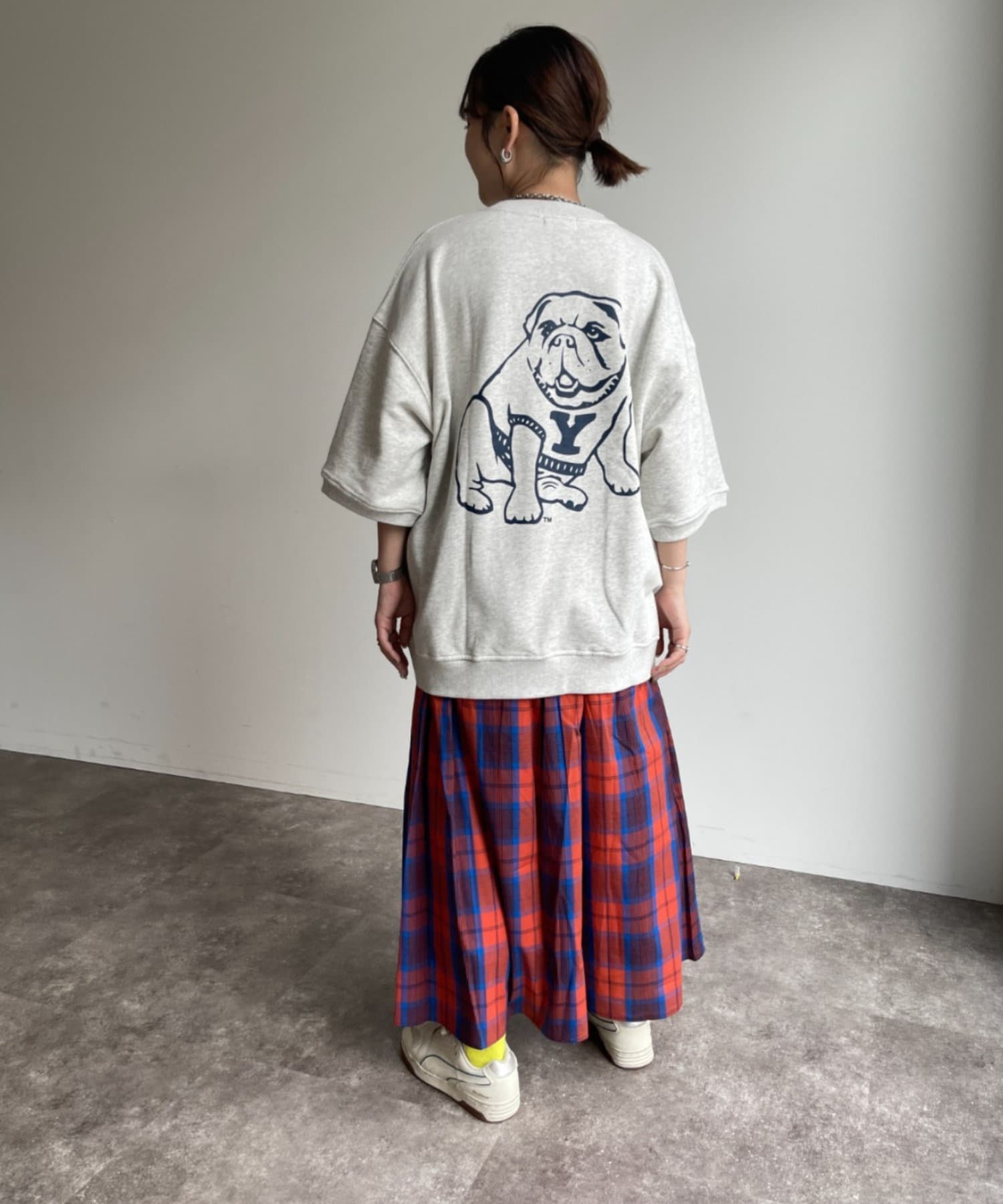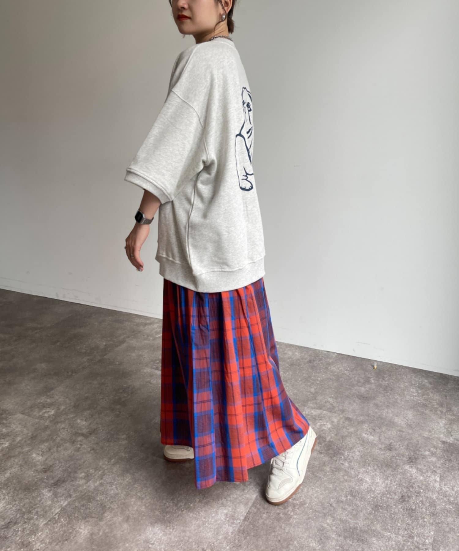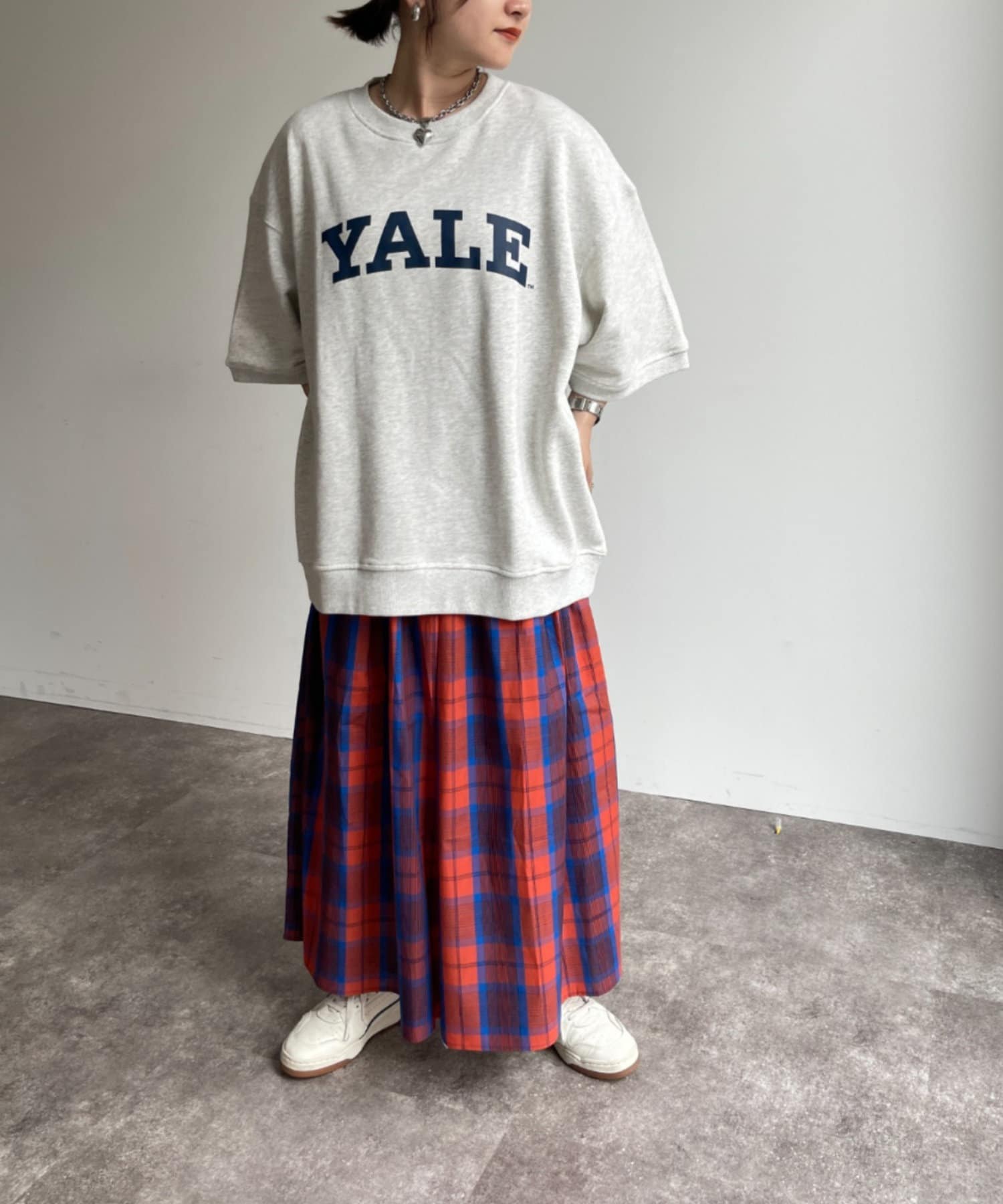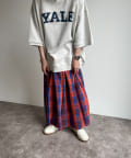 ダークマドラスの生地を採用し、晩夏~秋口に映えるカラーリングが特徴です。。軽い素材で季節問わず使いやすいアイテムで、Tシャツやスウェットなどのカジュアルなアイテムとのミックスコーデがおすすめです。ブラウスにバレエシューズと合わせてフェミニンなスタイリングも楽しめるので、幅広いコーディネートが楽しめます。