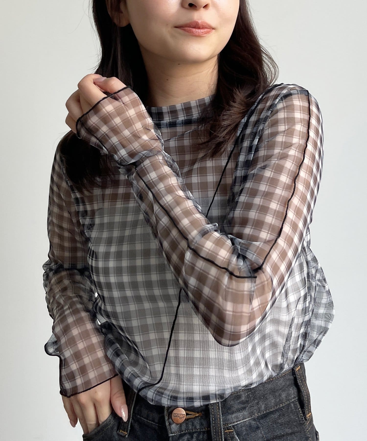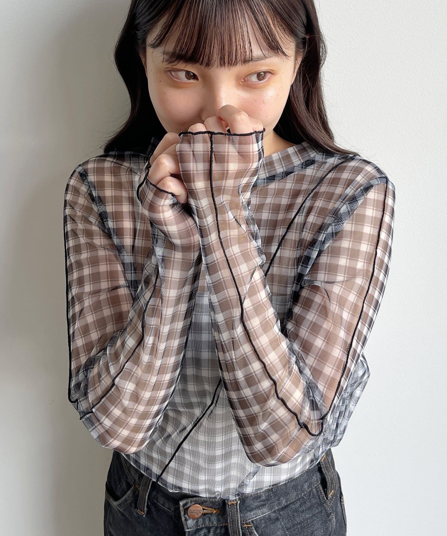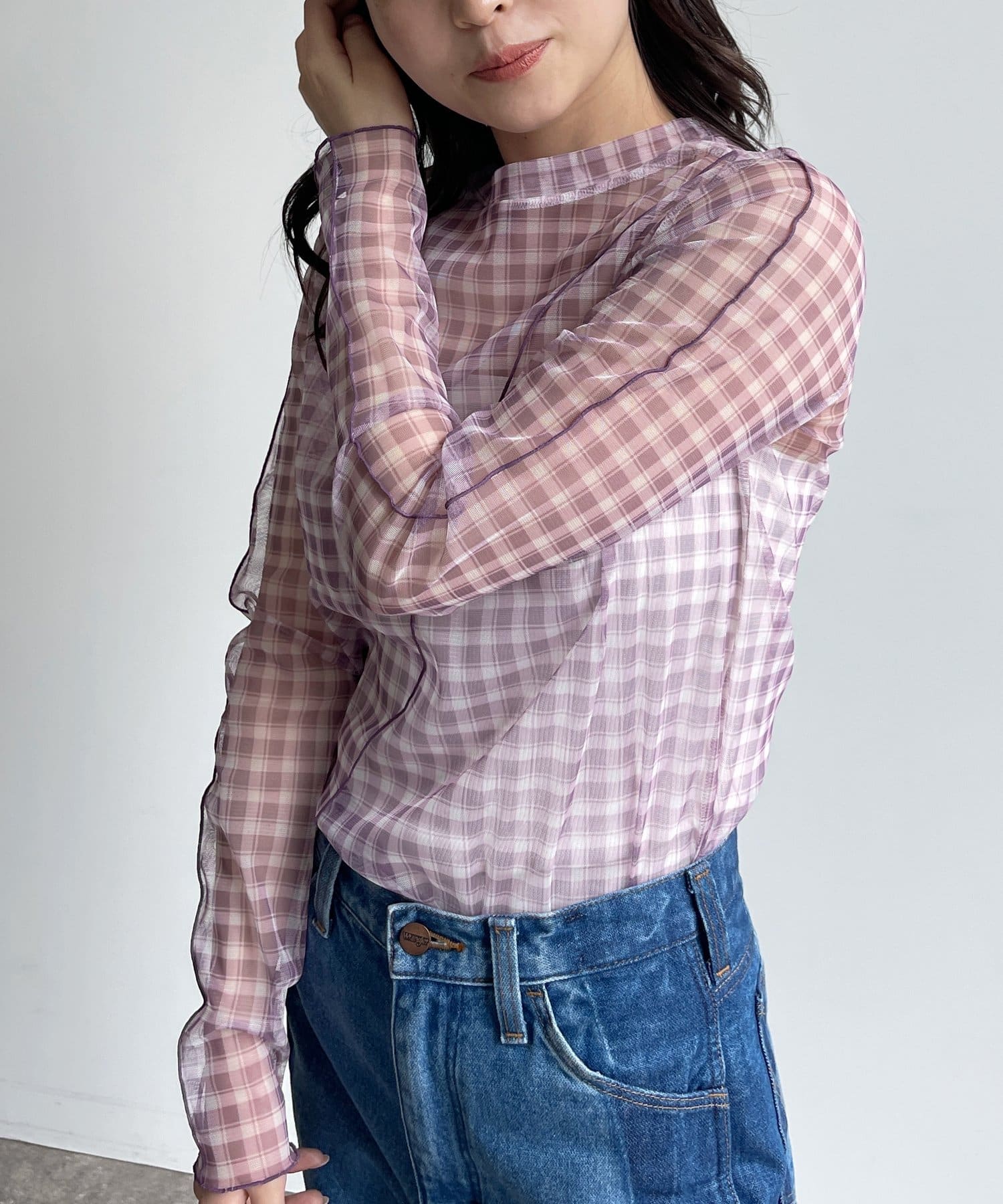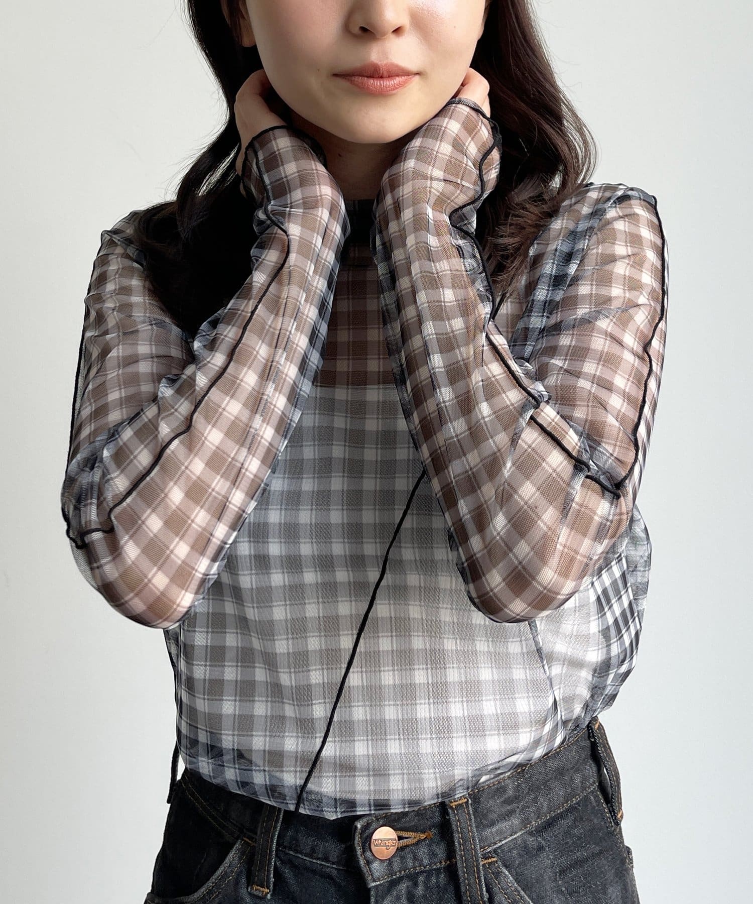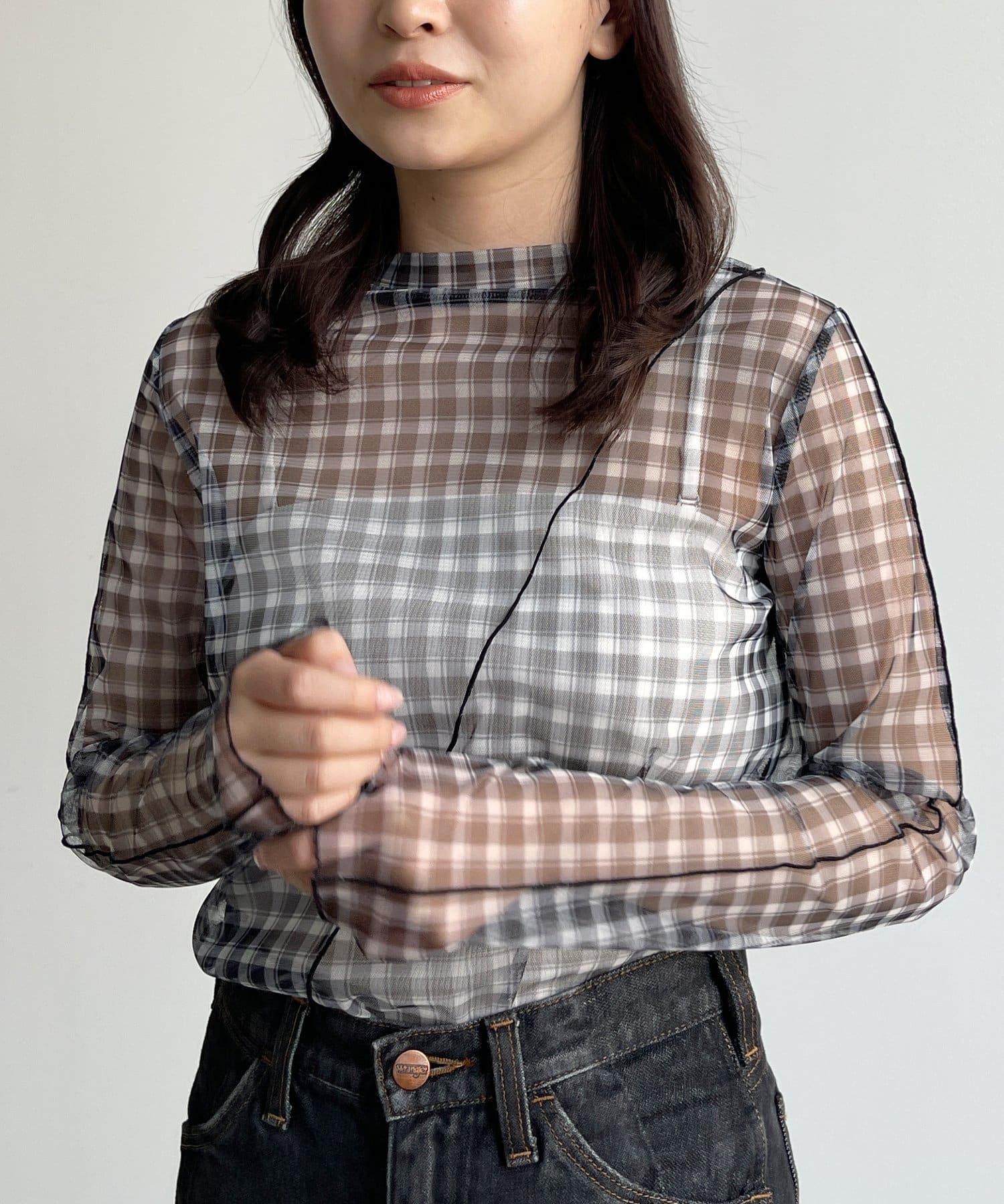 花柄やチェック柄といった柄物のインナーはめずらしいのではないでしょうか?柄があることで主役にも、脇役にもなれる1枚。何に合わせても◎です。ぴたっとしていて伸縮性はそこまで高くないですが、肌をキレイに見せてくれるカラーリングなので着やすいですよ!