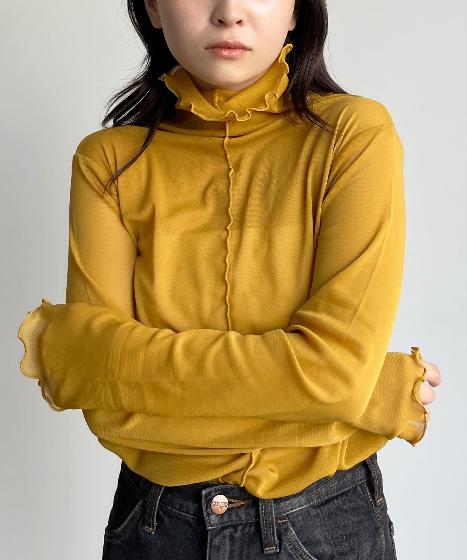 程よく体のラインに沿うシルエットがすっきりとした印象のメロータートル。インナーとして重ね着が楽しめたり、1枚での着用でも表情が出るメローデザインがかわいいデザインです。首元や袖口に施したメロー始末が、女性らしさを演出します。合わせるボトムスを選ばず、またサロペットやキャミワンピースのインナー使いにもピッタリなので、幅広いコーディネートでご活躍頂けるアイテムです♪