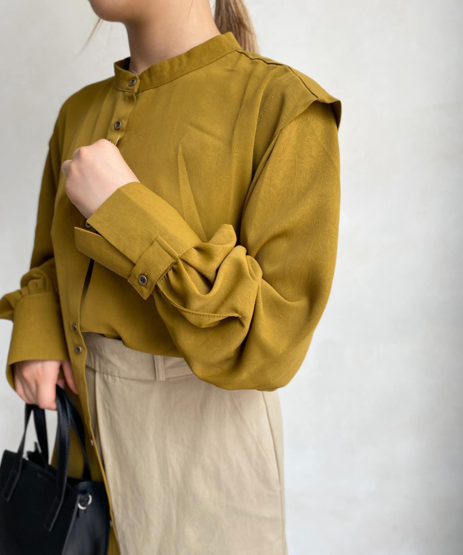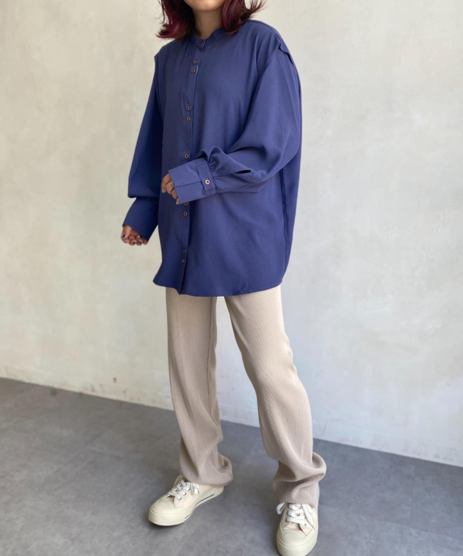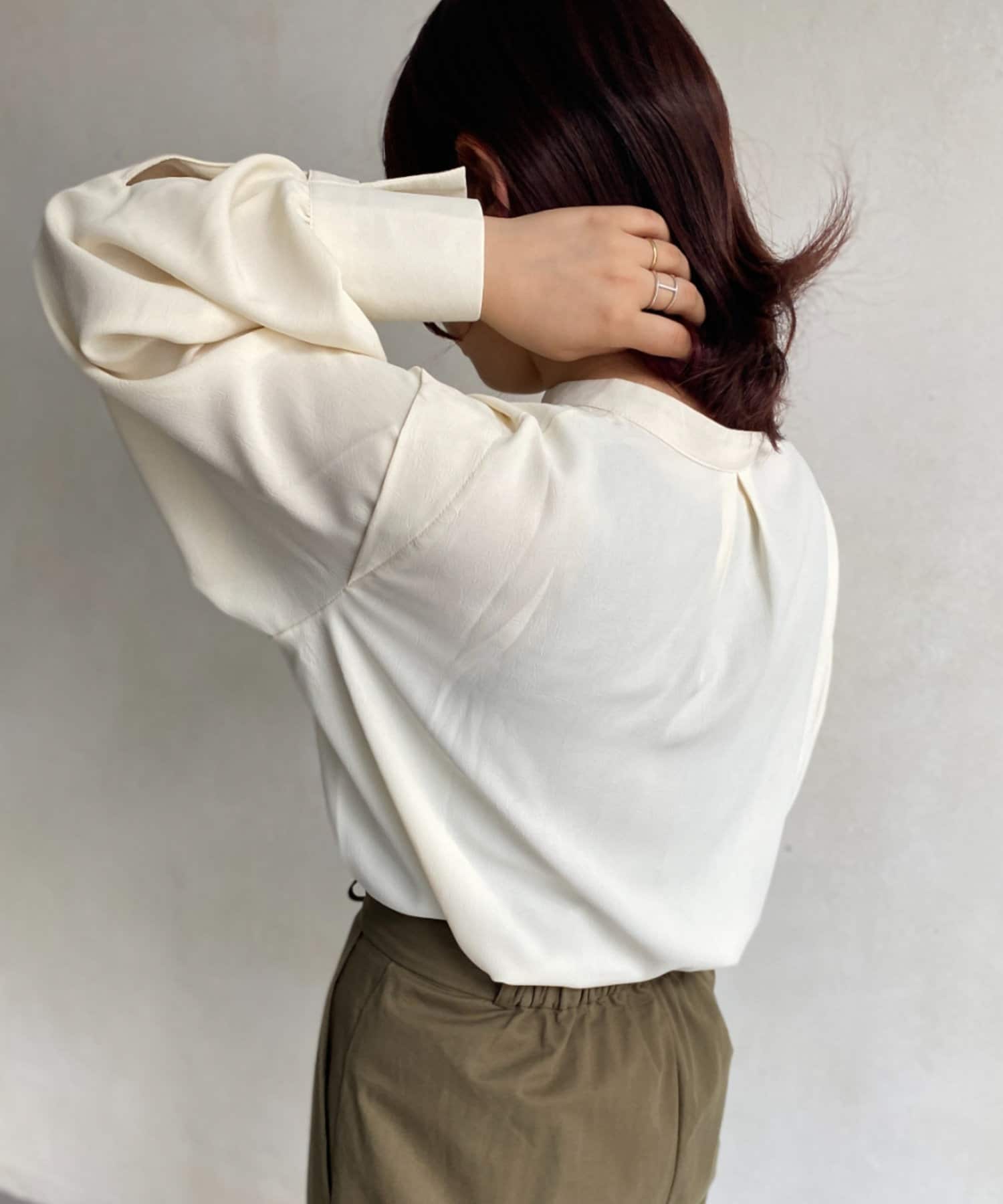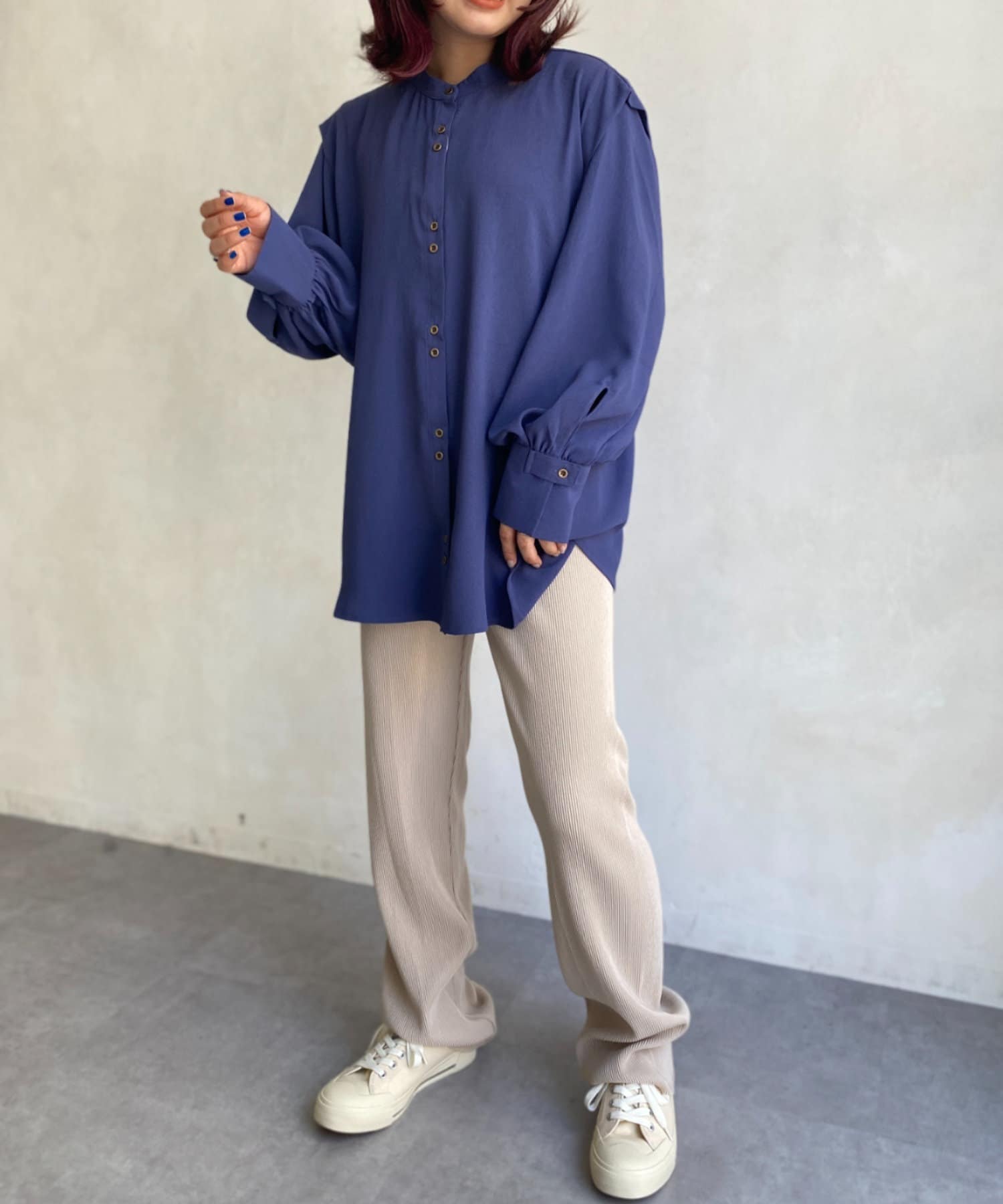 襟元は甘くなりすぎないバンドカラーなので、パンツスタイルにもピッタリな1枚です◎