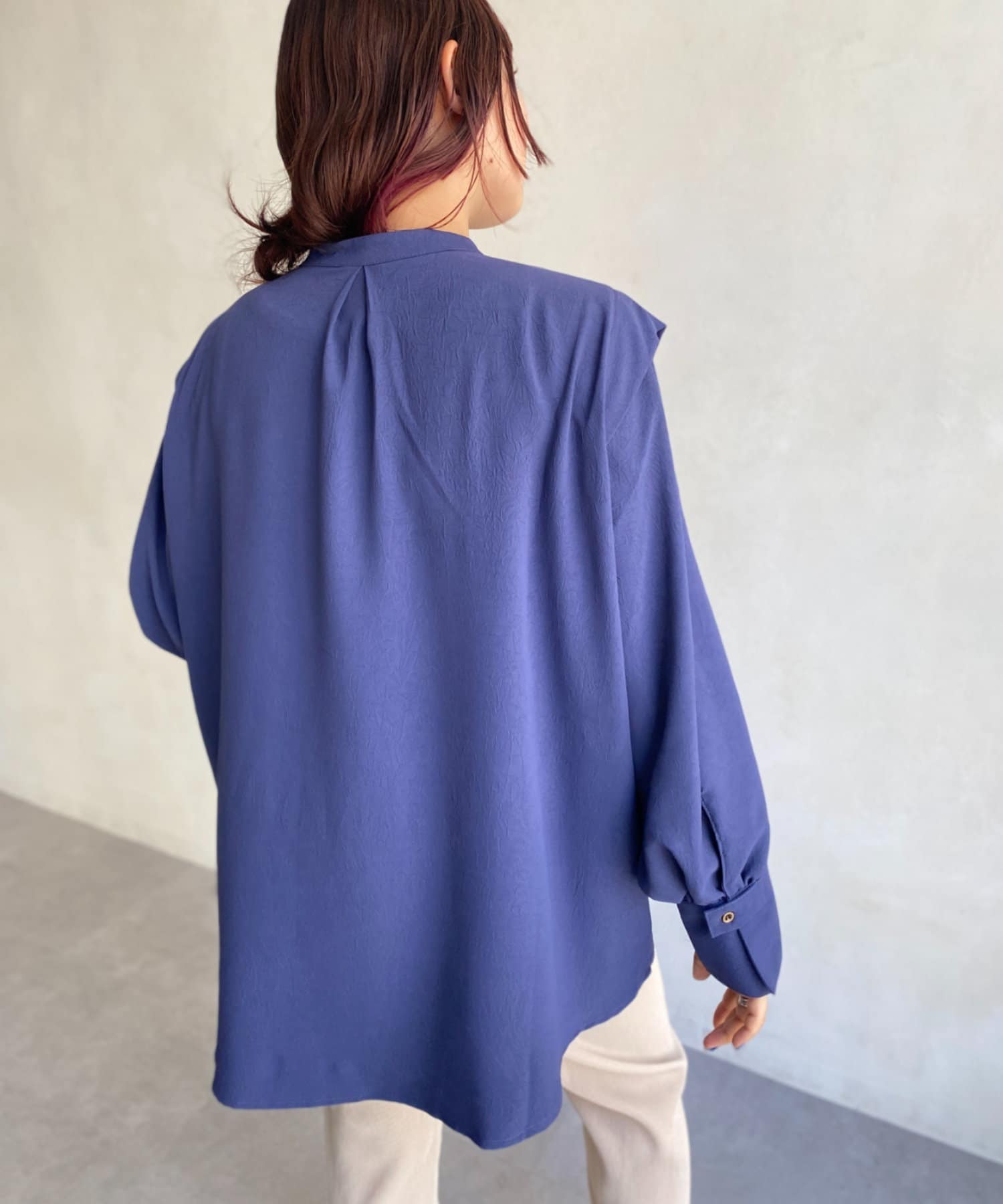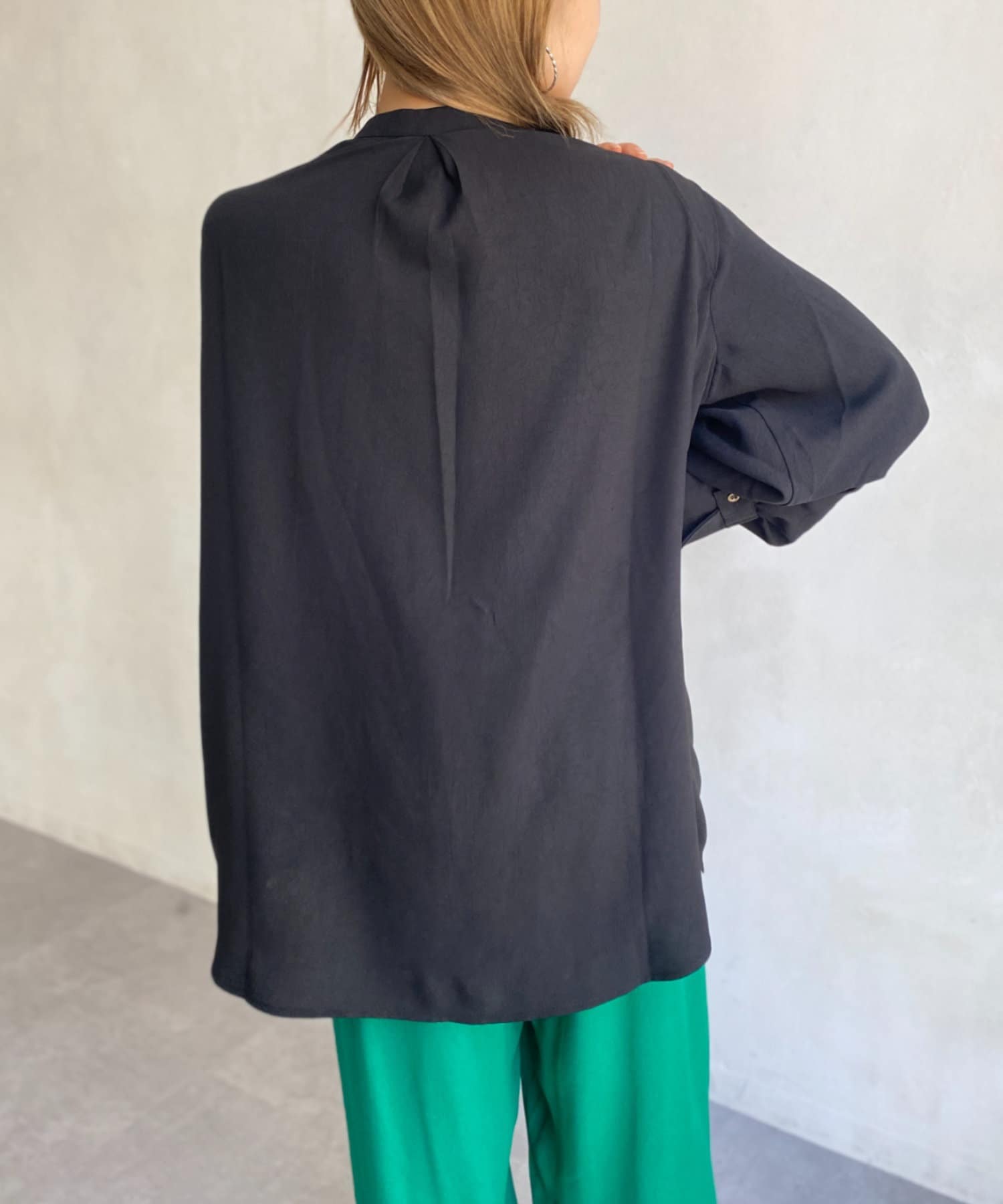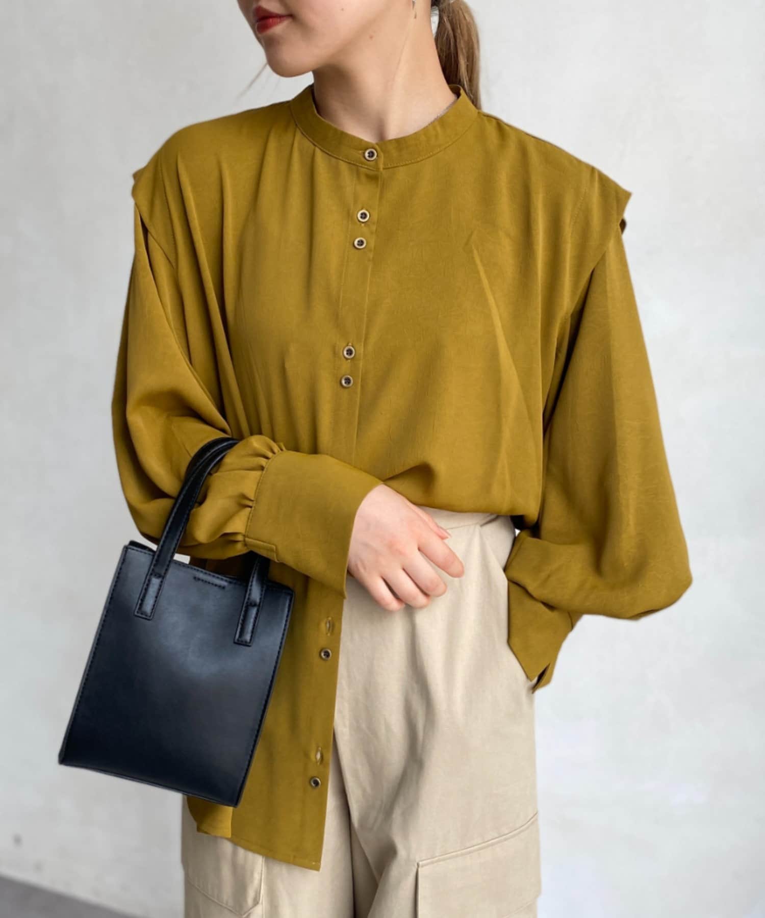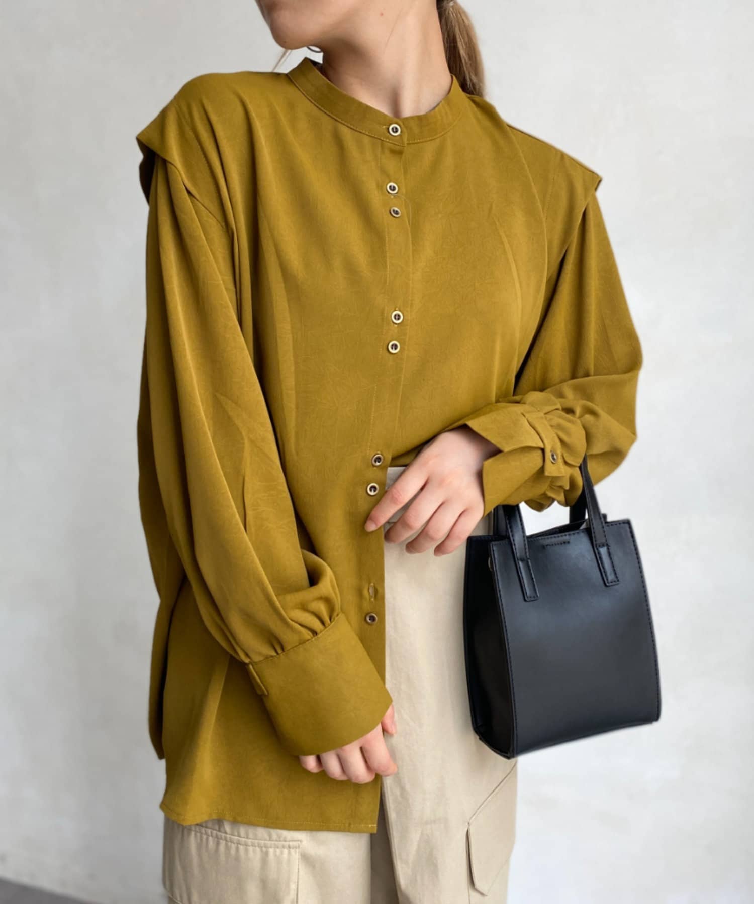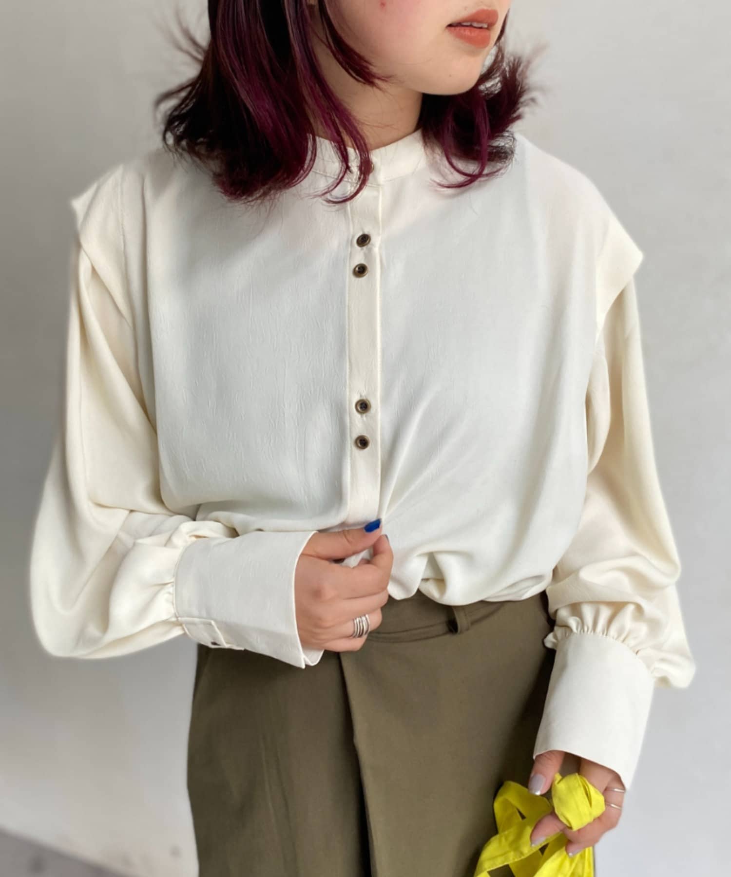襟元は甘くなりすぎないバンドカラーなので、パンツスタイルにもピッタリな1枚です◎