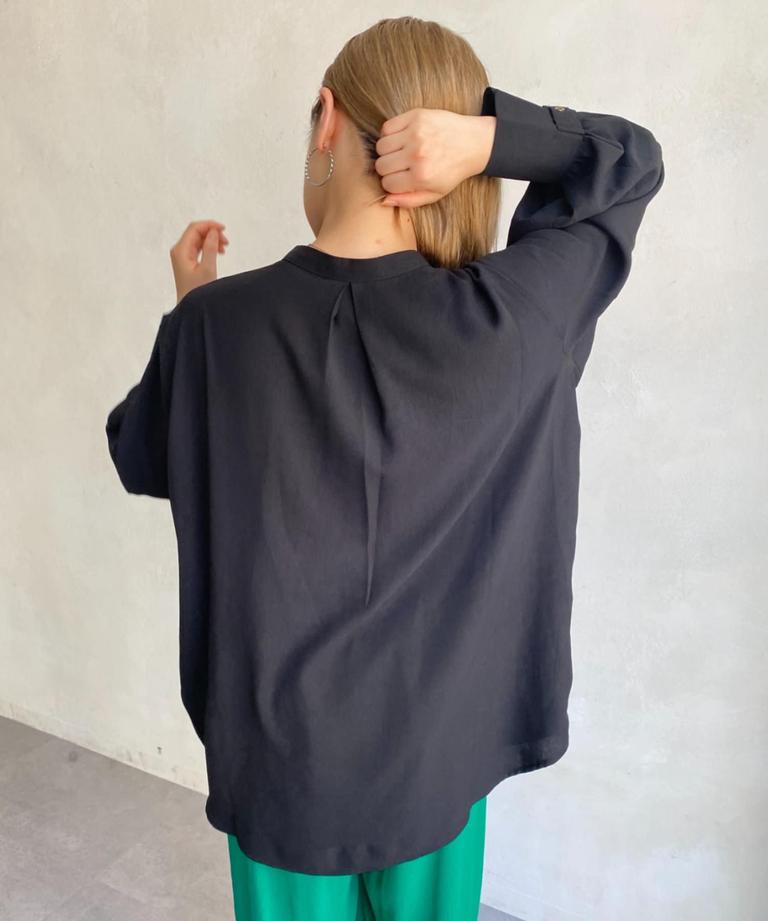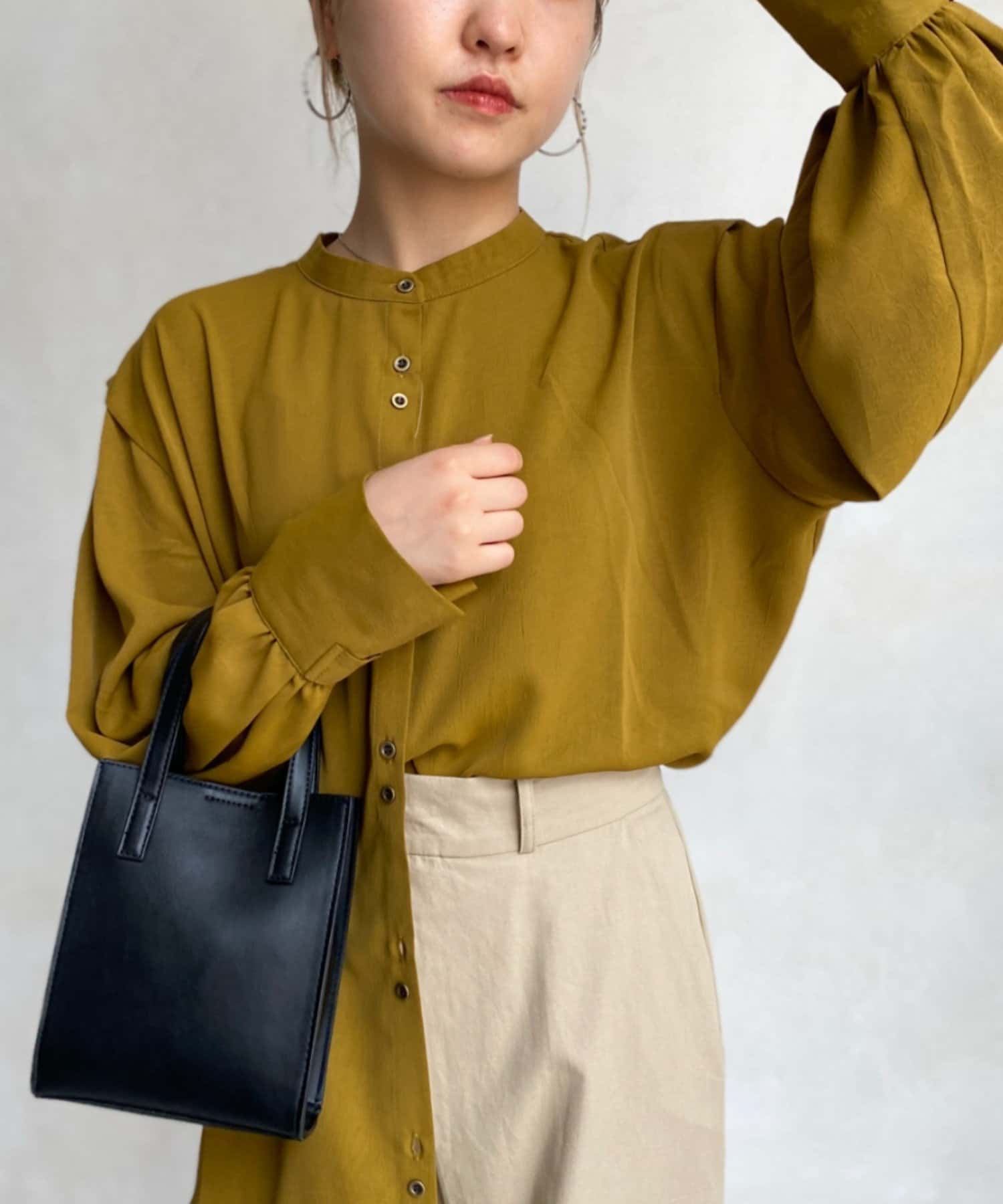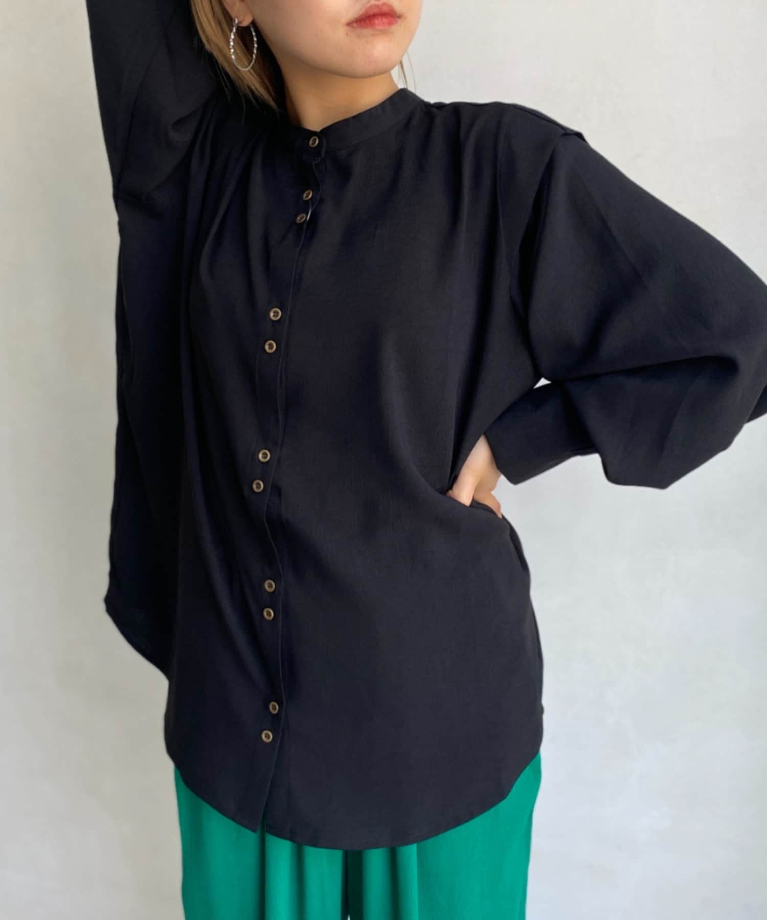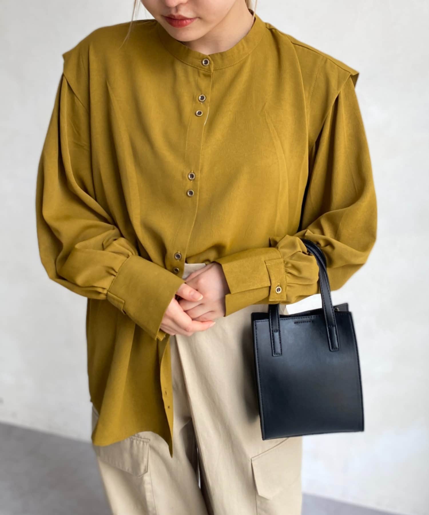 襟元は甘くなりすぎないバンドカラーなので、パンツスタイルにもピッタリな1枚です◎