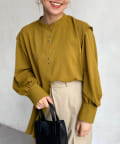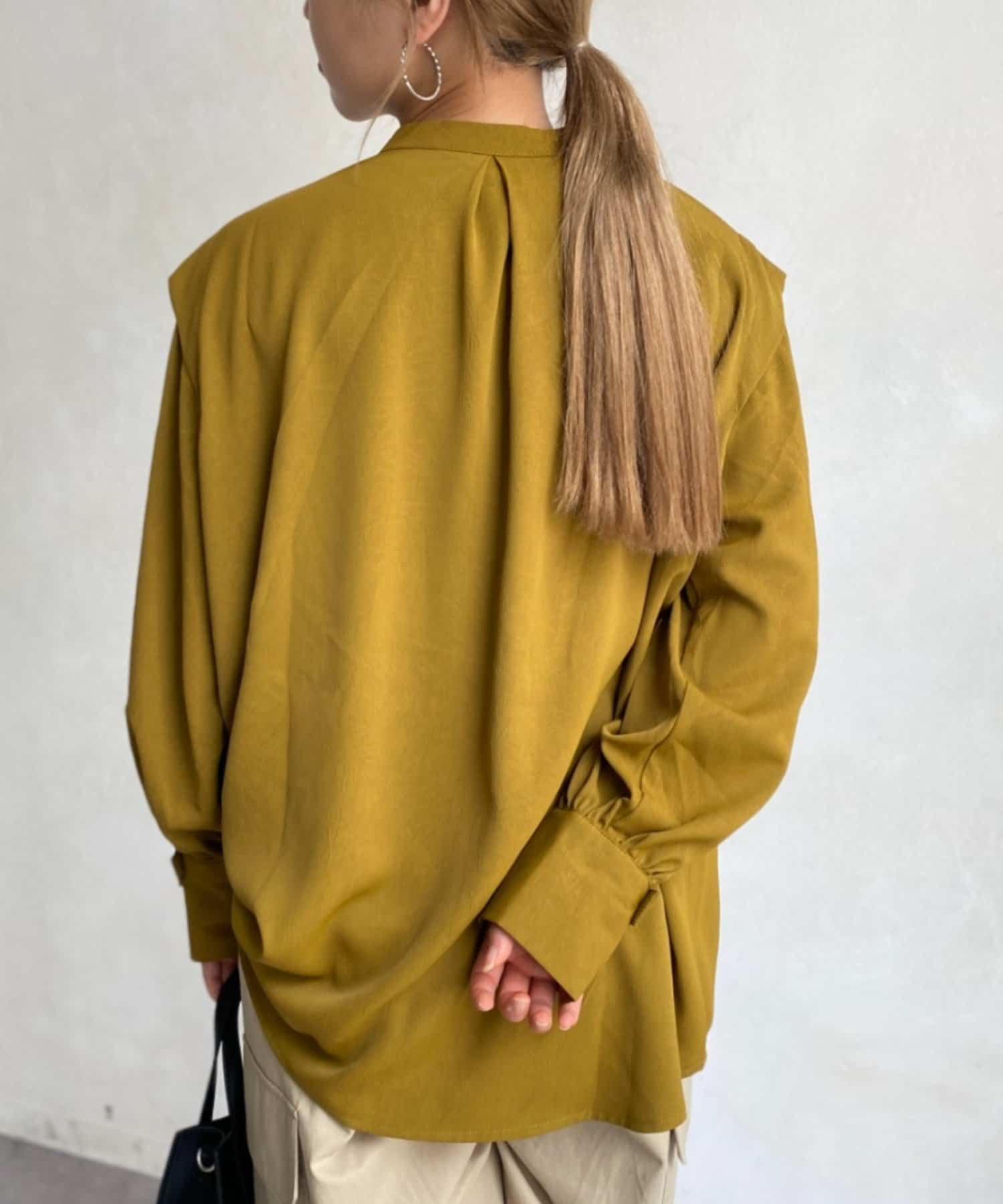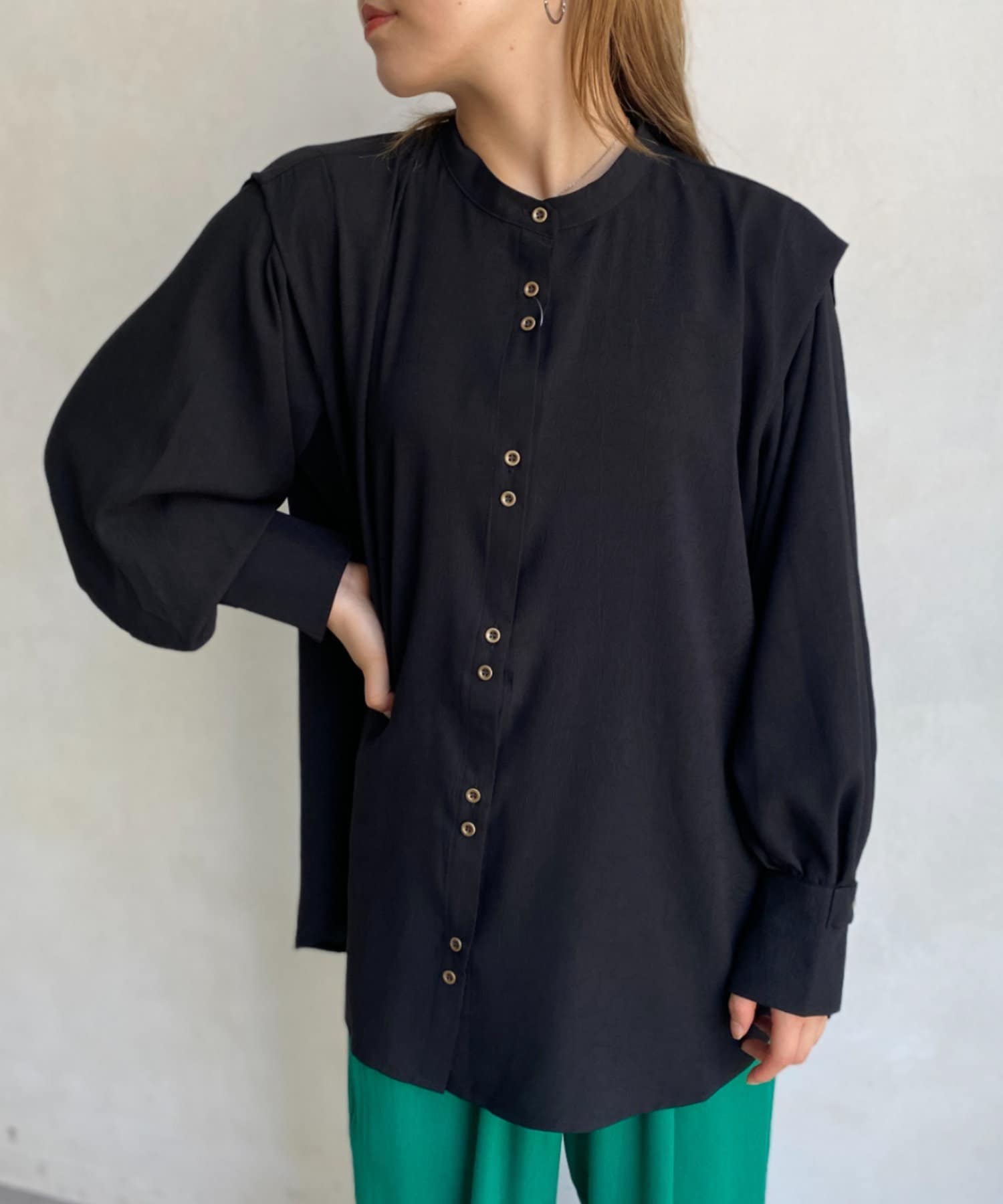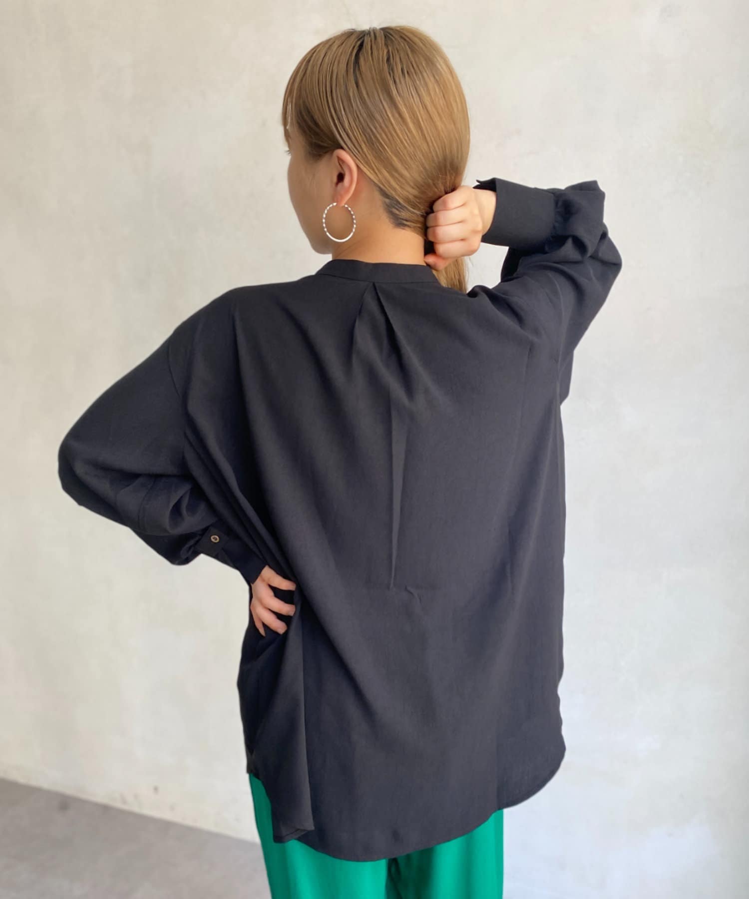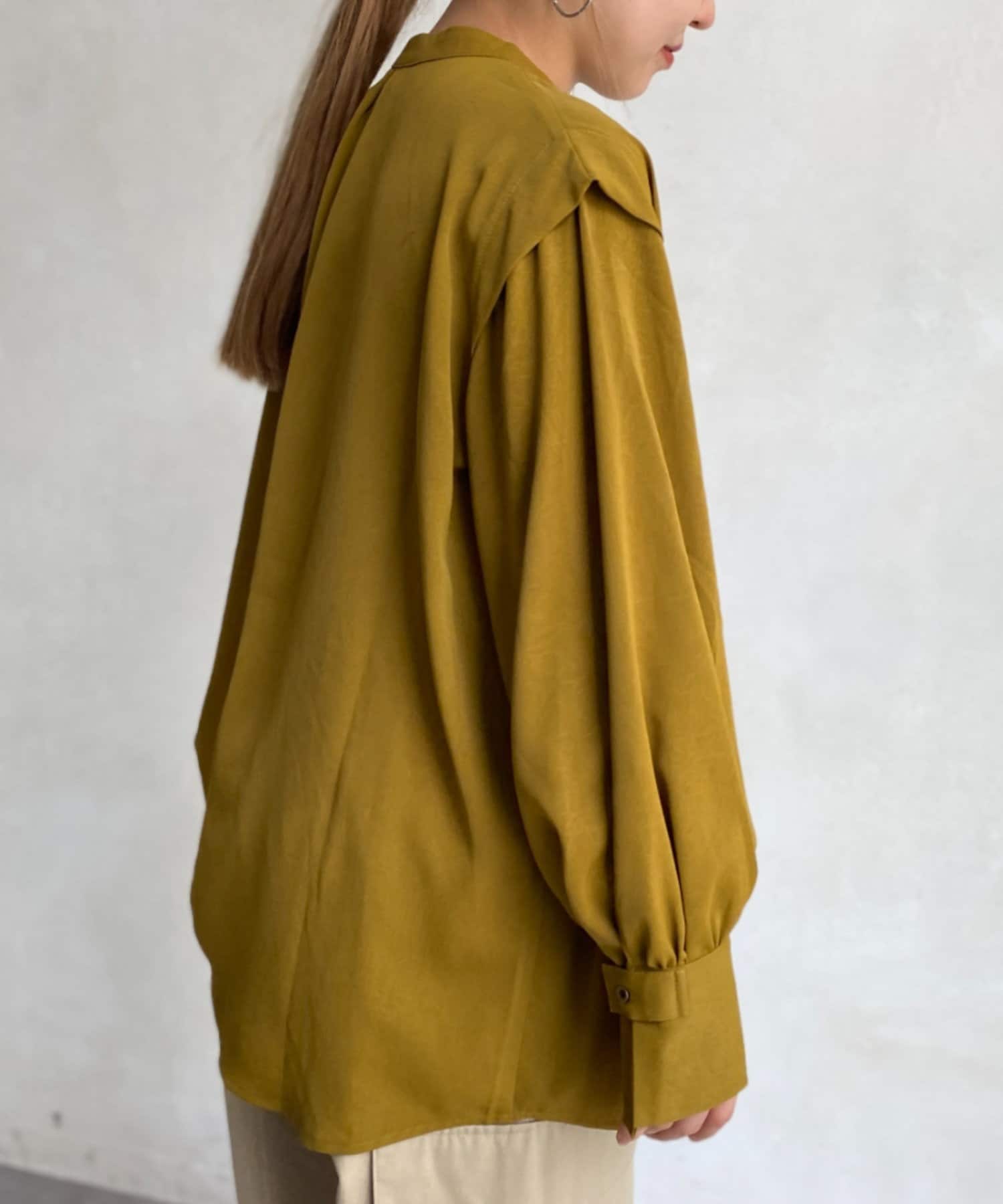 襟元は甘くなりすぎないバンドカラーなので、パンツスタイルにもピッタリな1枚です◎