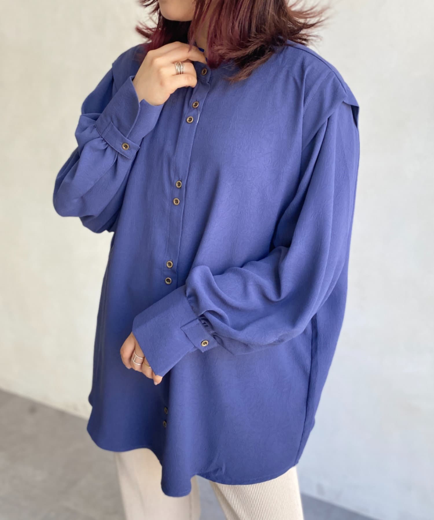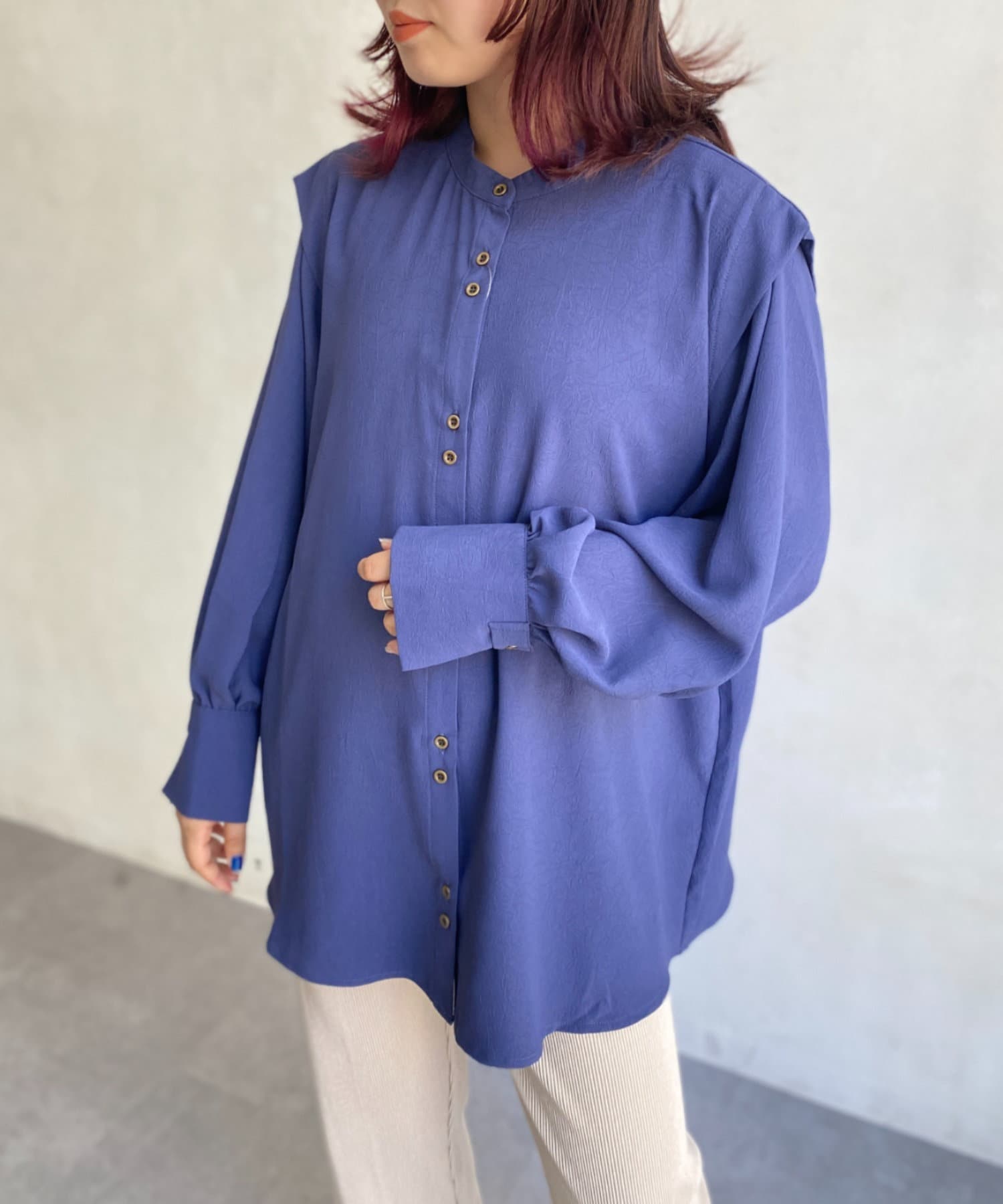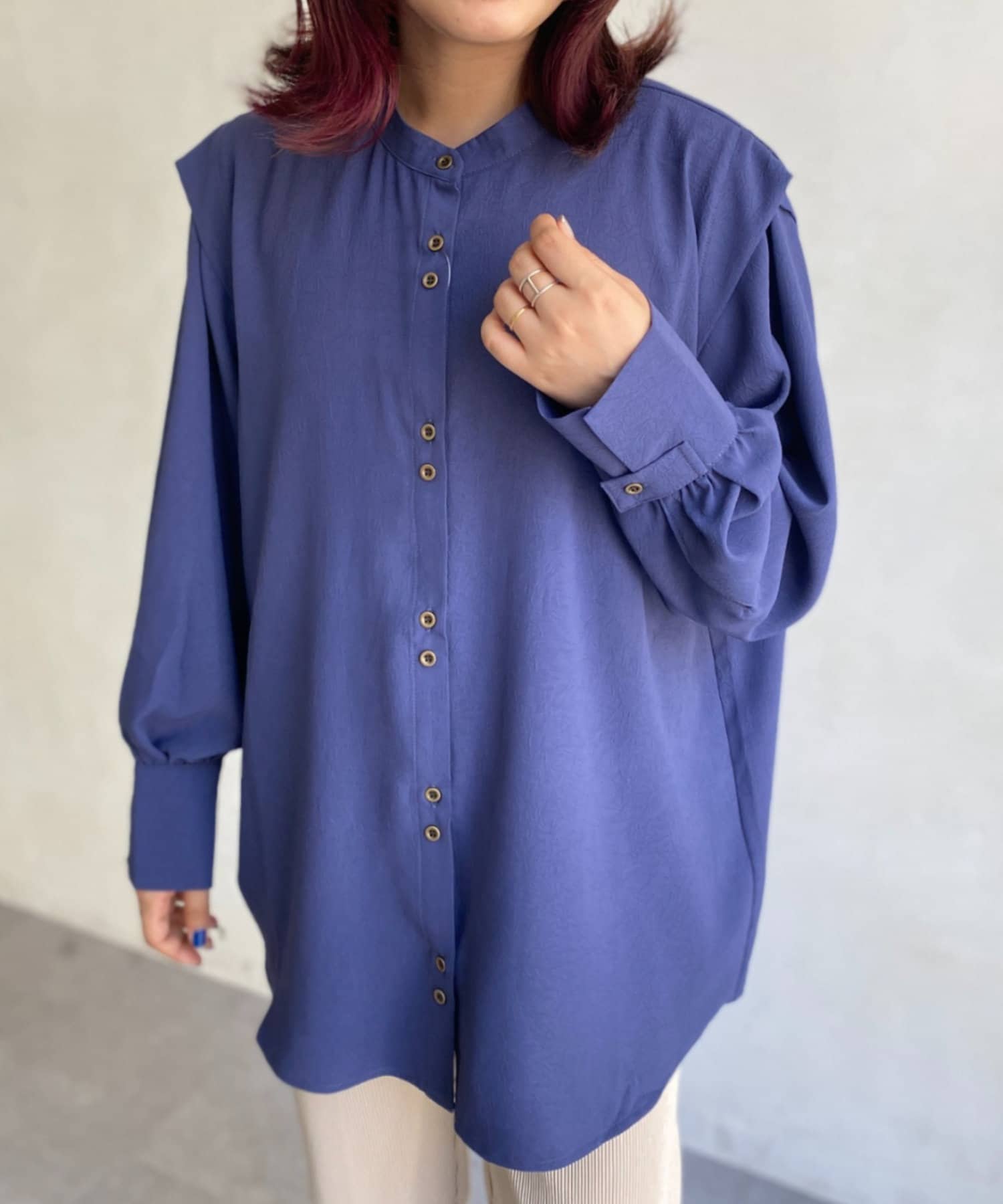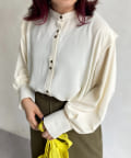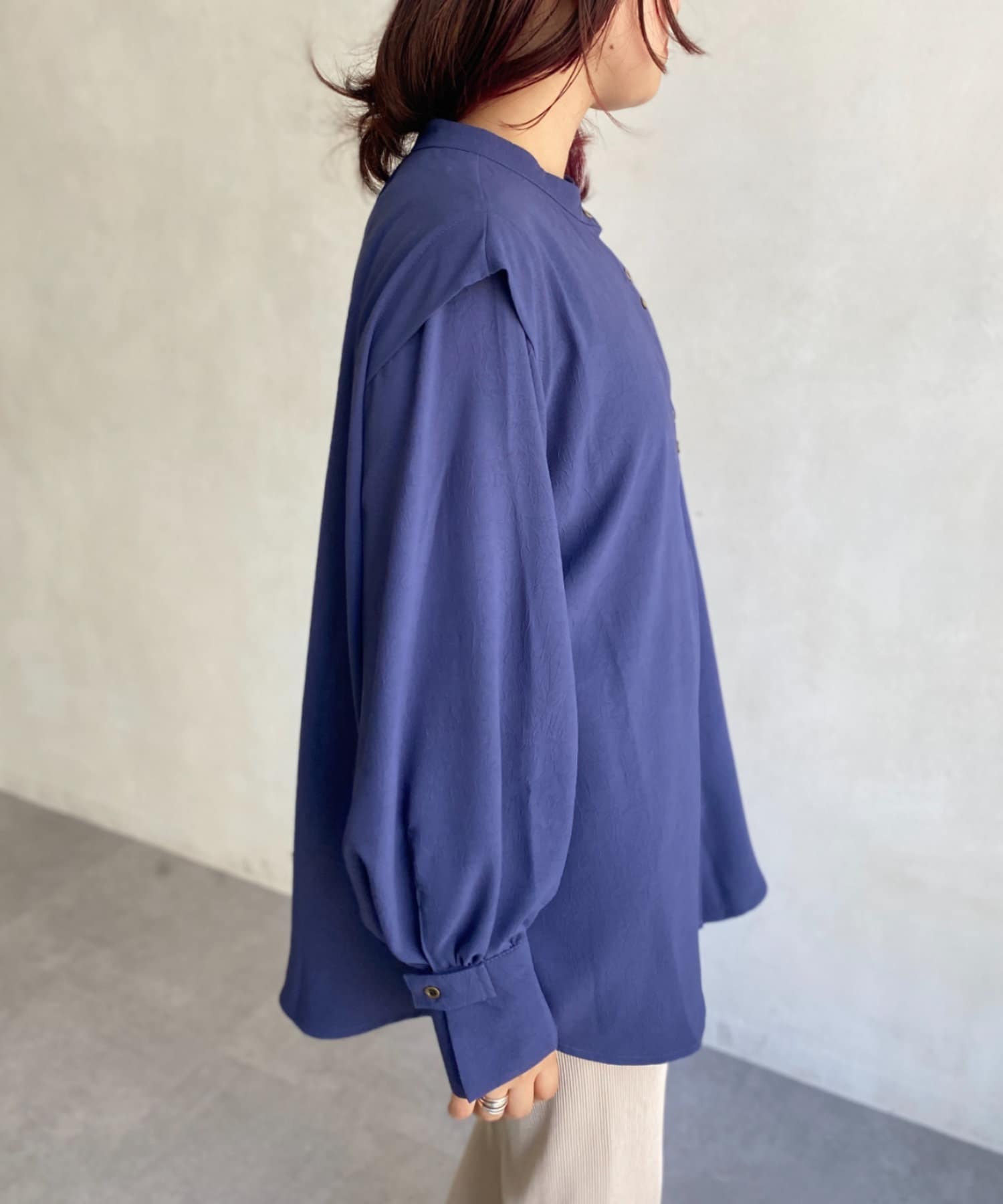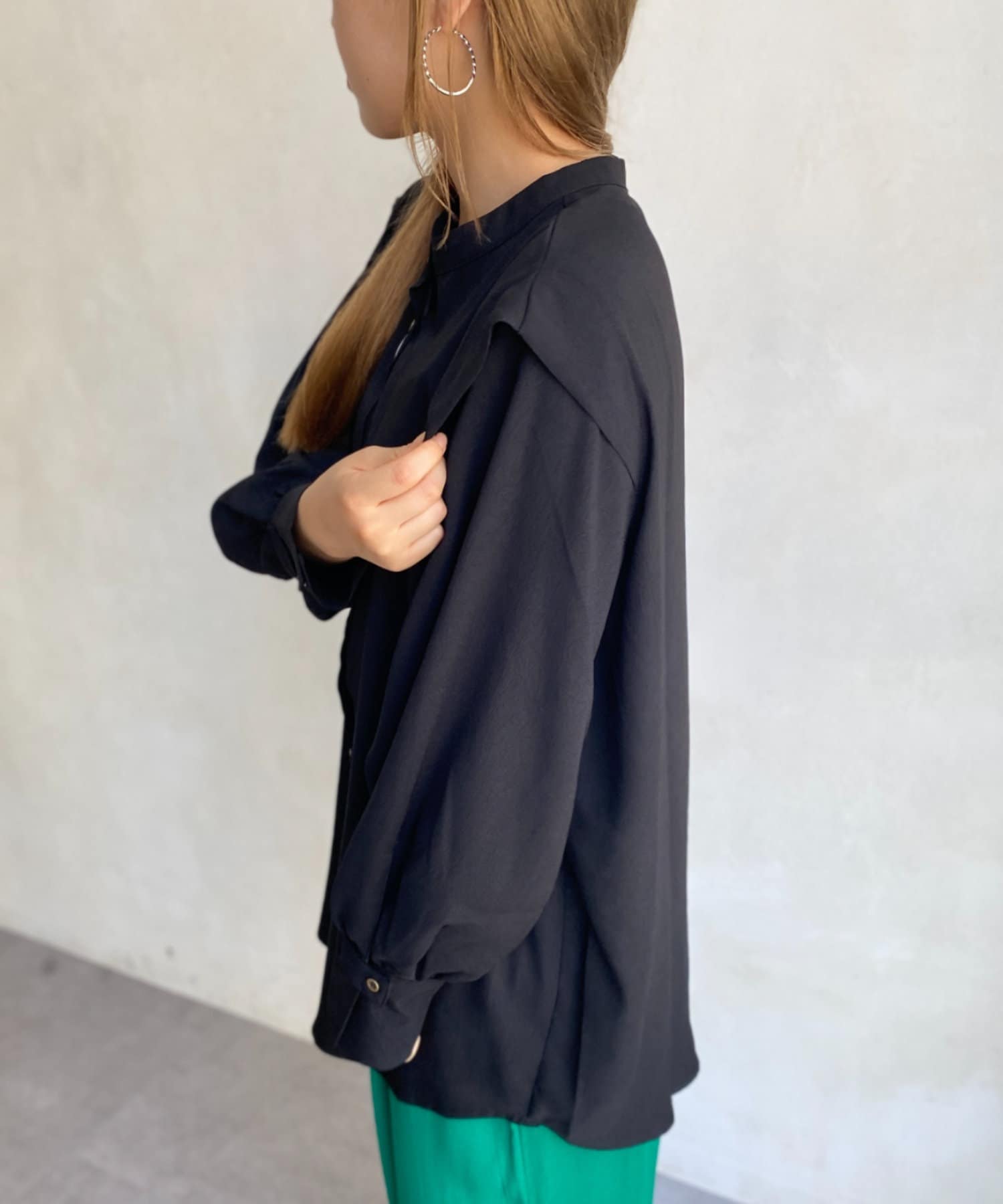 襟元は甘くなりすぎないバンドカラーなので、パンツスタイルにもピッタリな1枚です◎