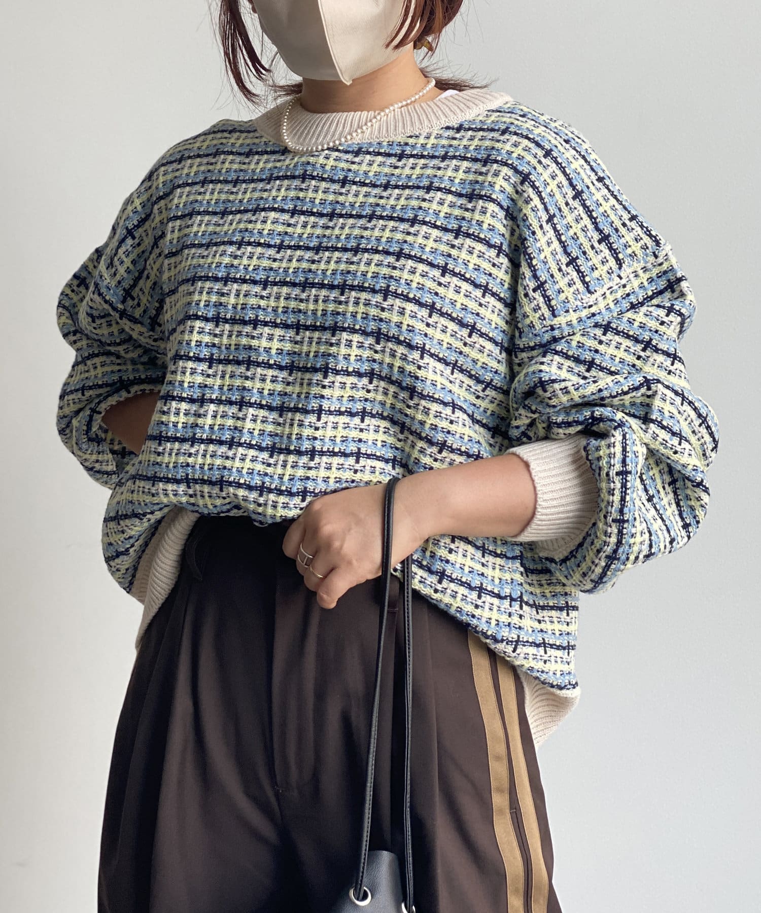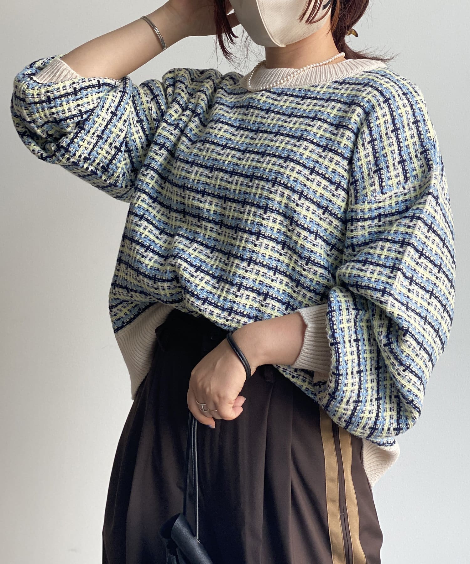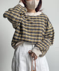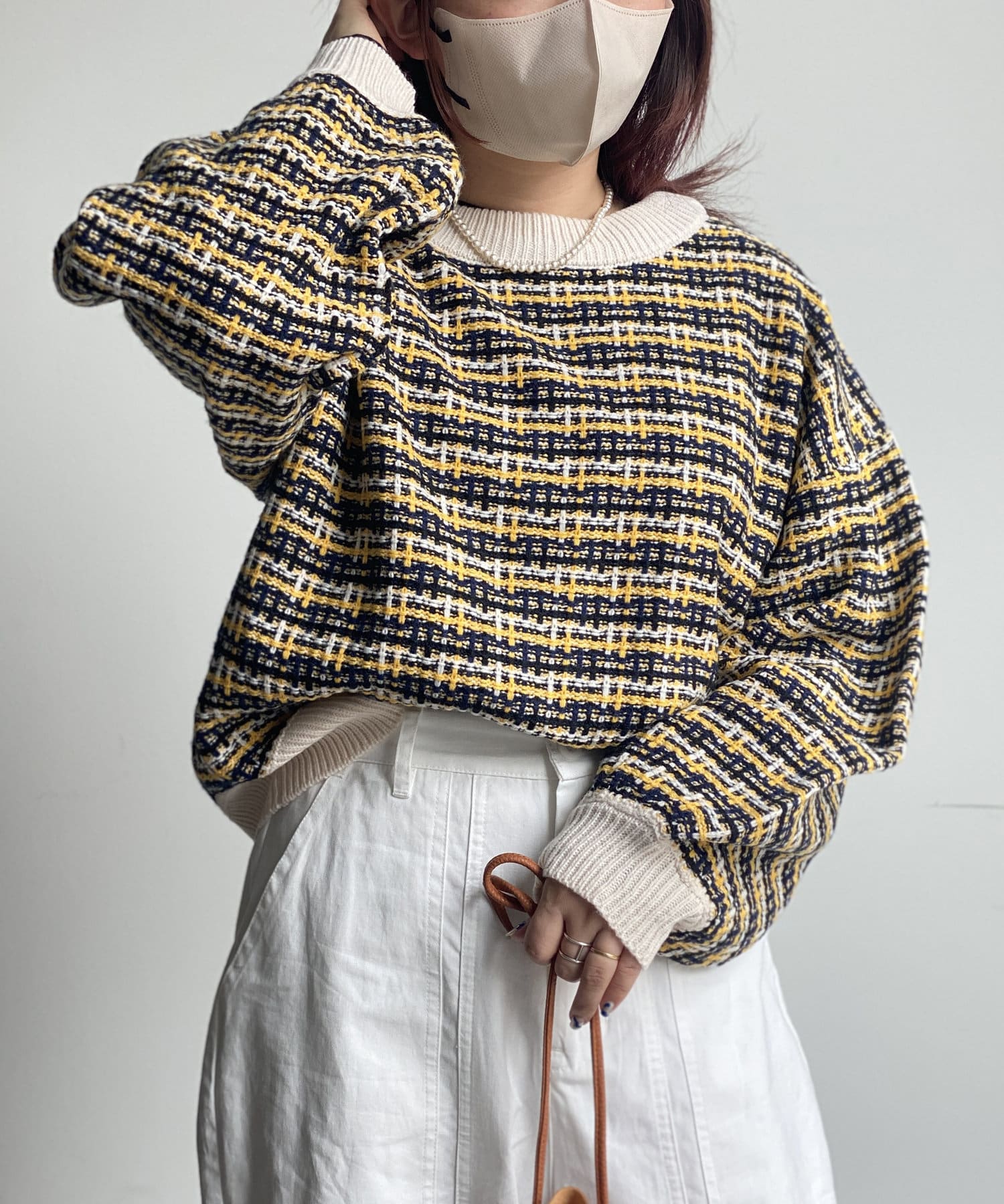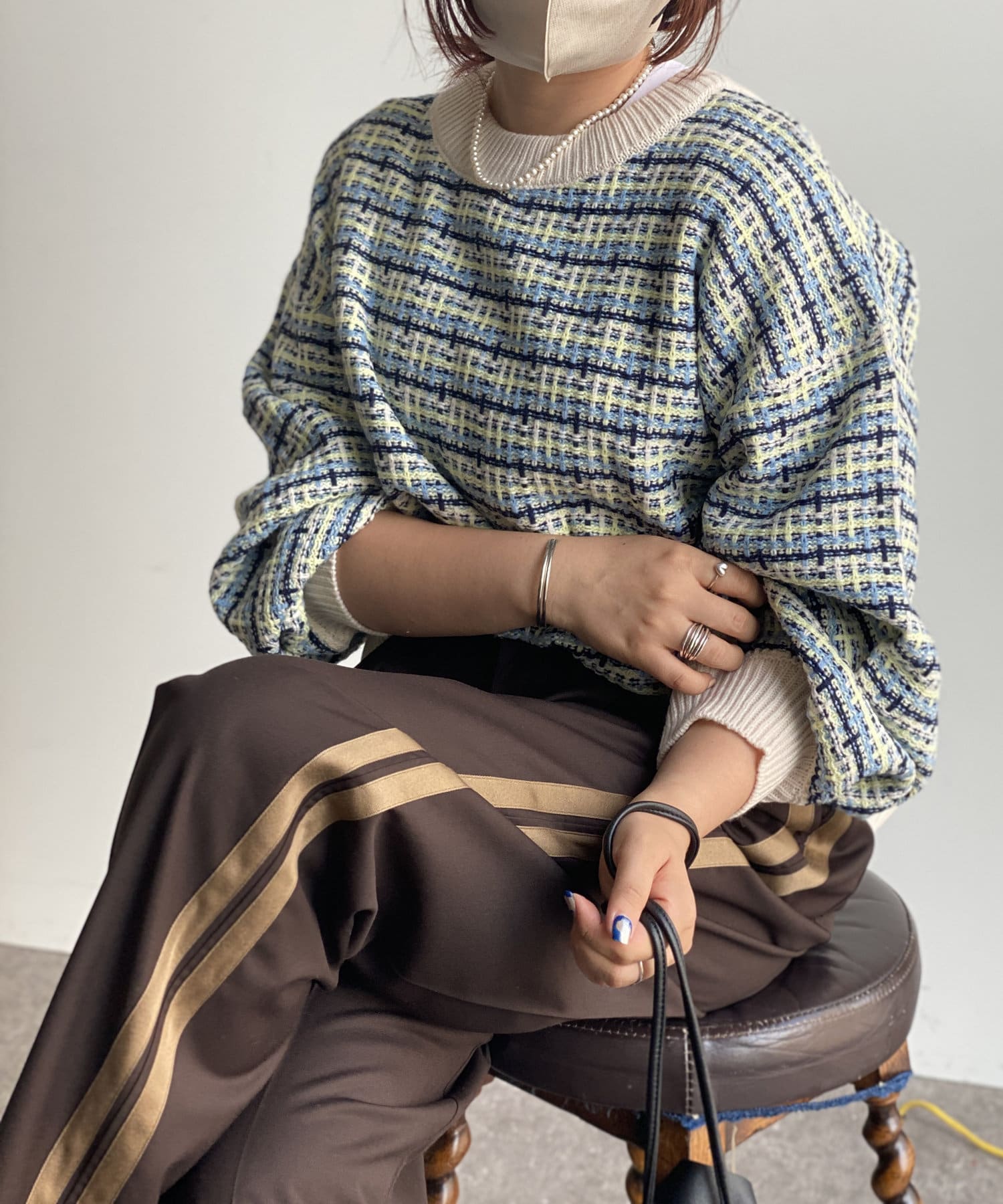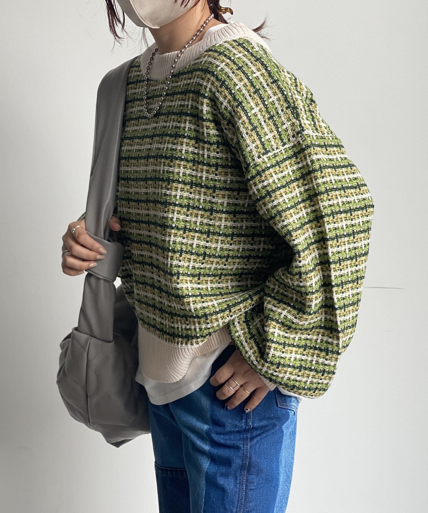 ジャガードで編み込まれたチェック柄がほっこり秋冬ムードを高めてくれる1枚です。