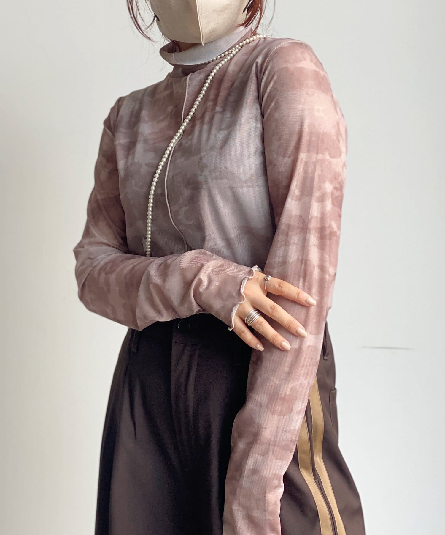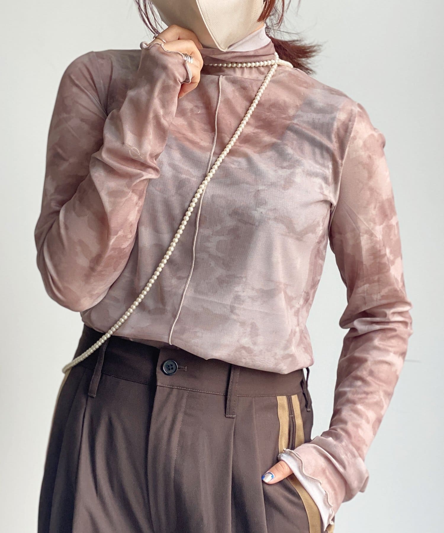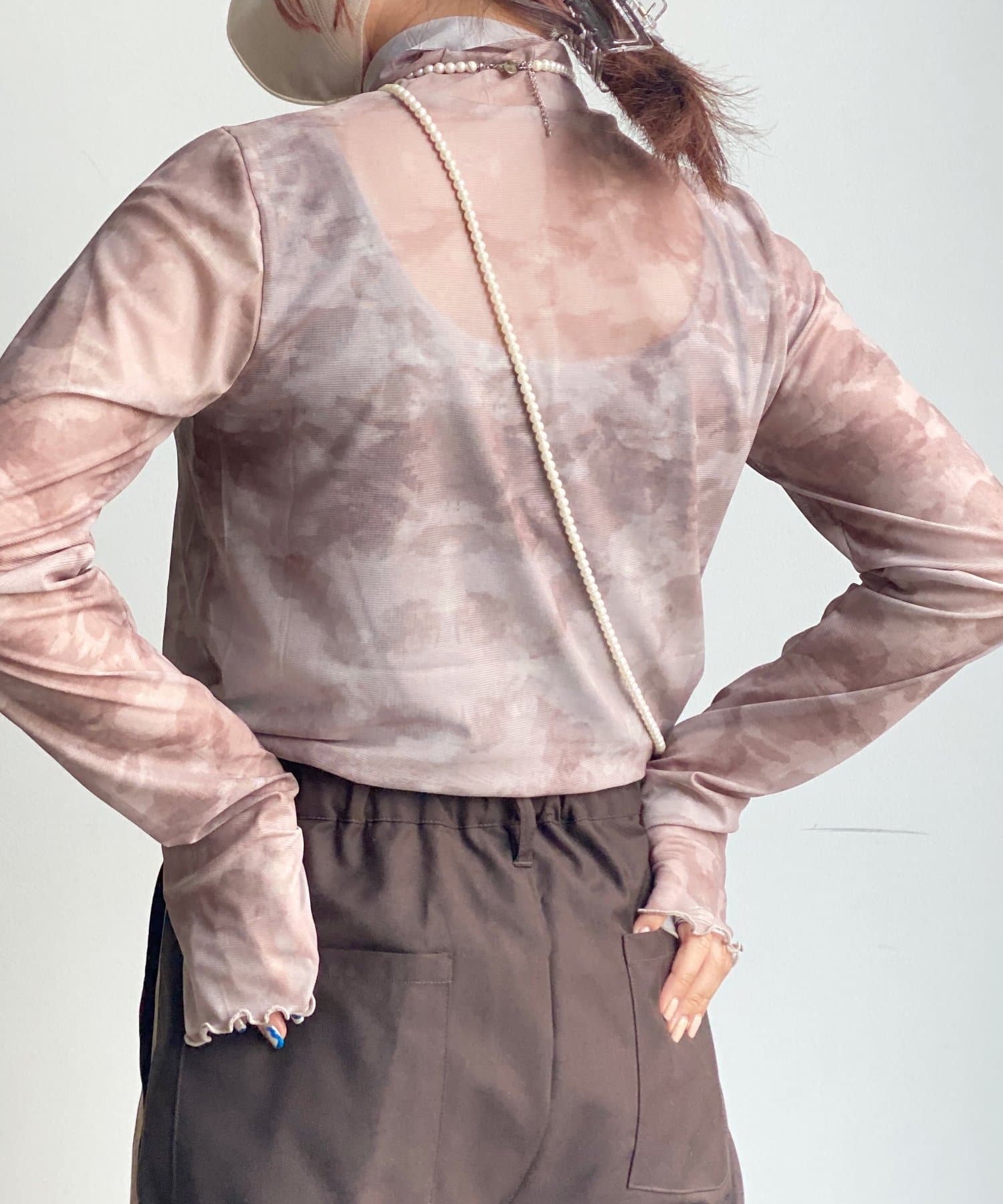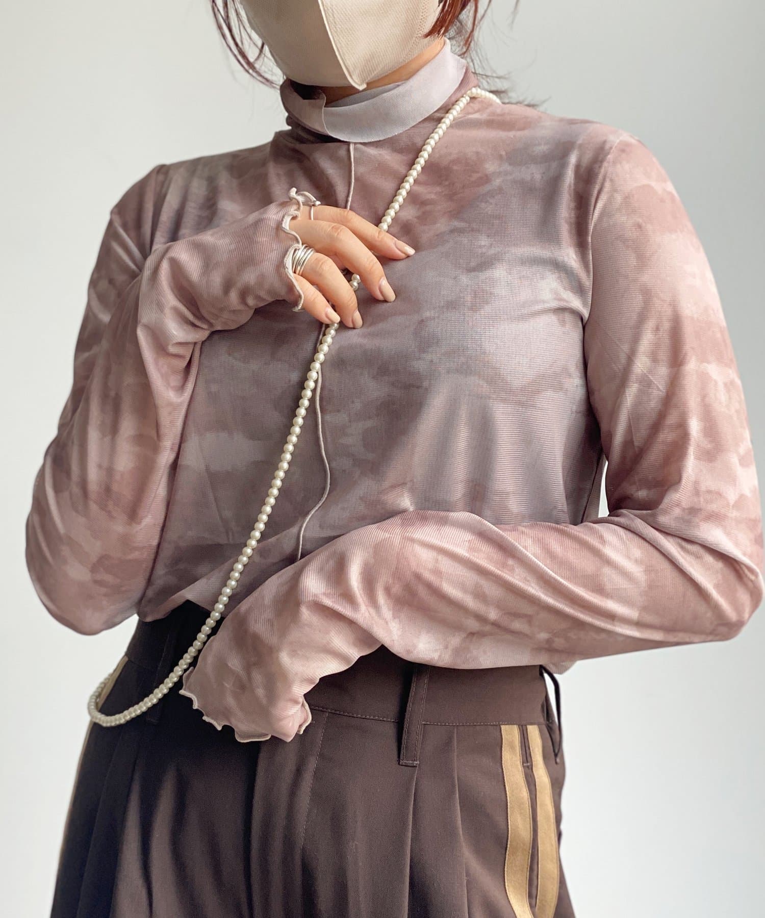 レイヤードコーデに欠かせないシアートップスに淡くアンニュイなマーブル柄が一気に旬なスタイリングにアップデート。