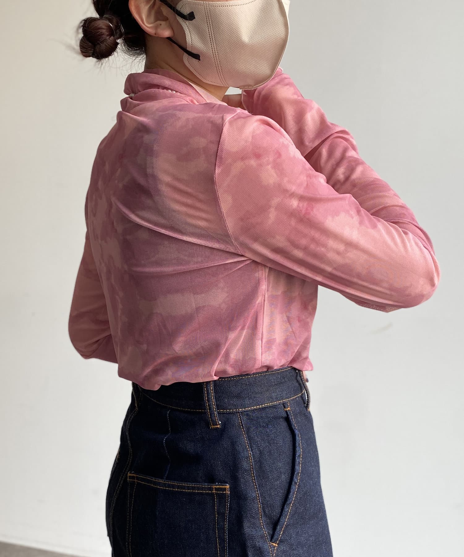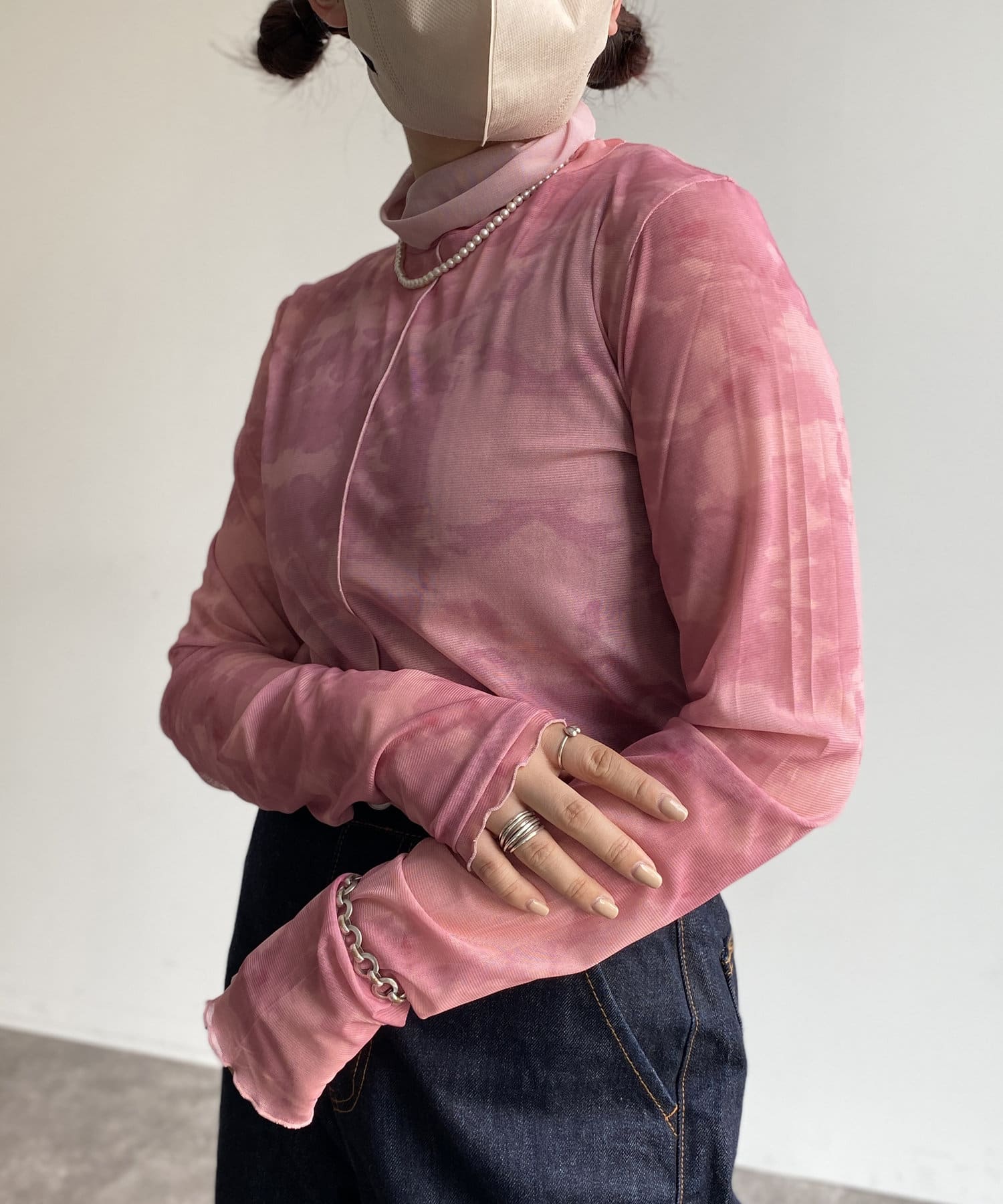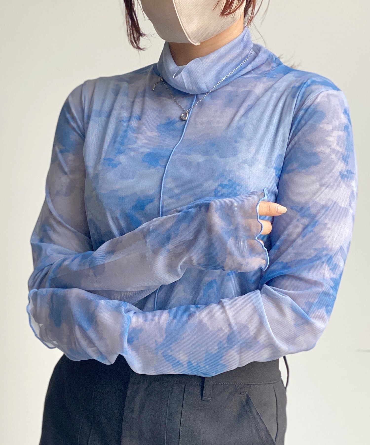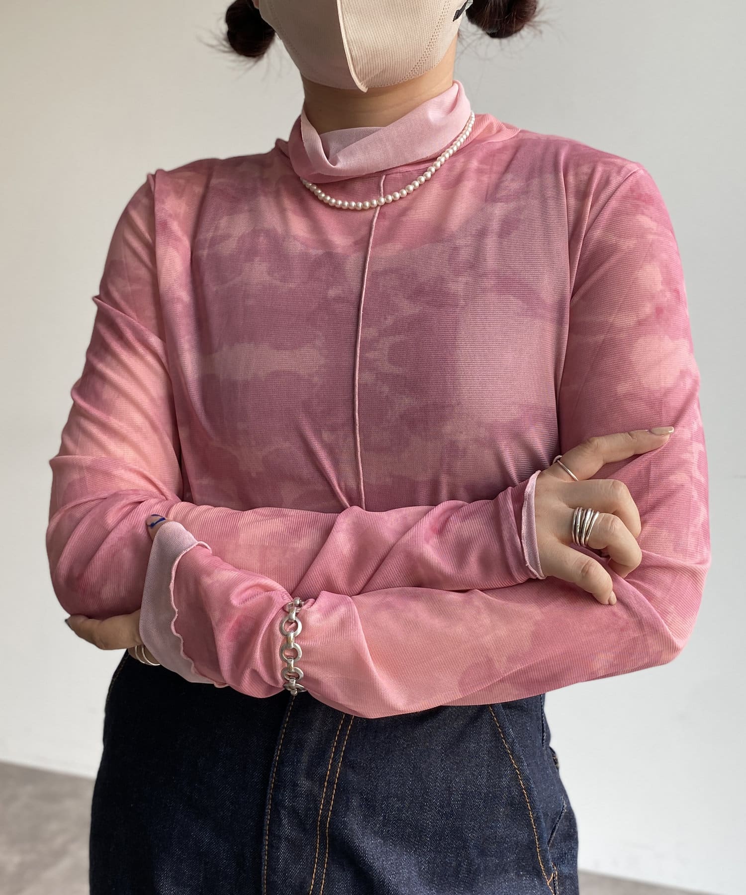 レイヤードコーデに欠かせないシアートップスに淡くアンニュイなマーブル柄が一気に旬なスタイリングにアップデート。