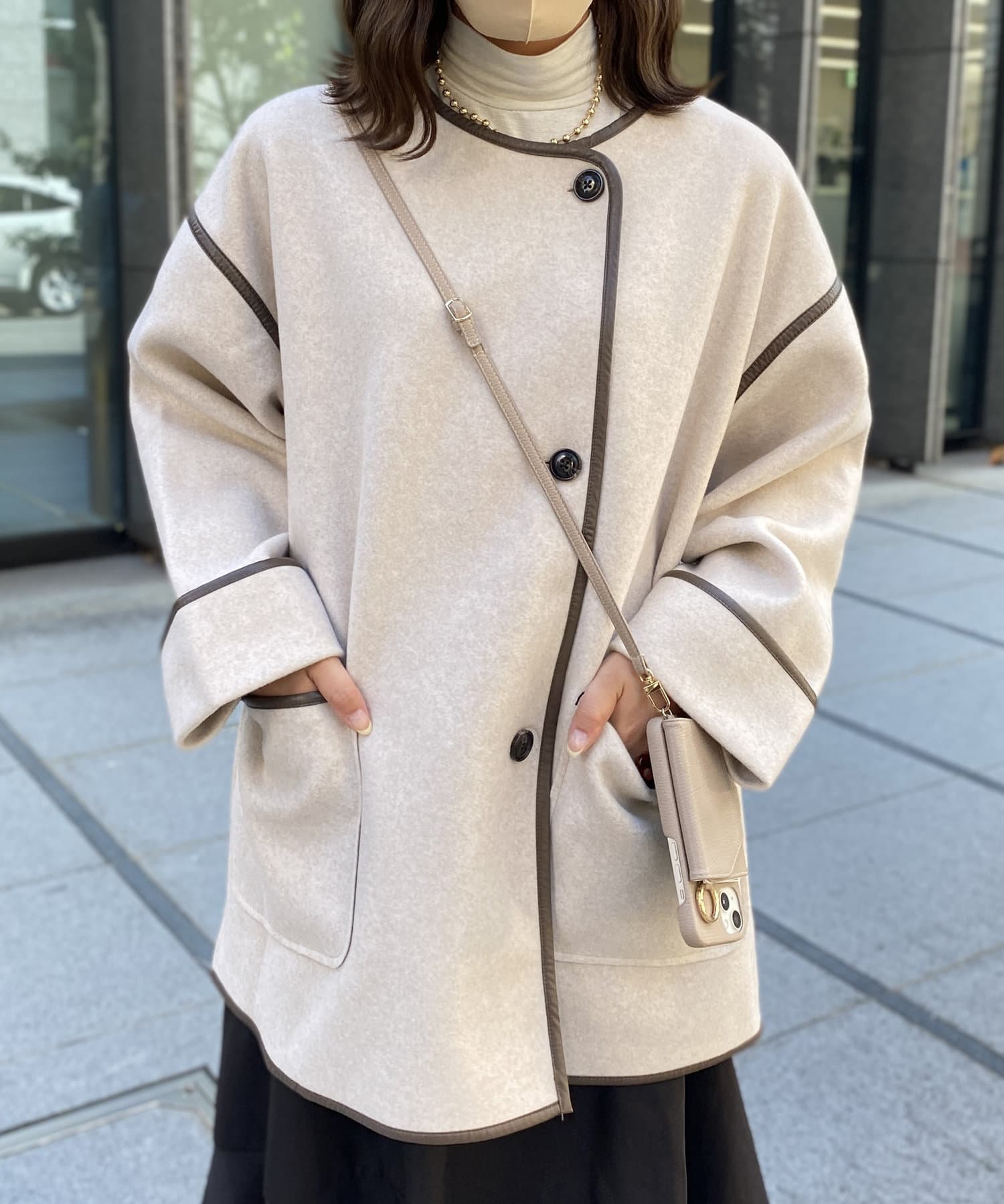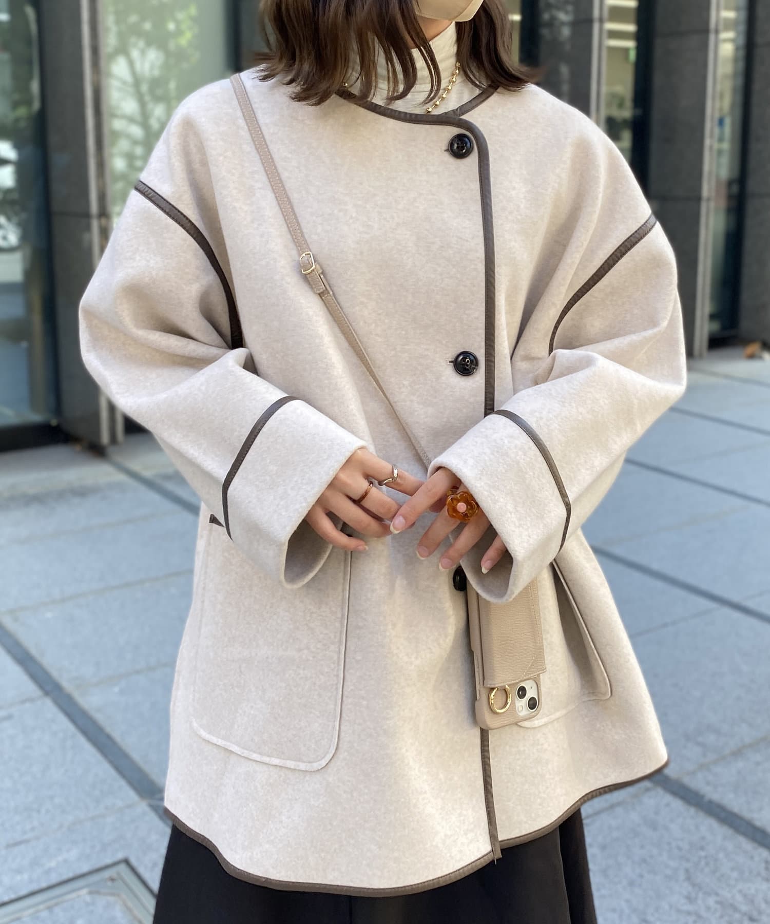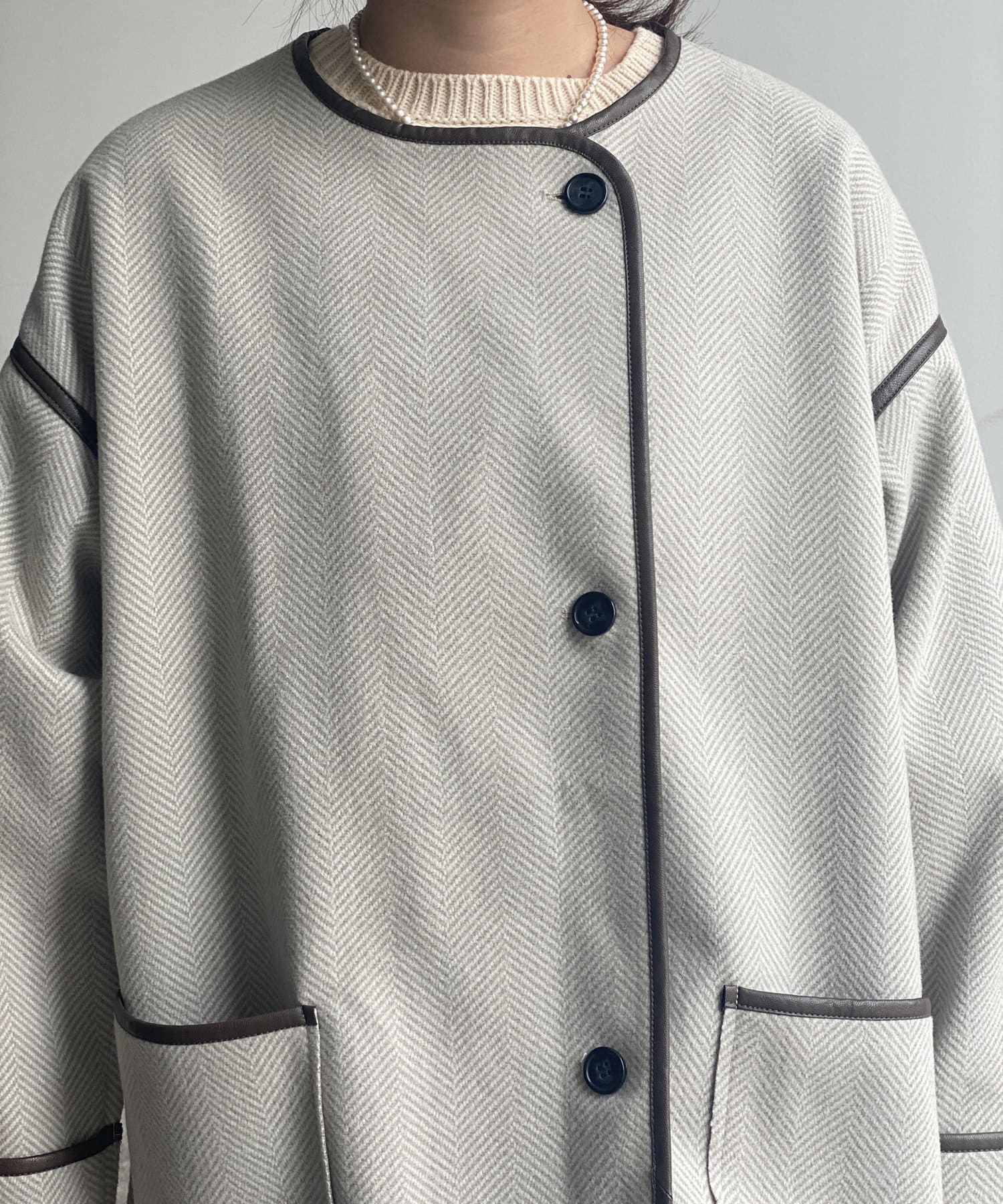印象的なフェイクレザーパイピングがコーデに奥行きを与えるノーカラーコート。