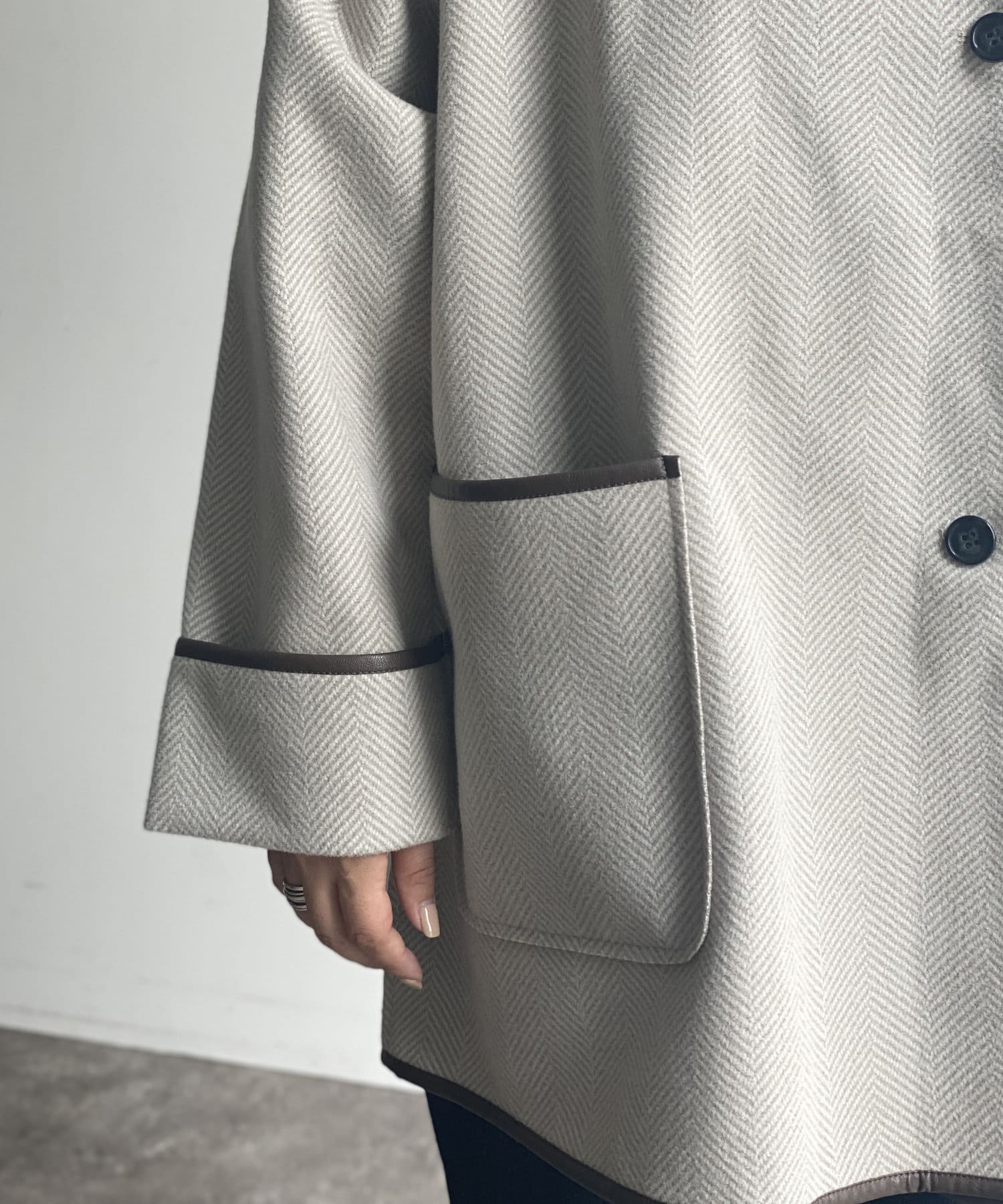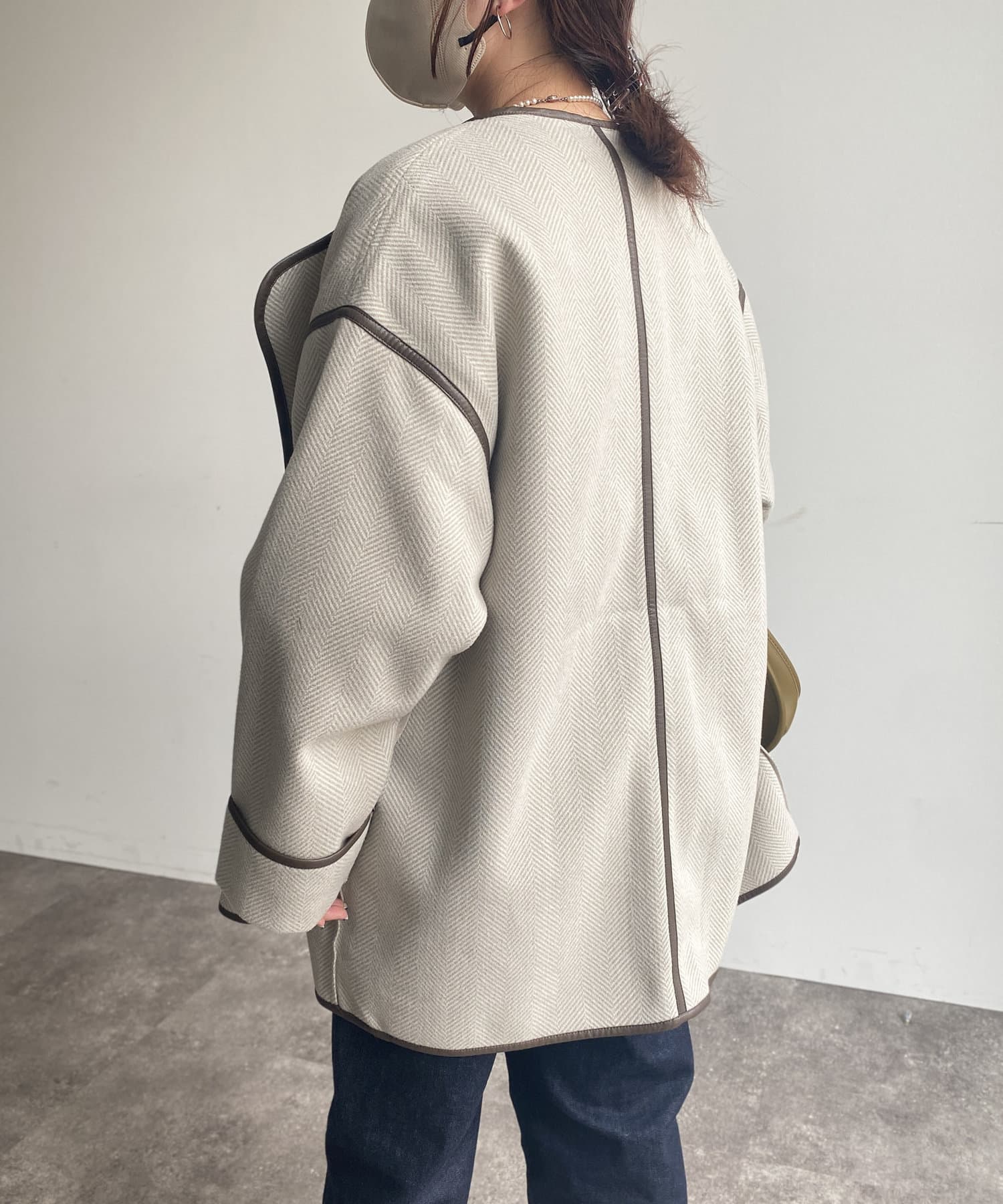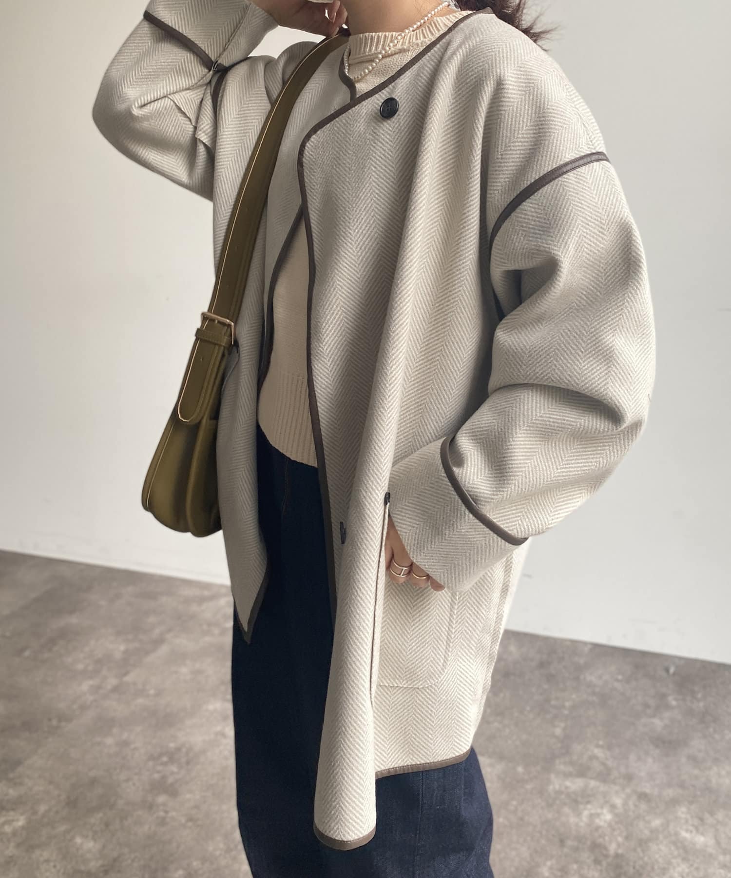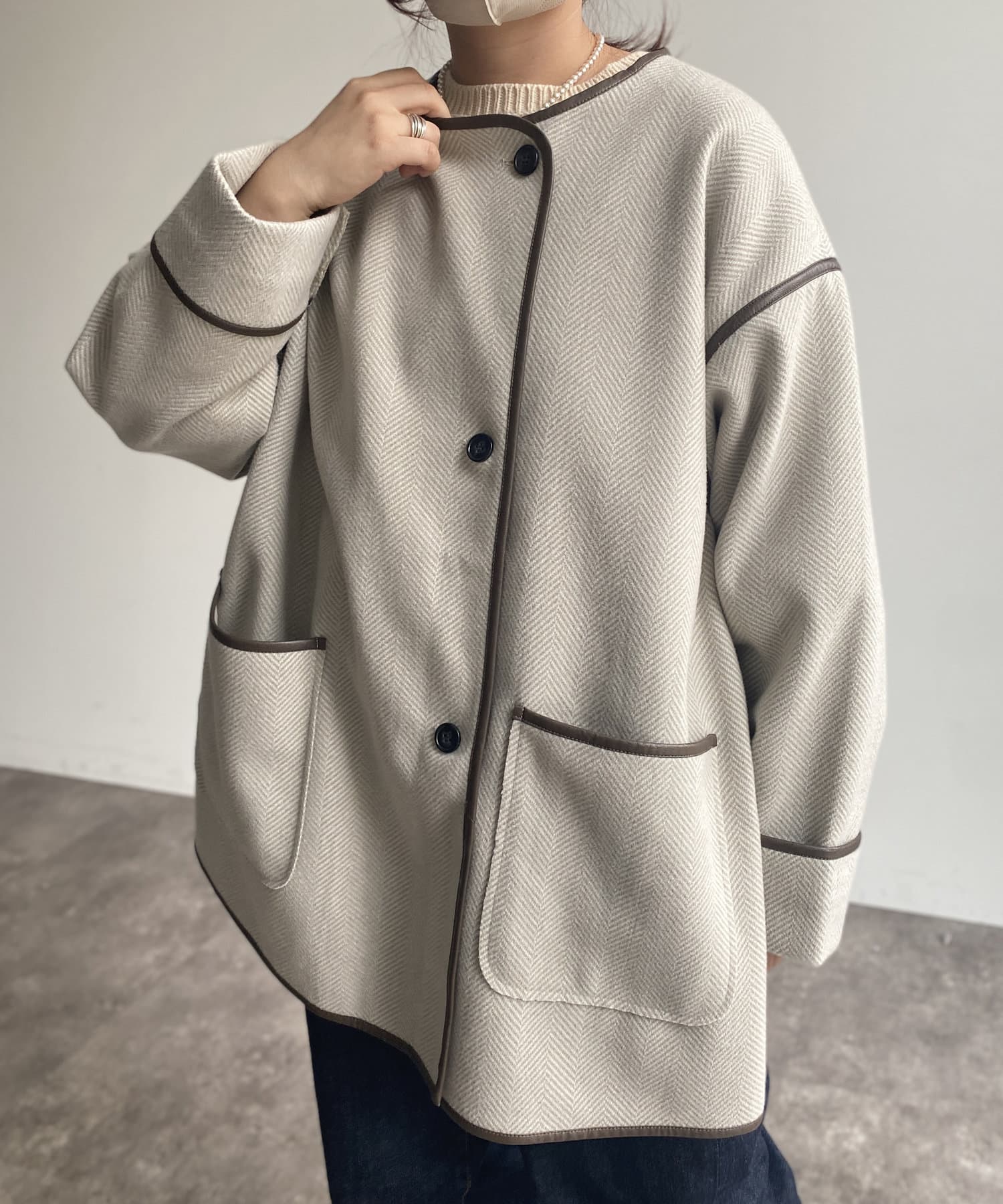印象的なフェイクレザーパイピングがコーデに奥行きを与えるノーカラーコート。