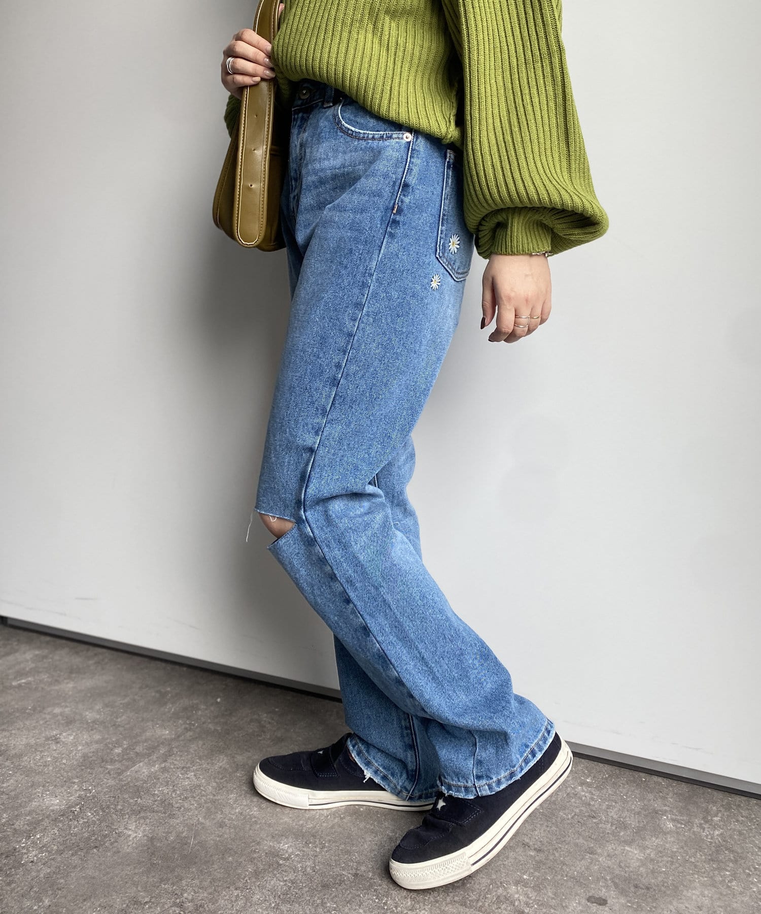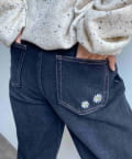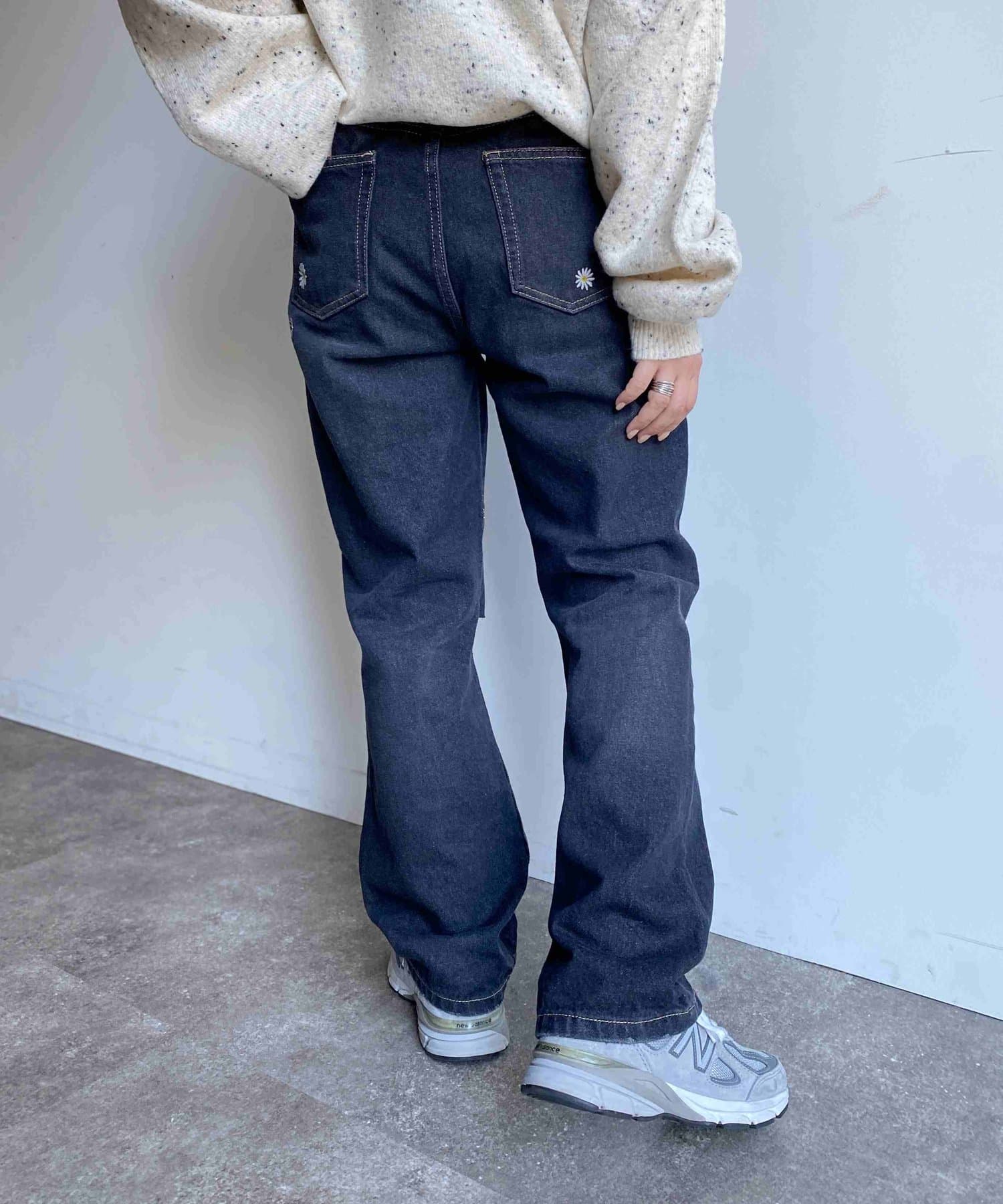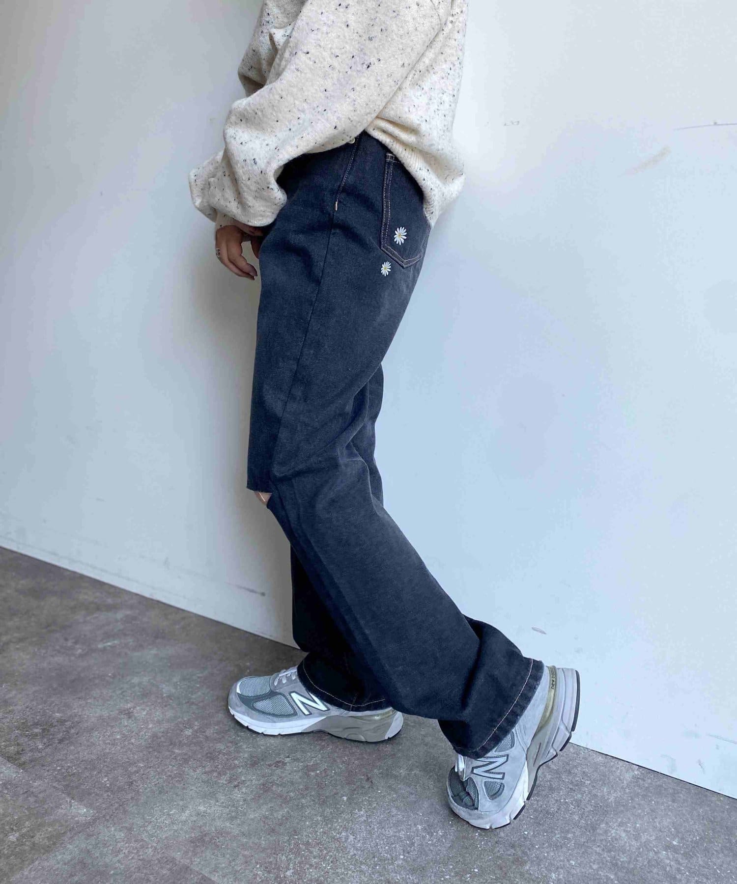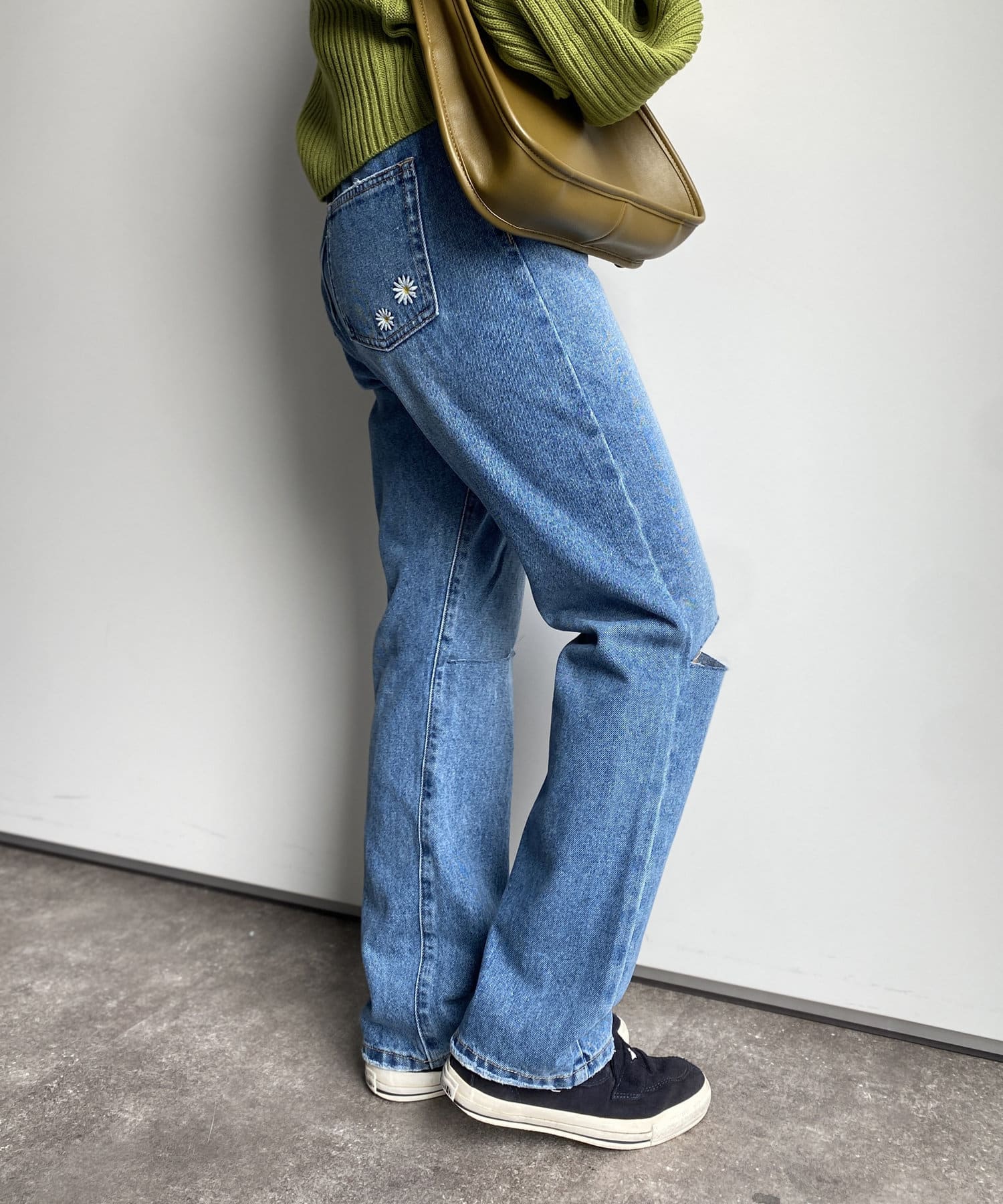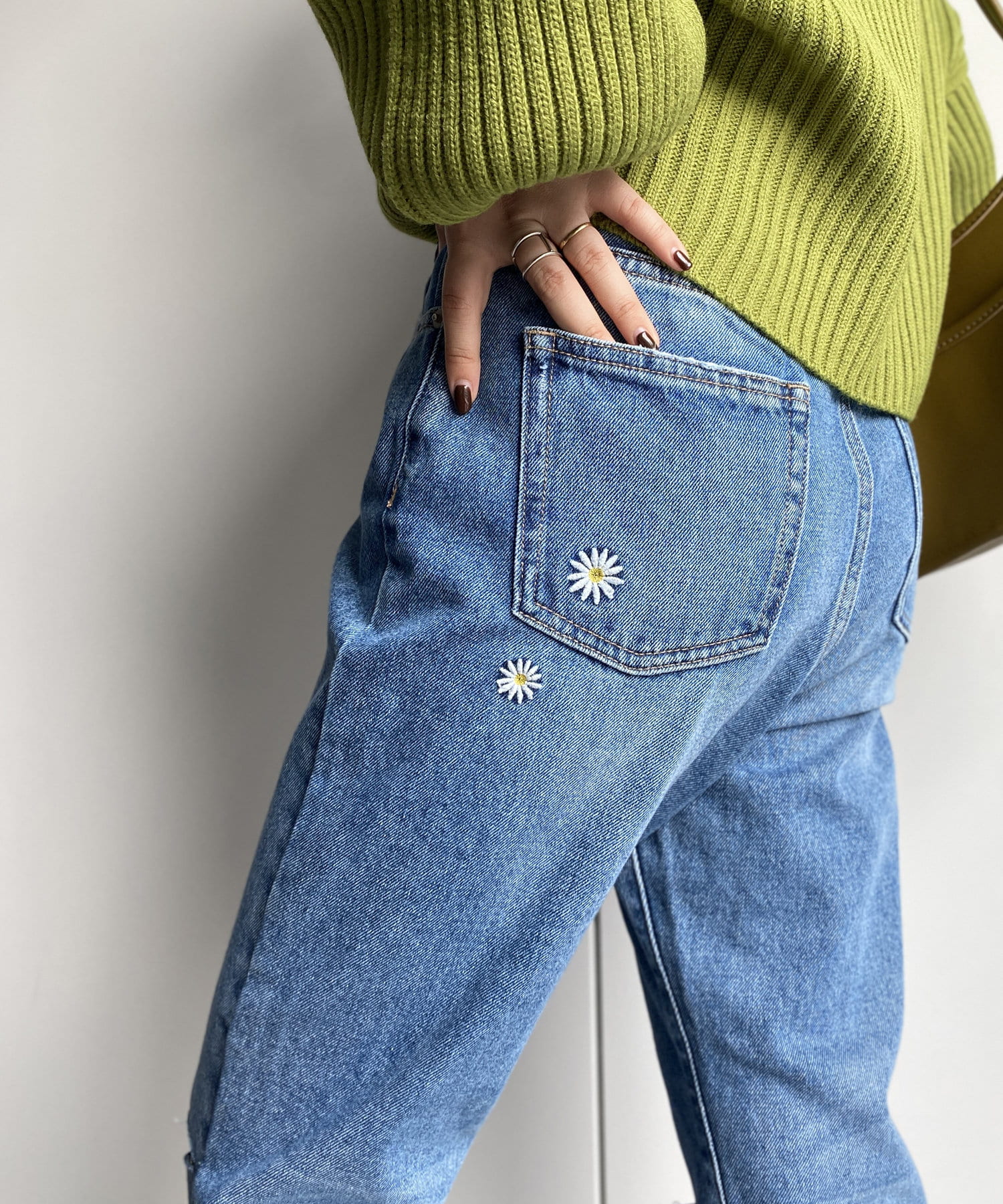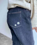 バックスタイルに施したフラワー刺繍がポイントのデニムパンツ