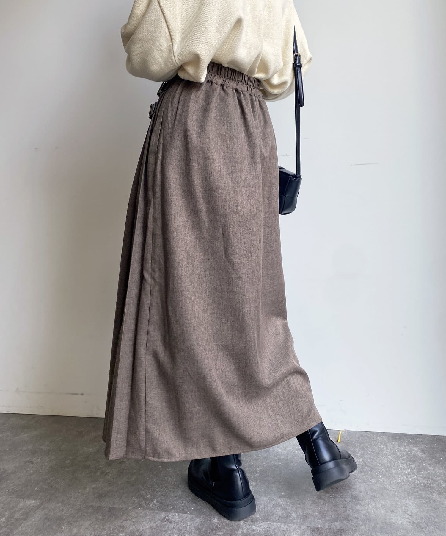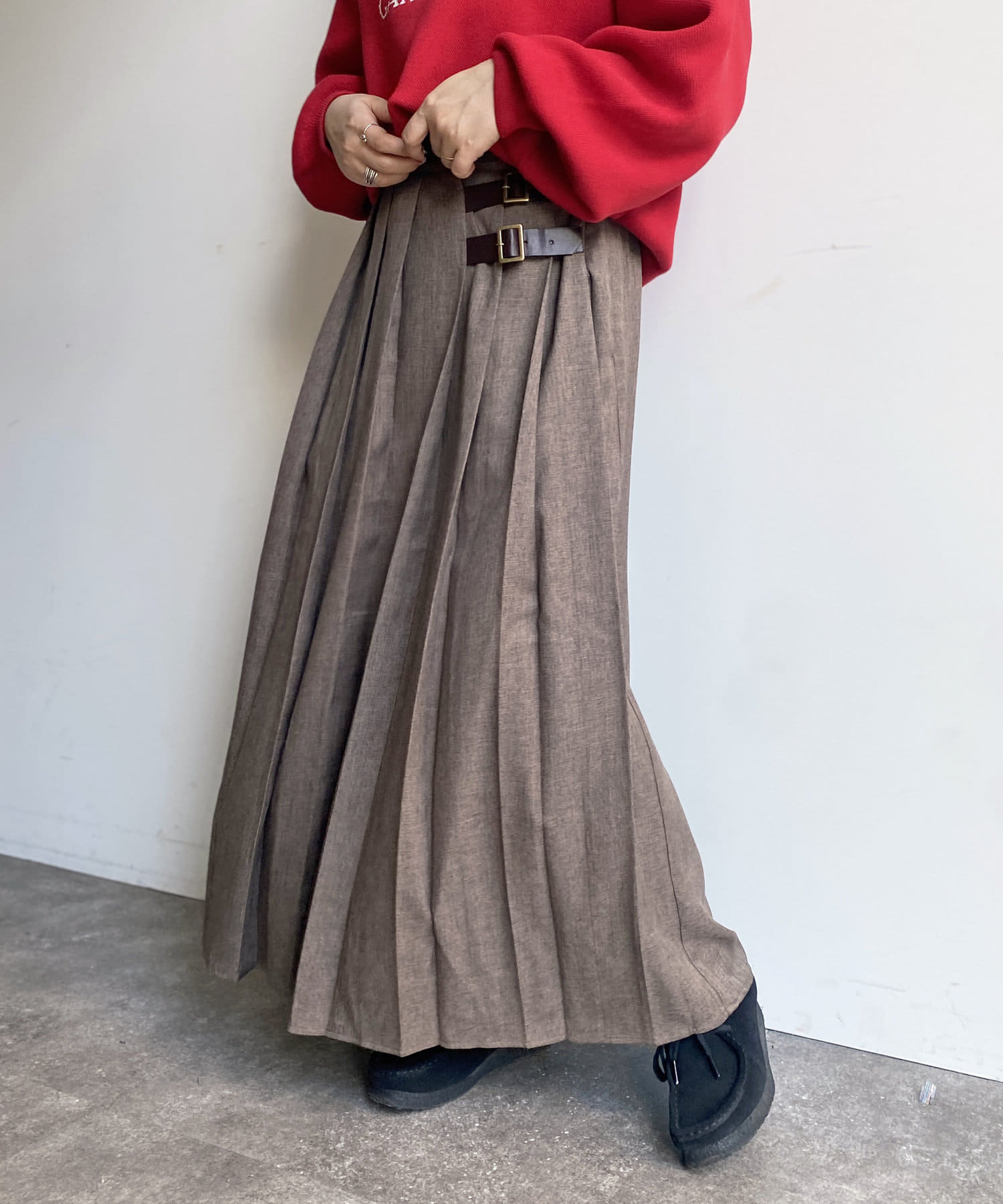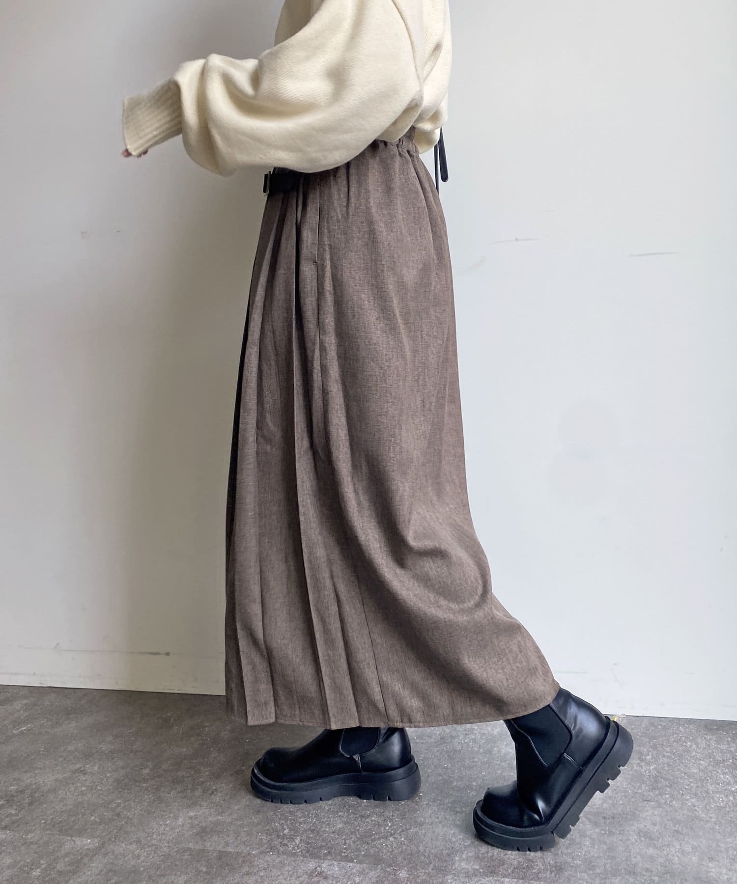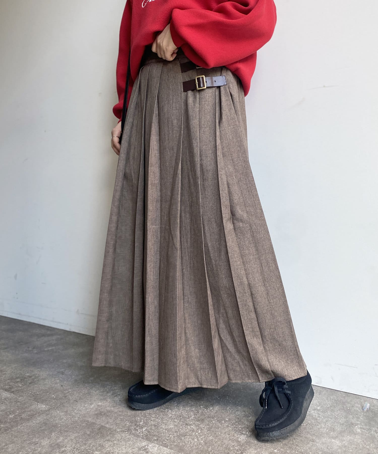 太めのプリーツが歩くたびに揺れ、様々な表情を見せてくれるプリーツスカート。
