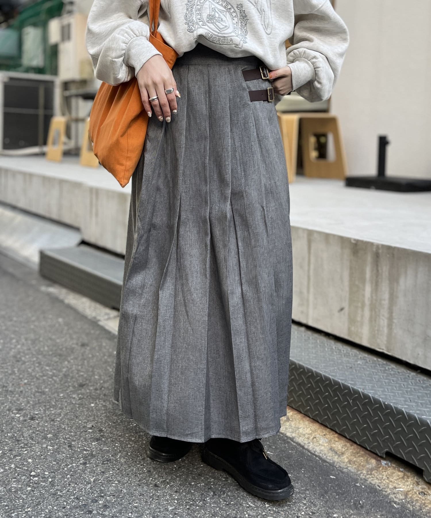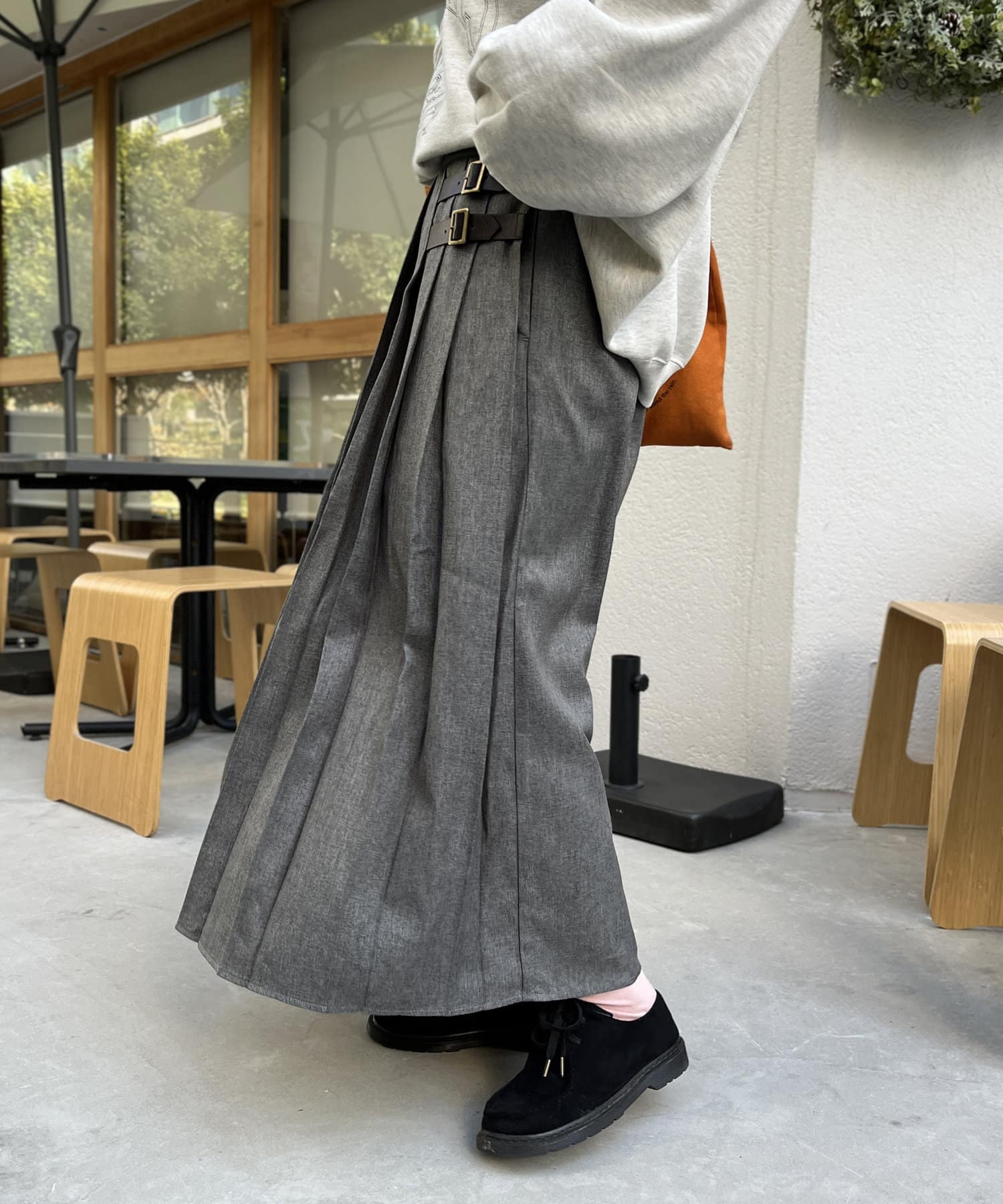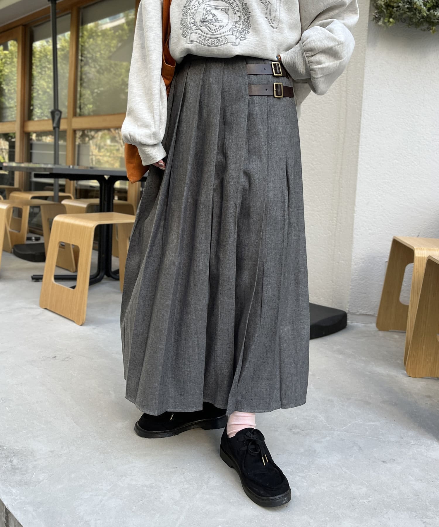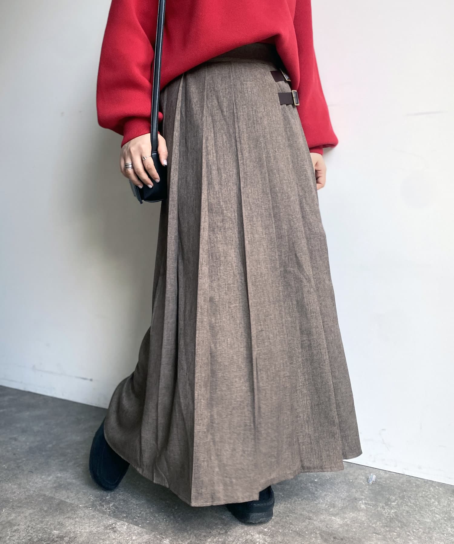 太めのプリーツが歩くたびに揺れ、様々な表情を見せてくれるプリーツスカート。