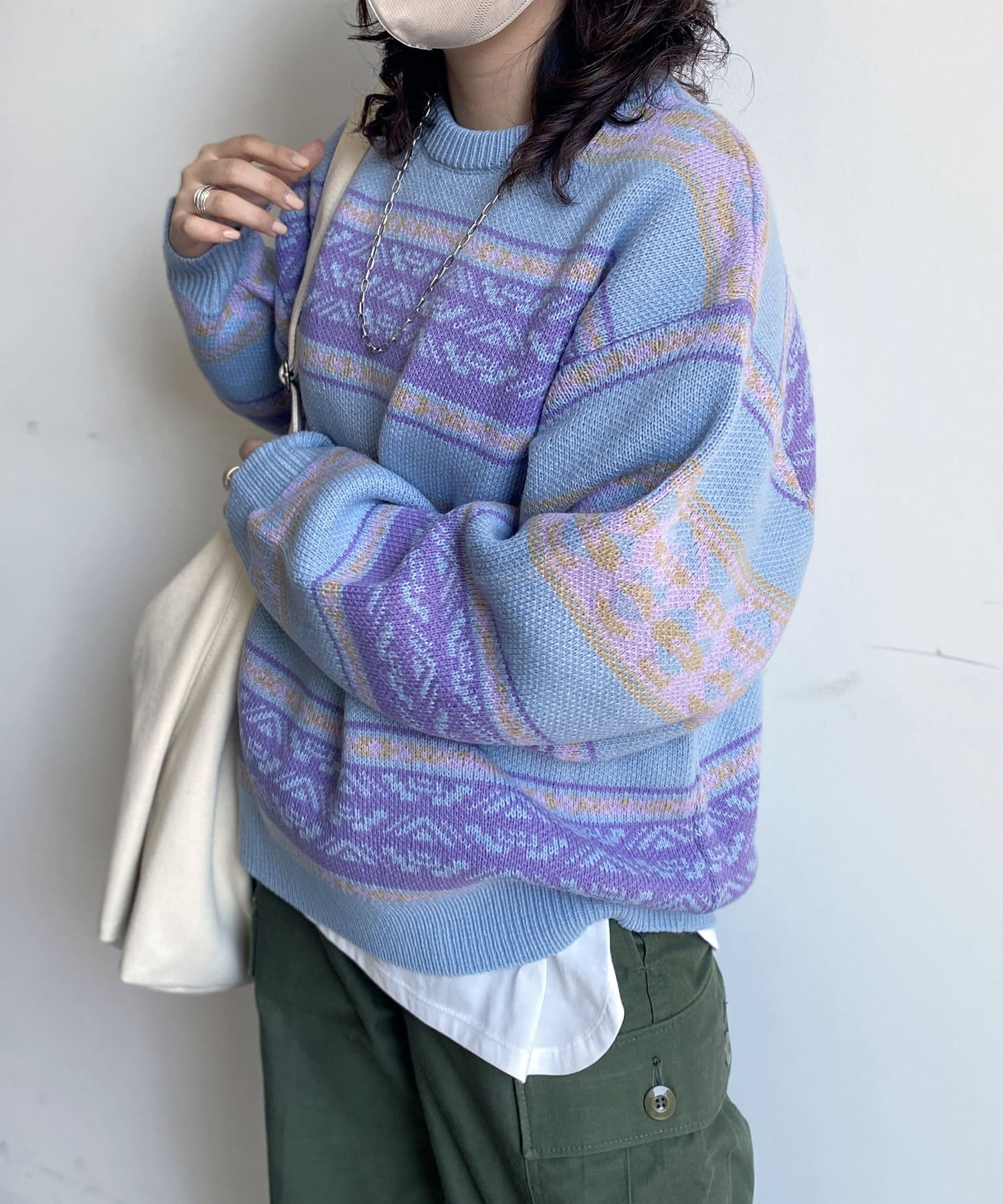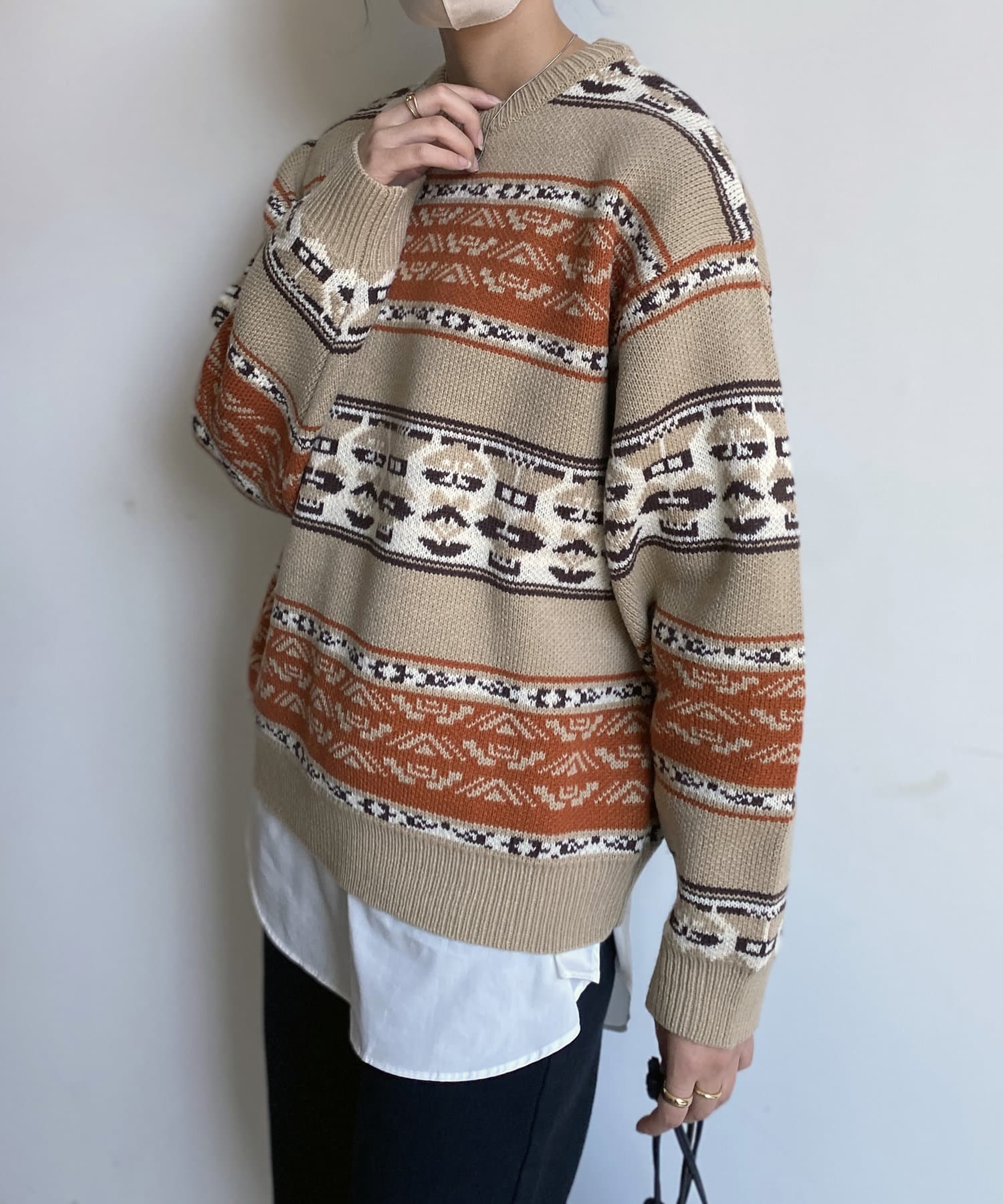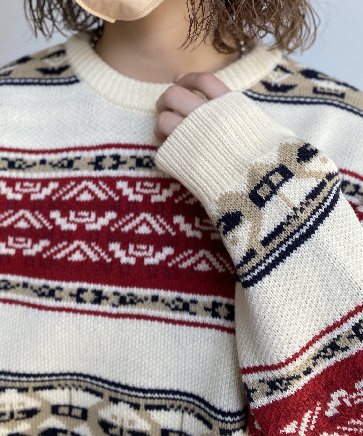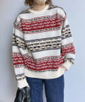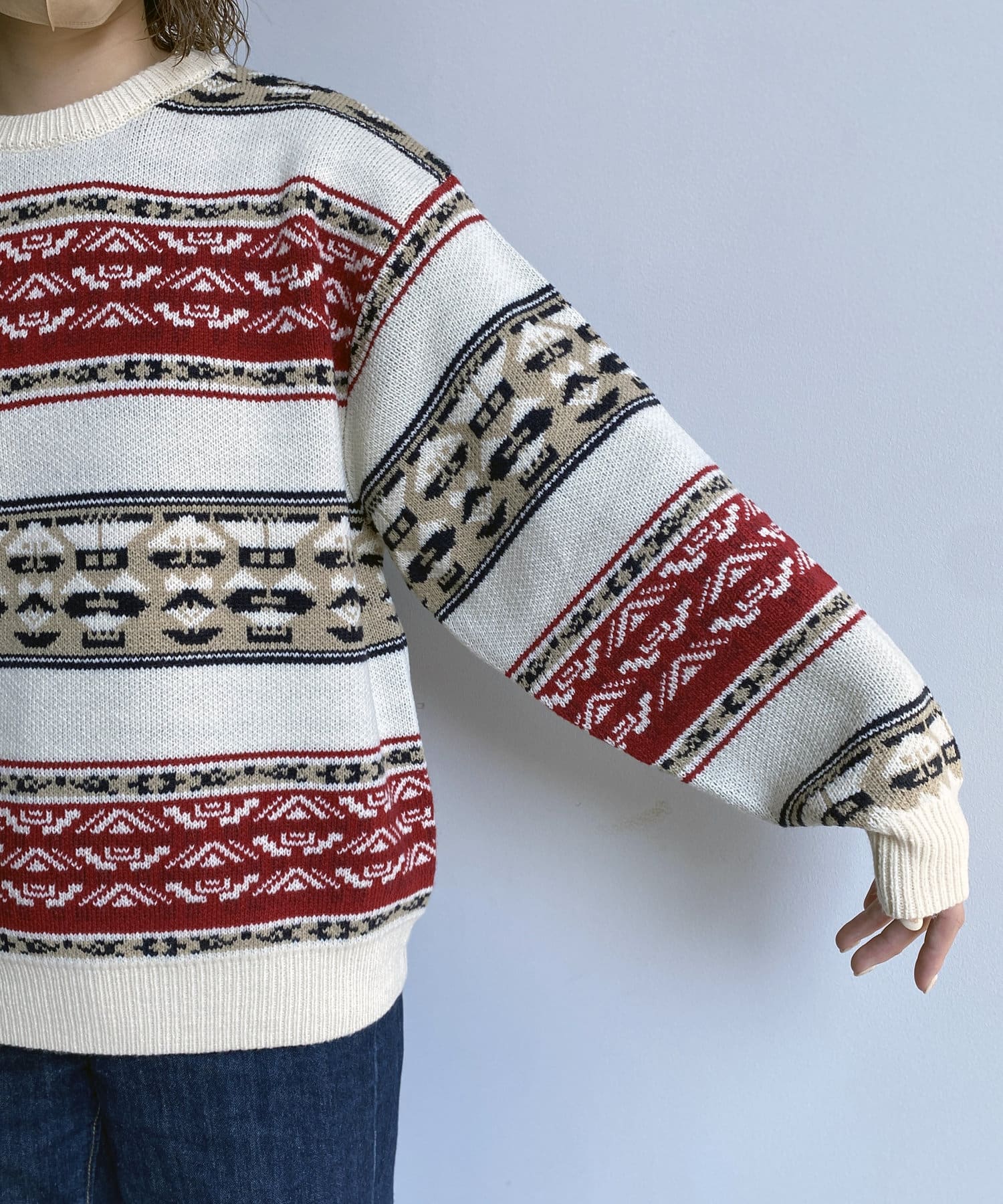 レトロなカラーリングとジャガード編みのボーダーデザインがポイントのプルオーバーニット。