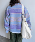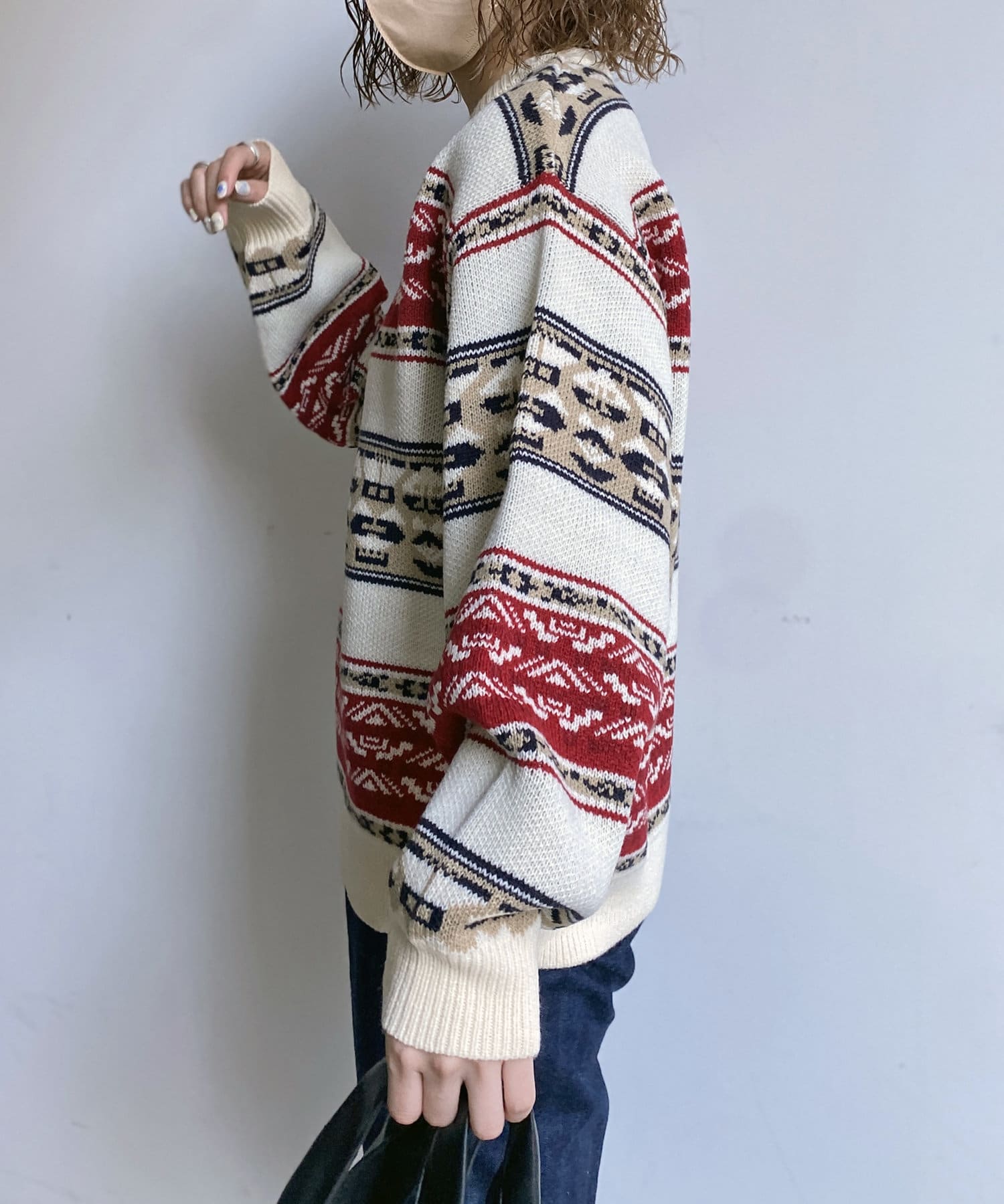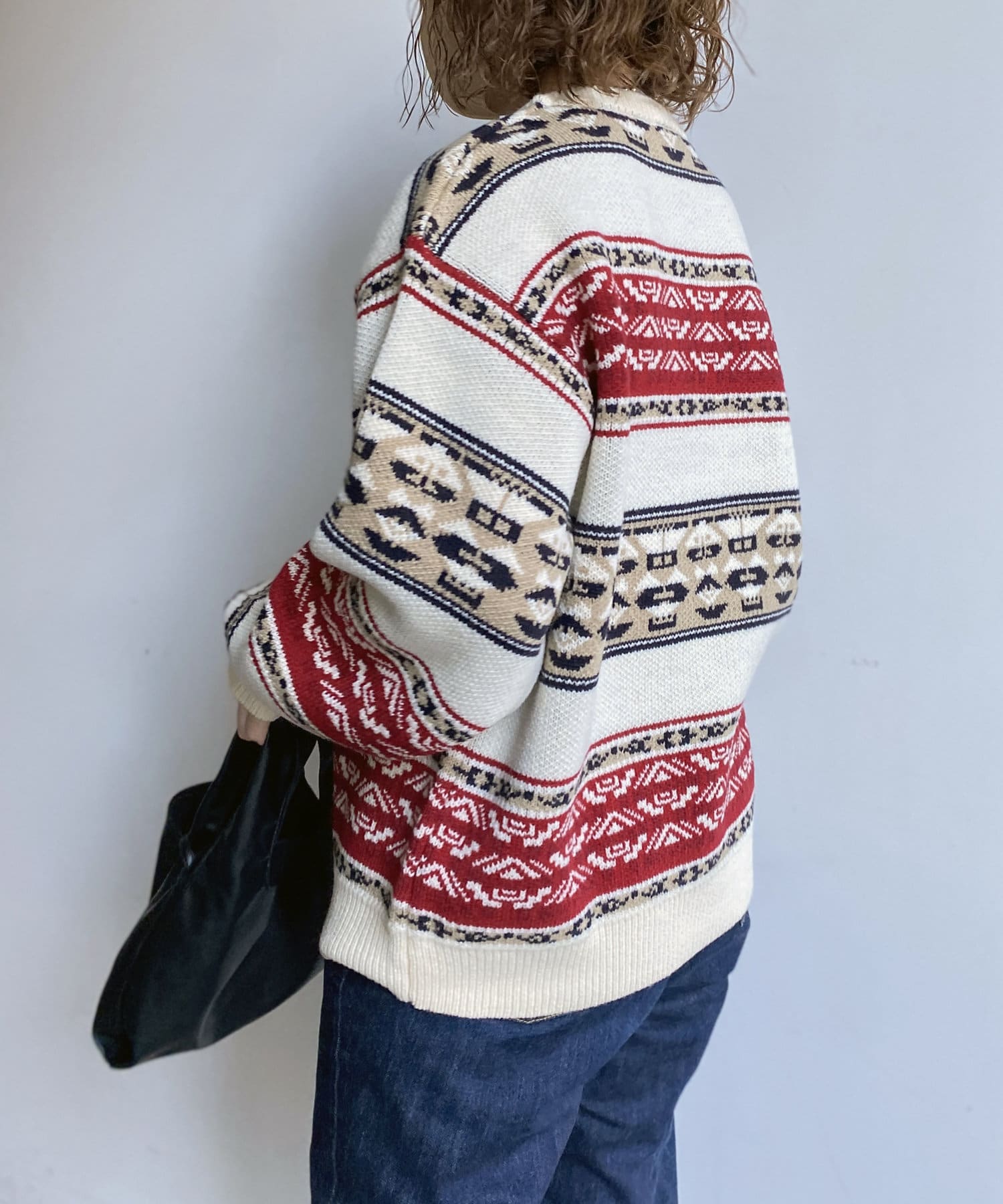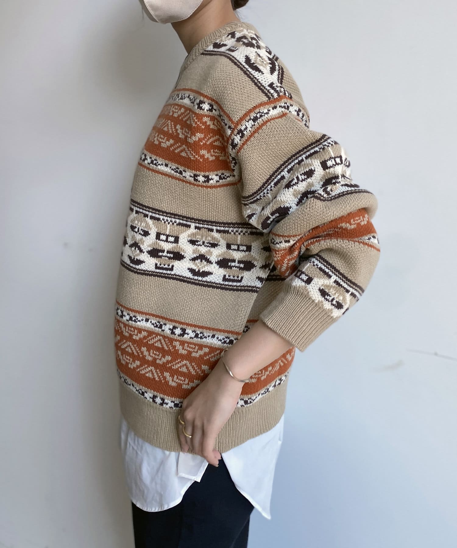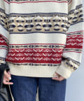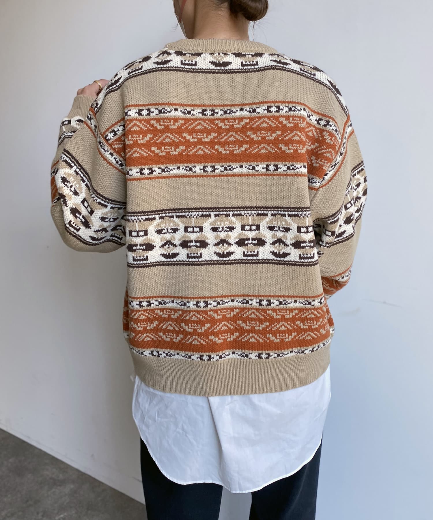 レトロなカラーリングとジャガード編みのボーダーデザインがポイントのプルオーバーニット。