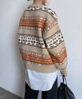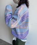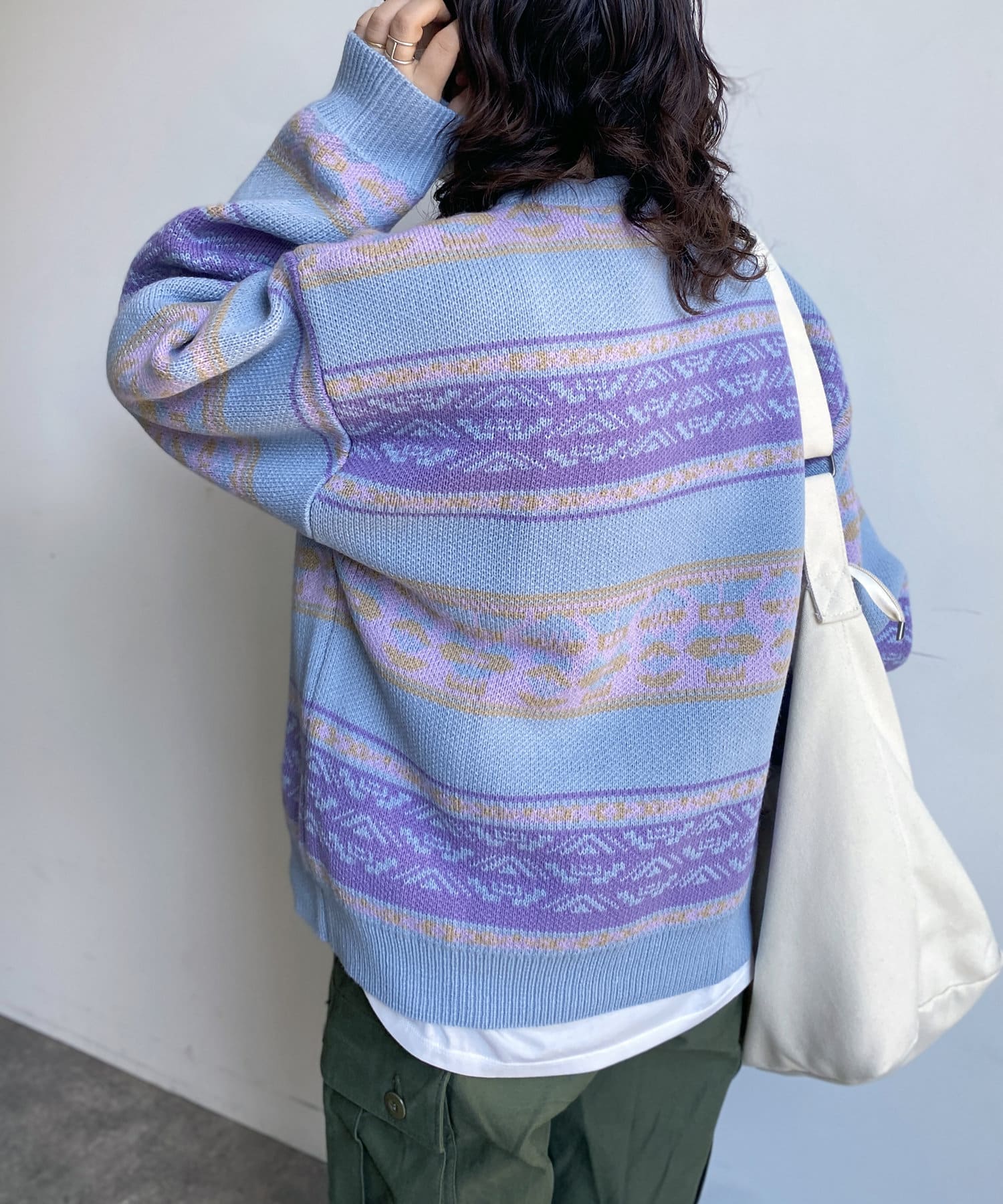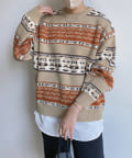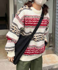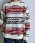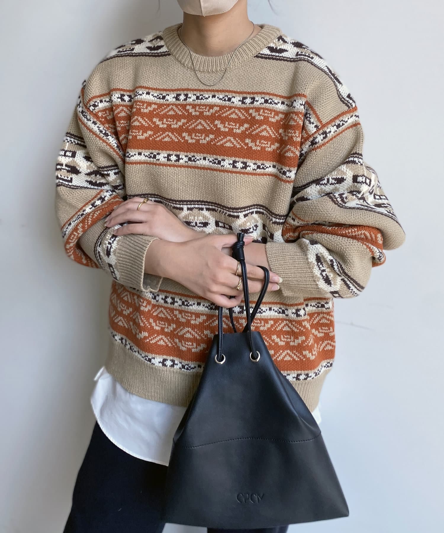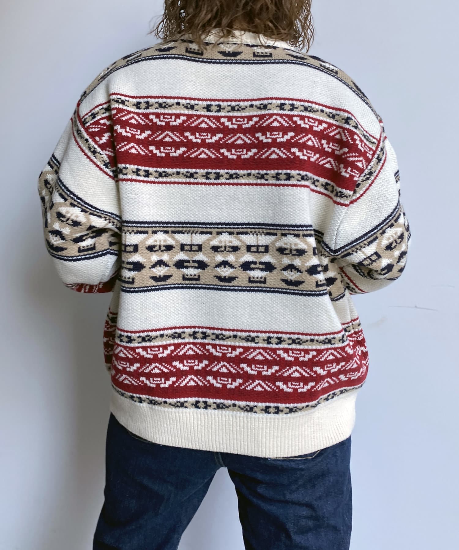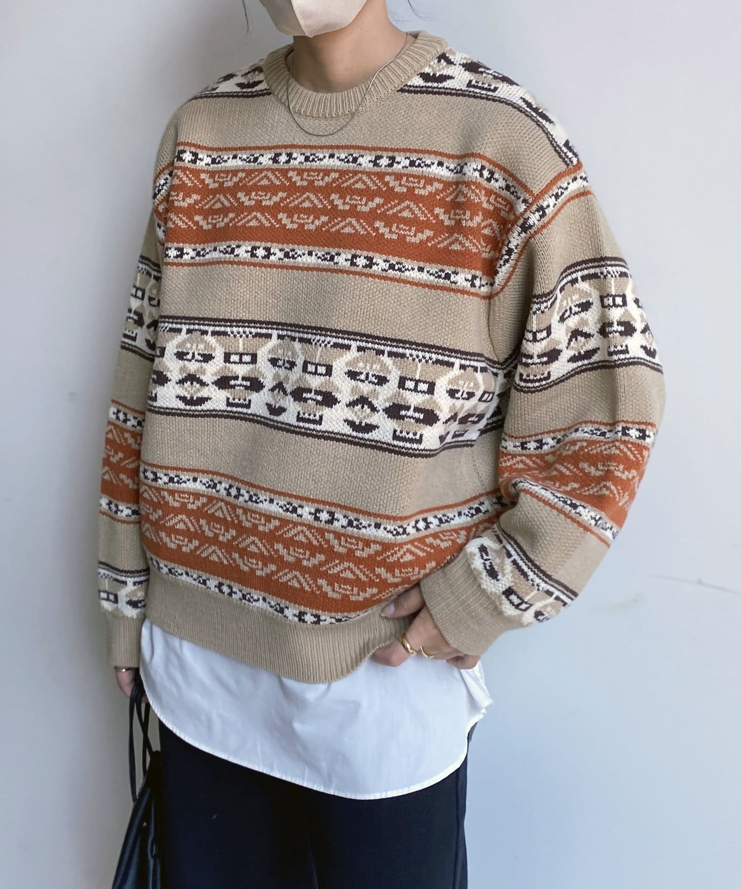 レトロなカラーリングとジャガード編みのボーダーデザインがポイントのプルオーバーニット。