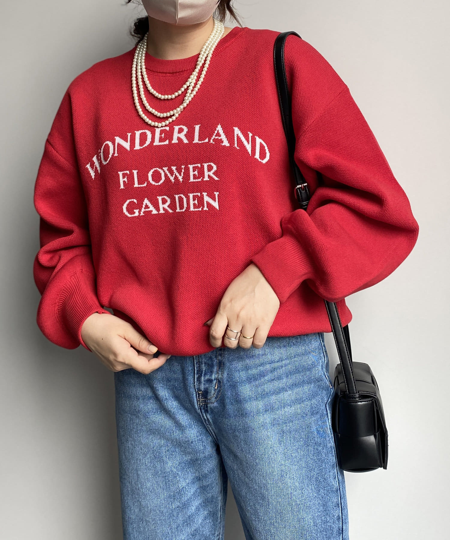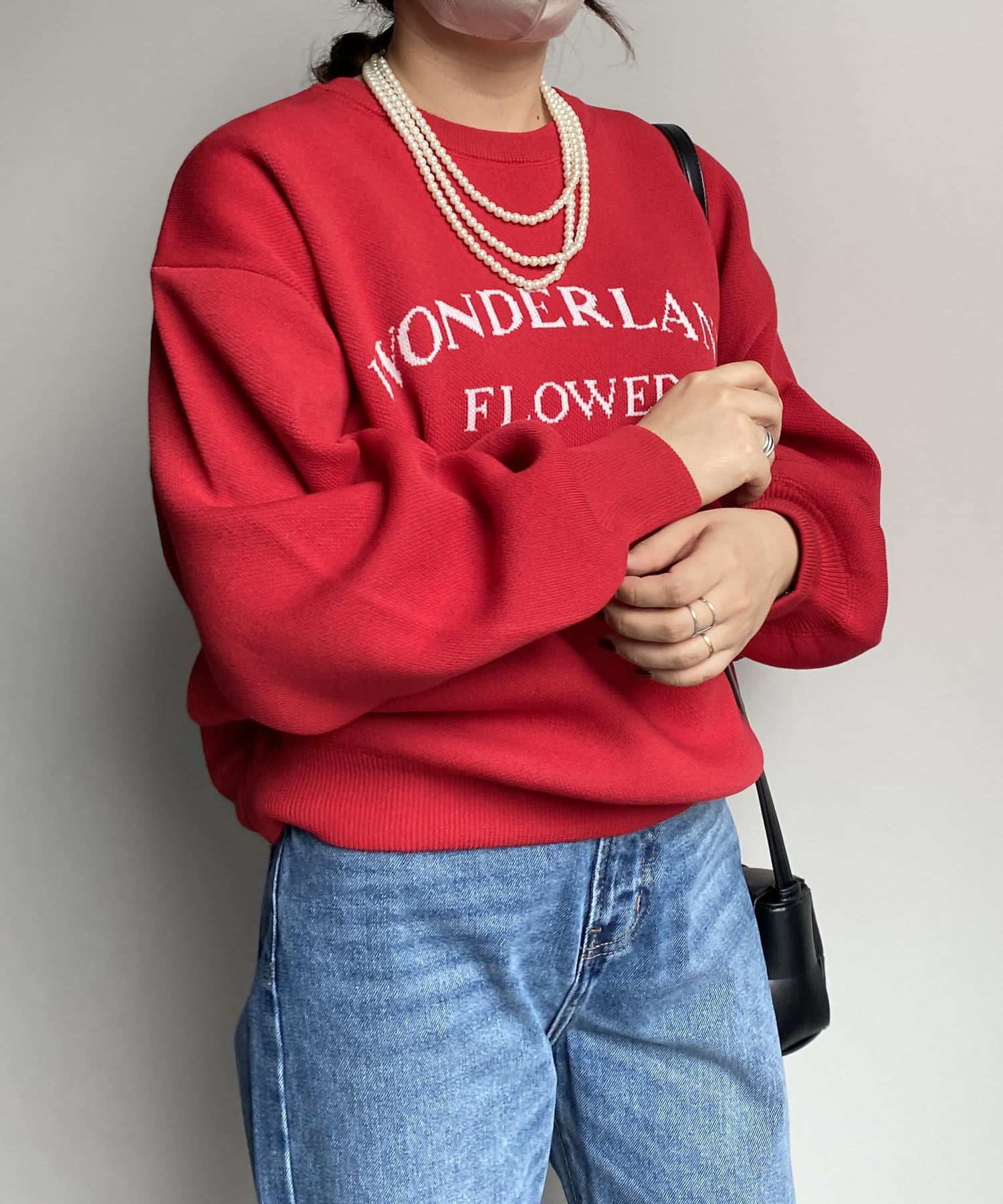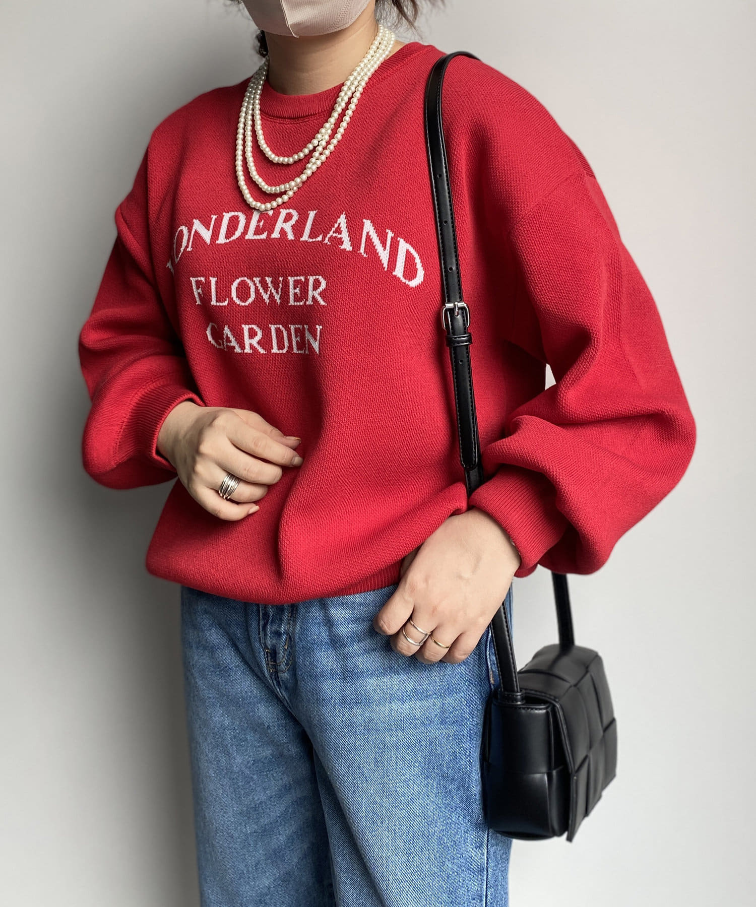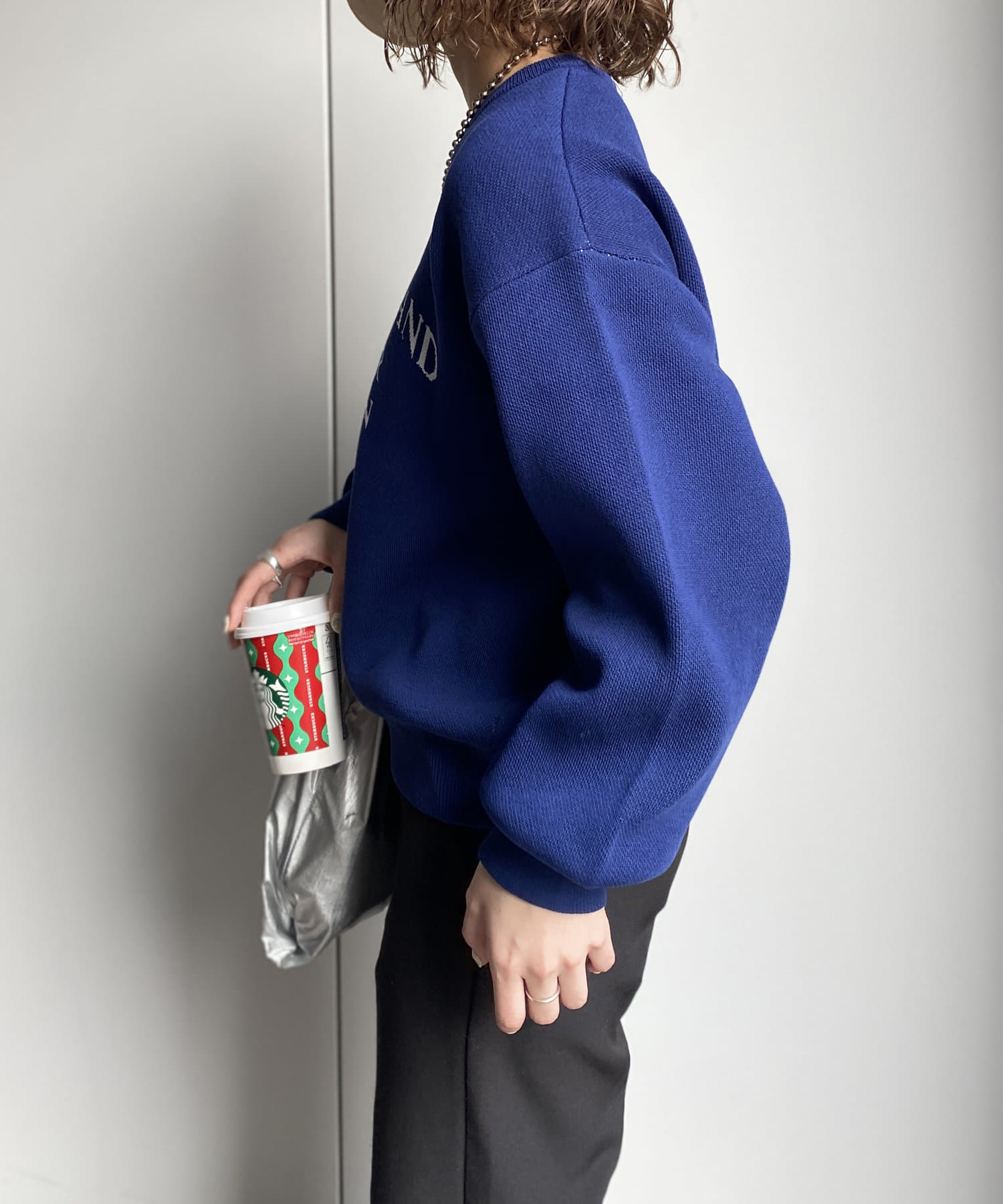 カジュアルすぎない、シンプルなロゴデザインで、幅広くスタイリングに馴染むニットプルオーバー