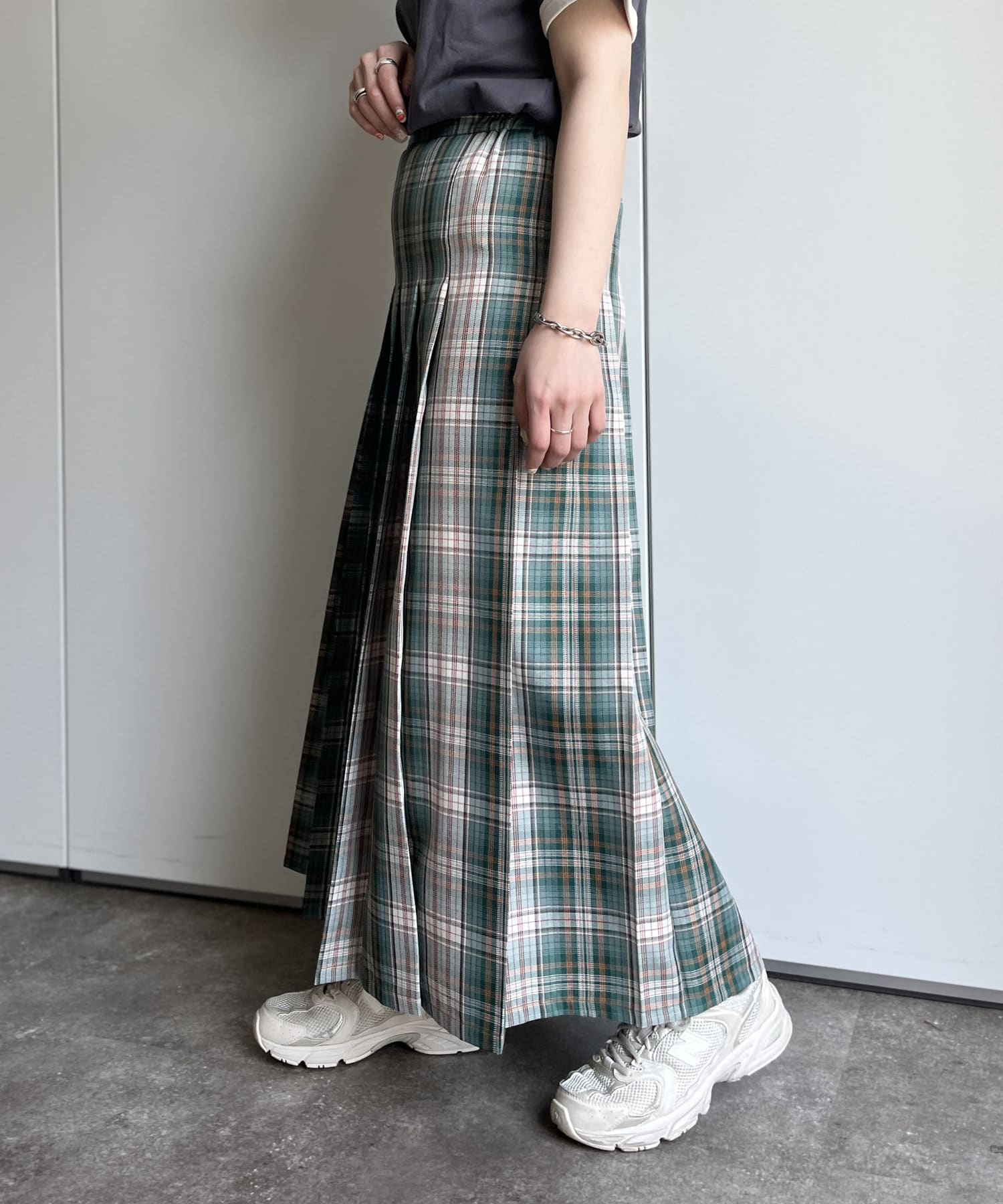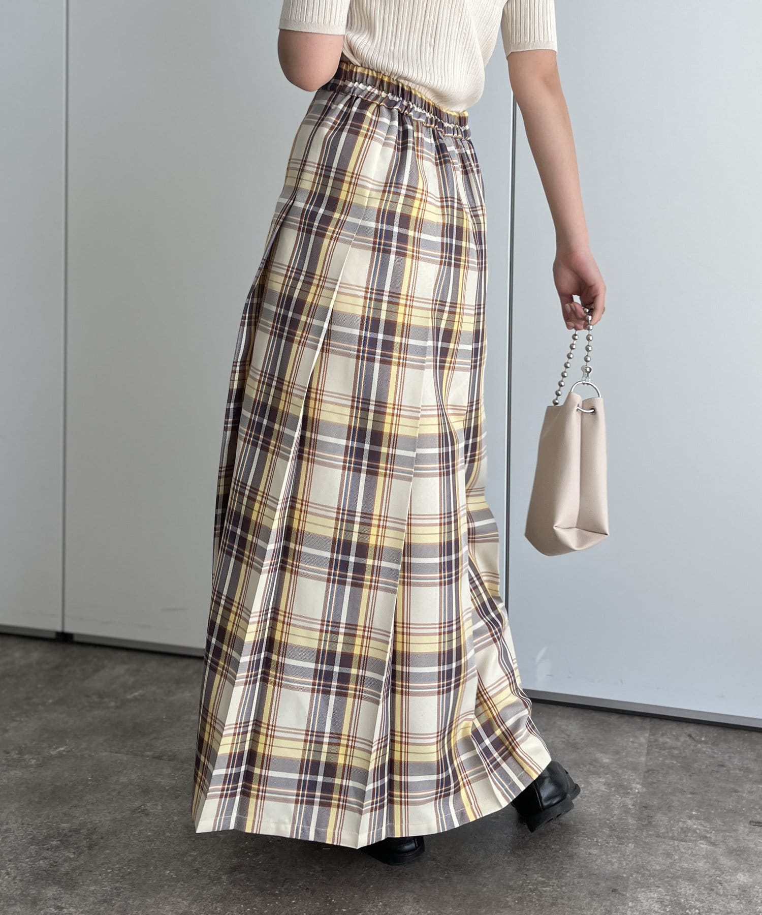 太めのボックスプリーツが歩くたびに揺れ、様々な表情を見せてくれます。