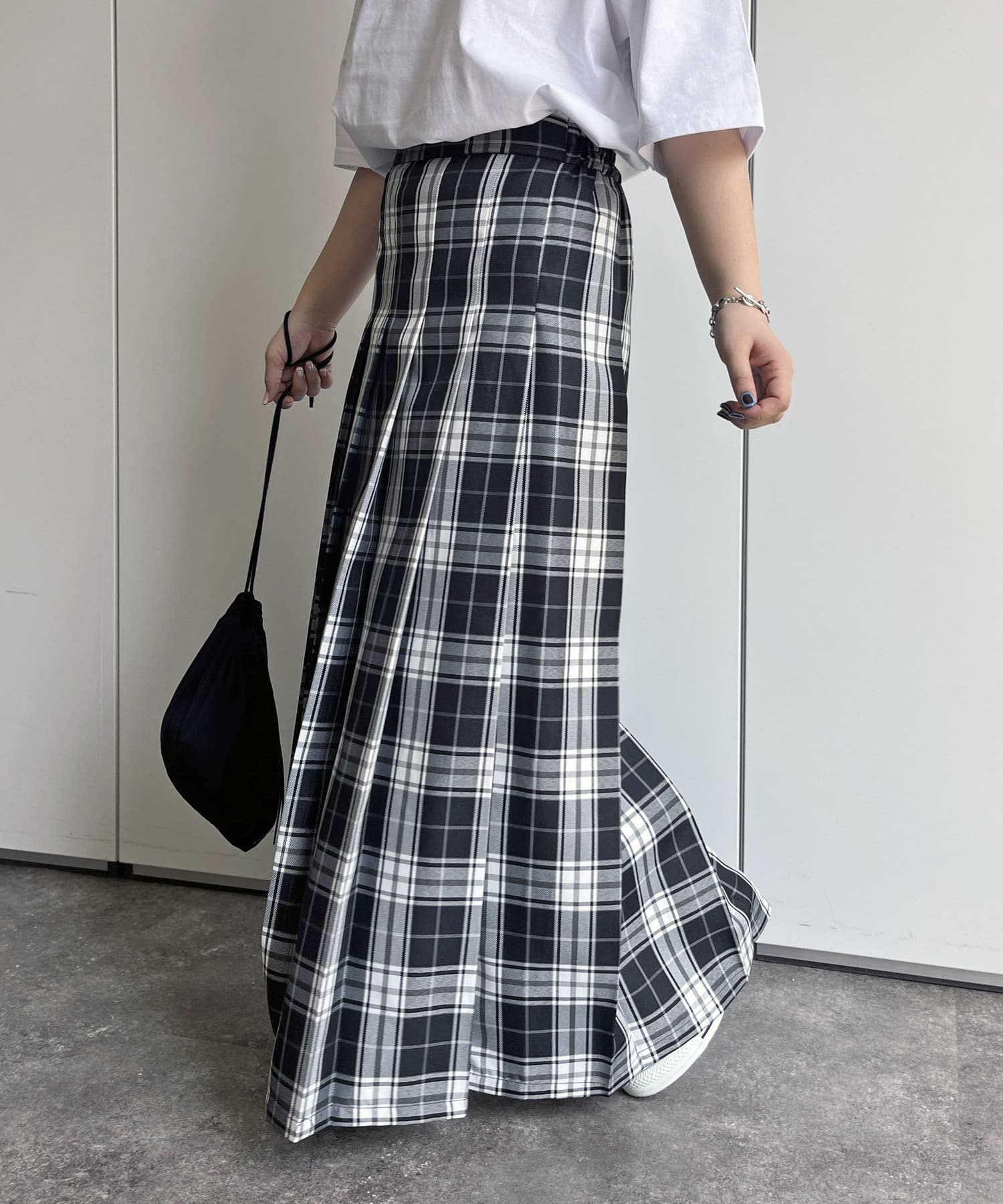 下半身のラインを拾いにくいシルエットなのも魅力的なロングスカートです。