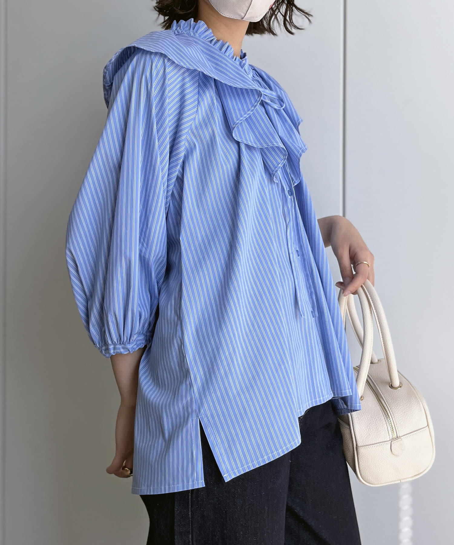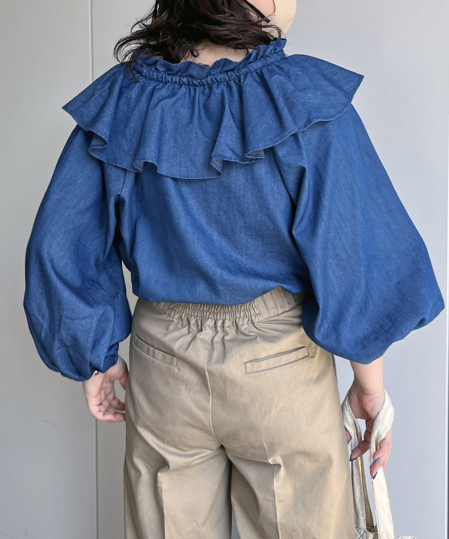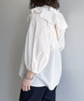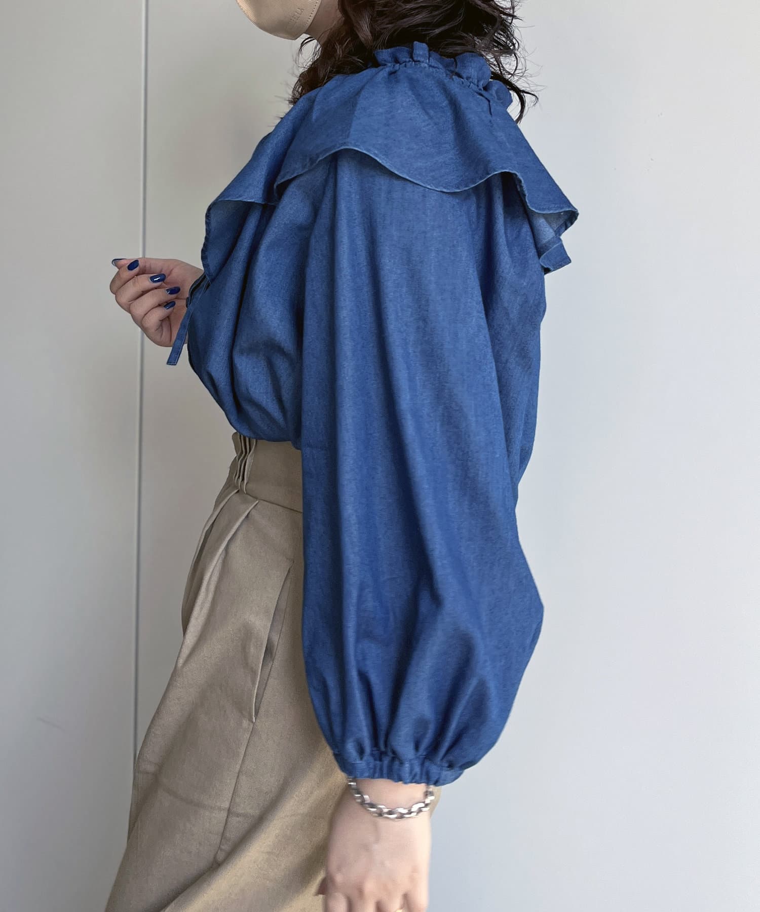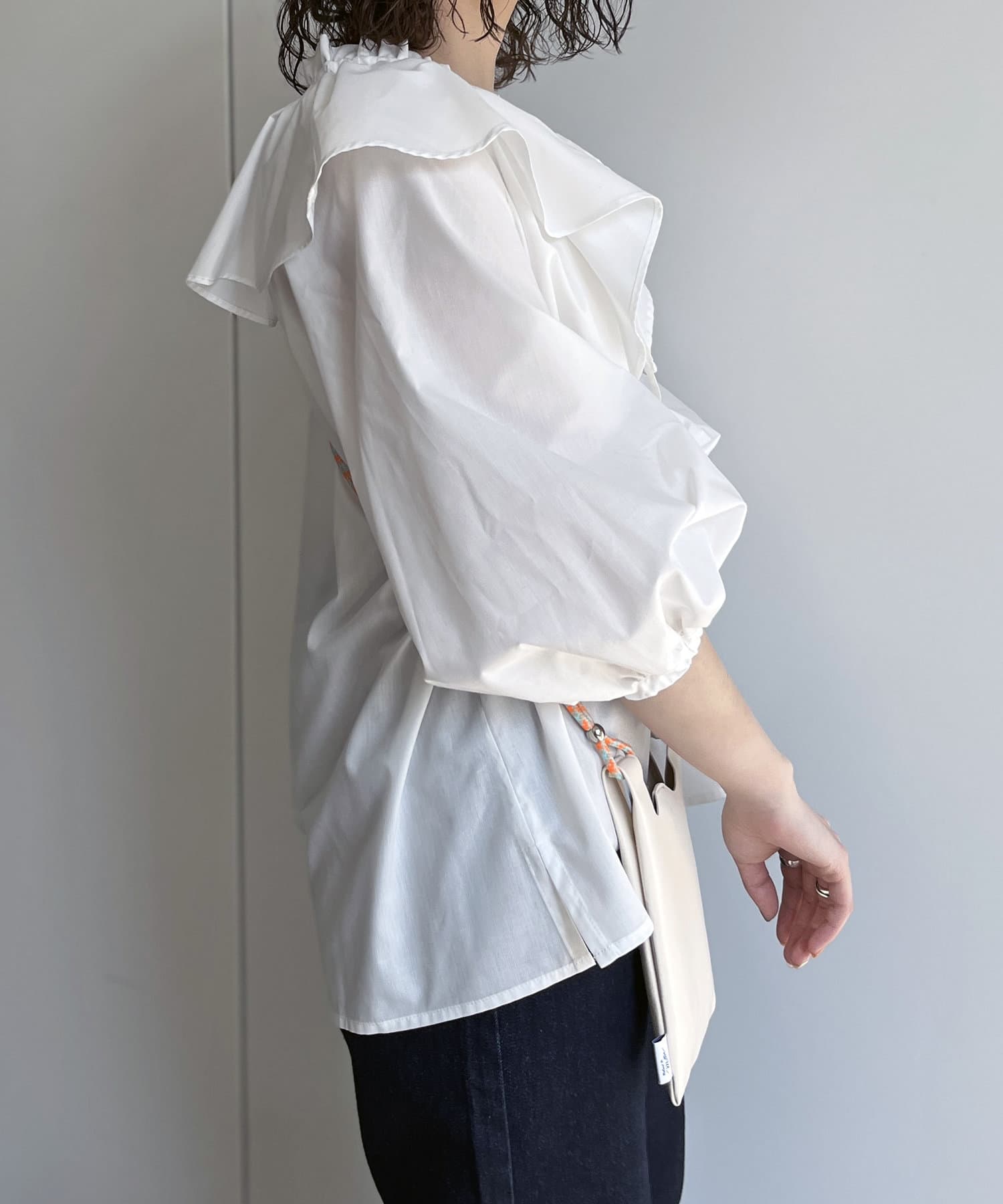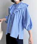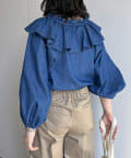 存在感のあるラッフルカラーとボリューム袖で、フェミニンな印象を与えてくれるフリルブラウス。