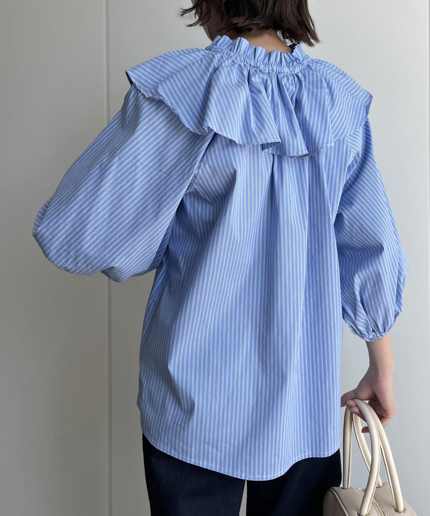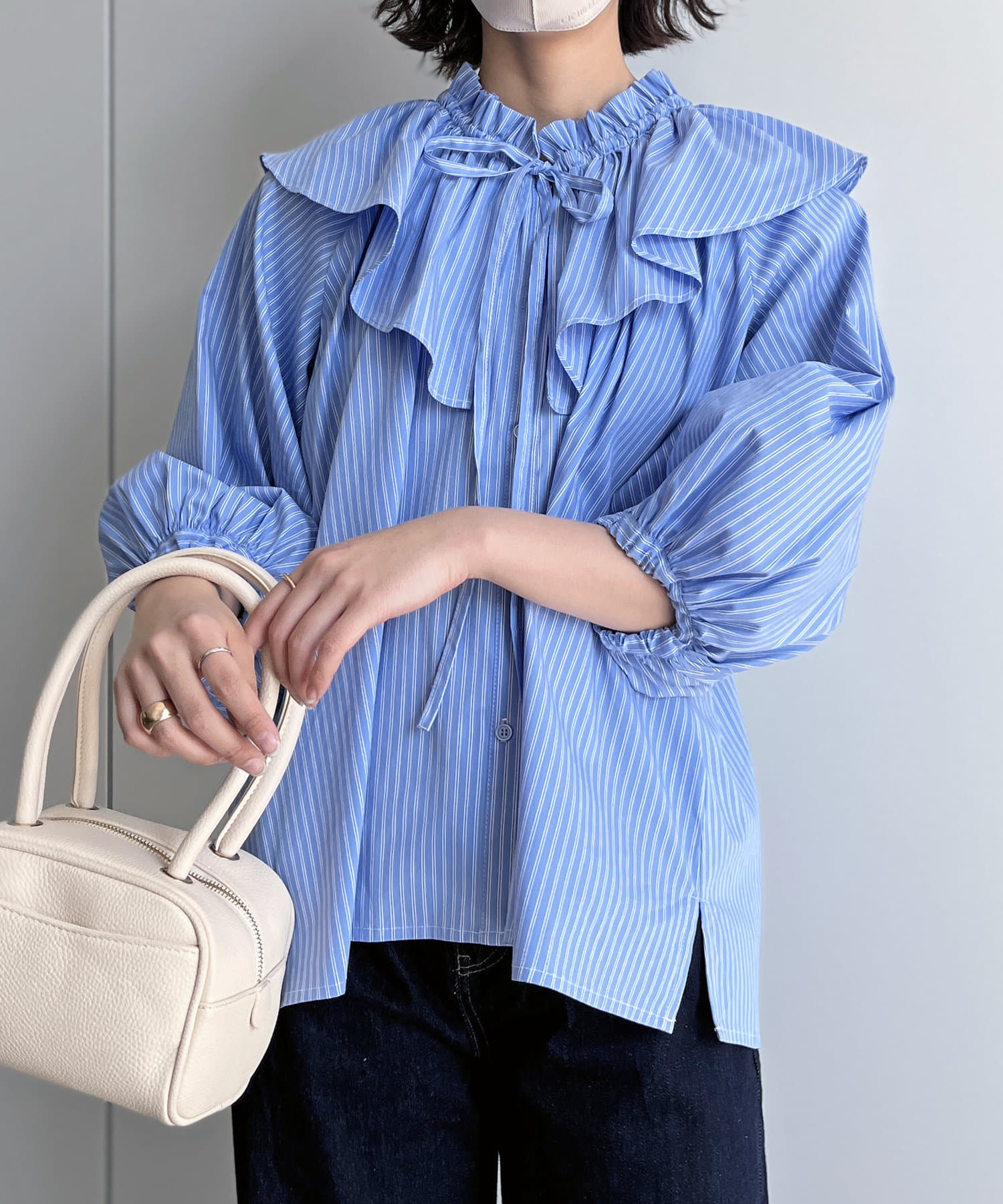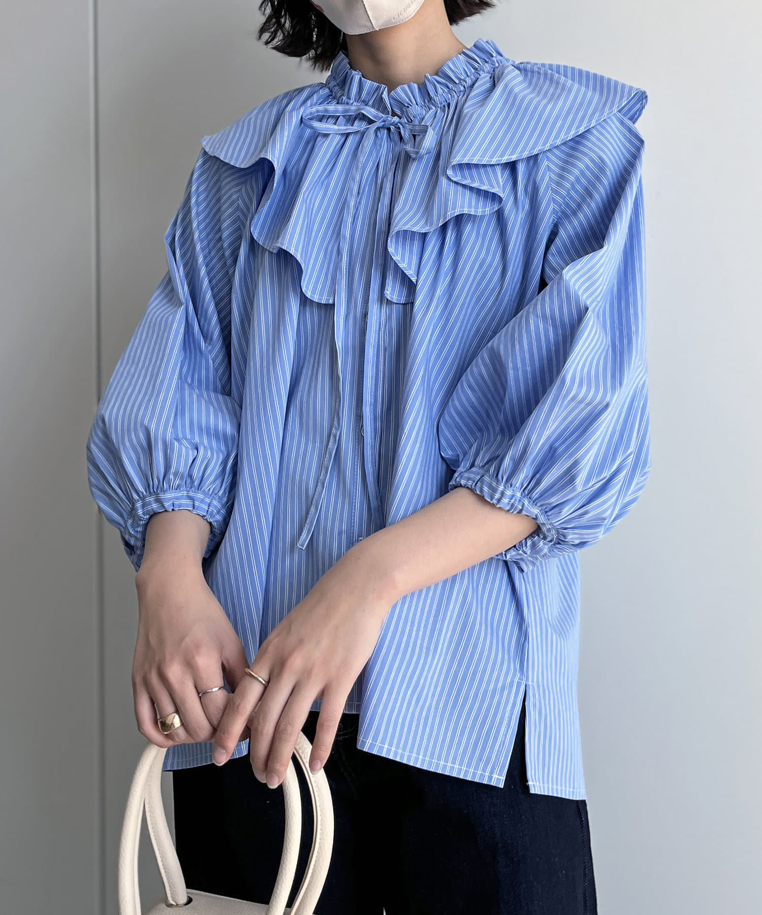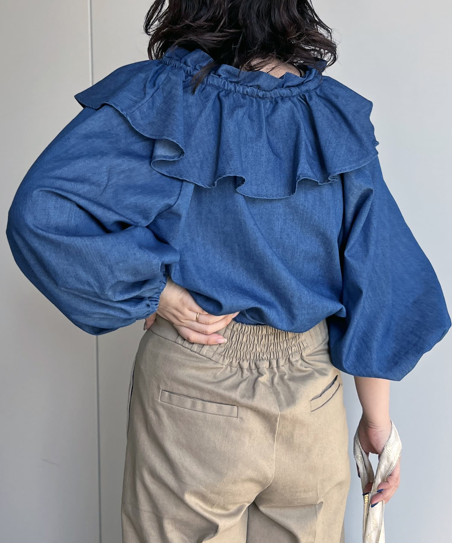 存在感のあるラッフルカラーとボリューム袖で、フェミニンな印象を与えてくれるフリルブラウス。