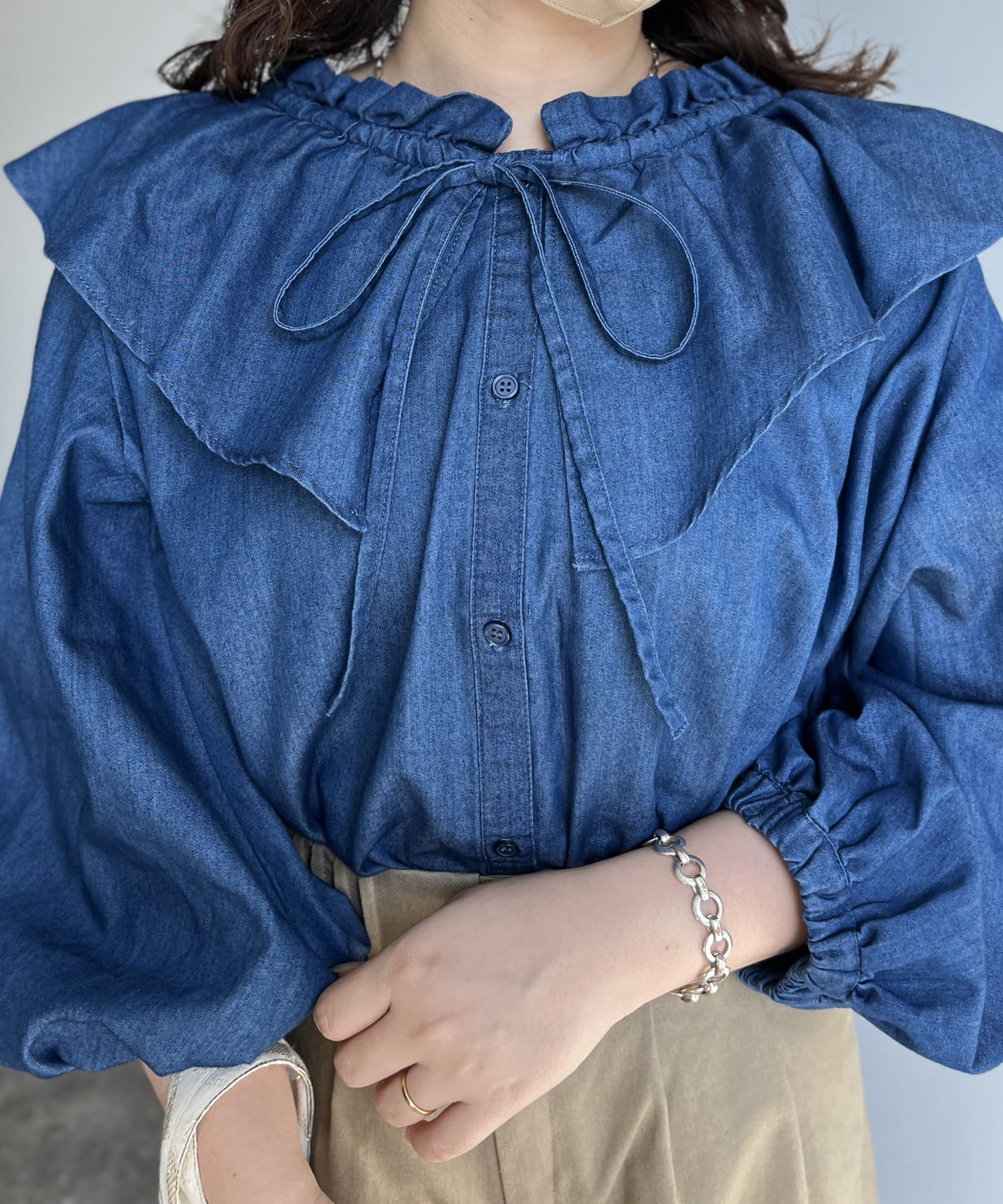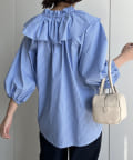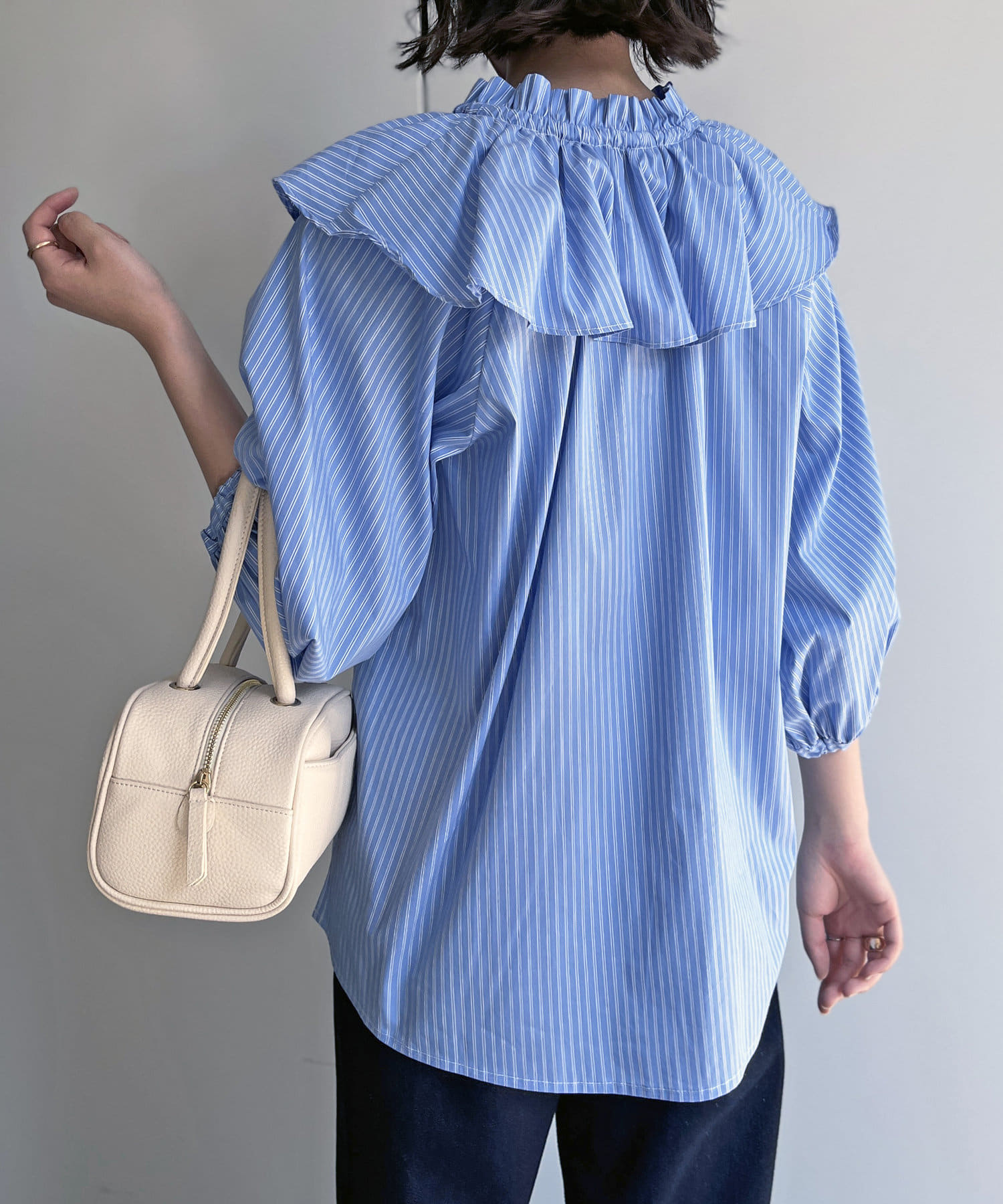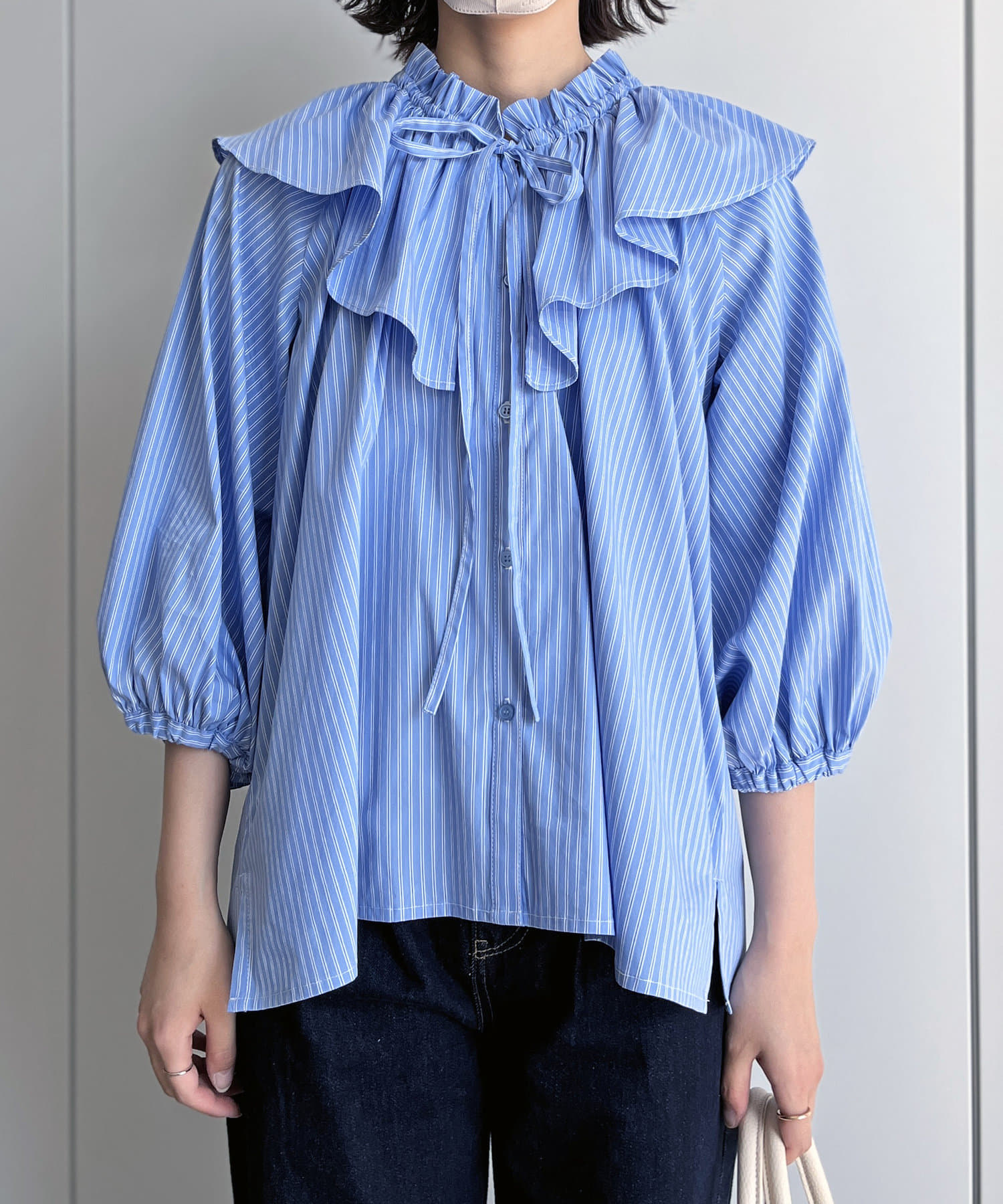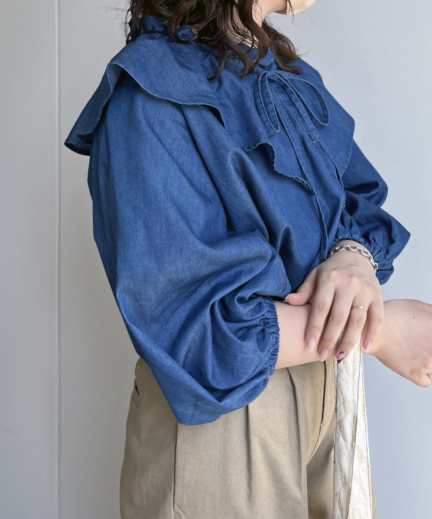 存在感のあるラッフルカラーとボリューム袖で、フェミニンな印象を与えてくれるフリルブラウス。