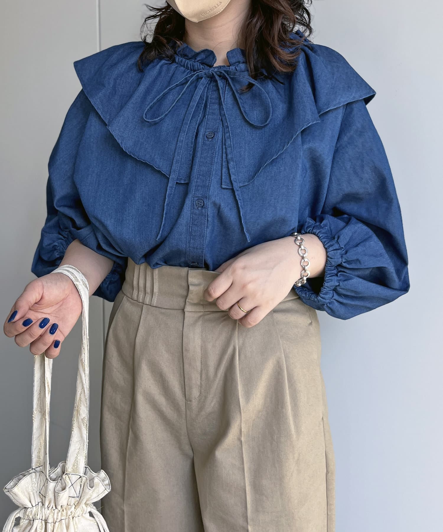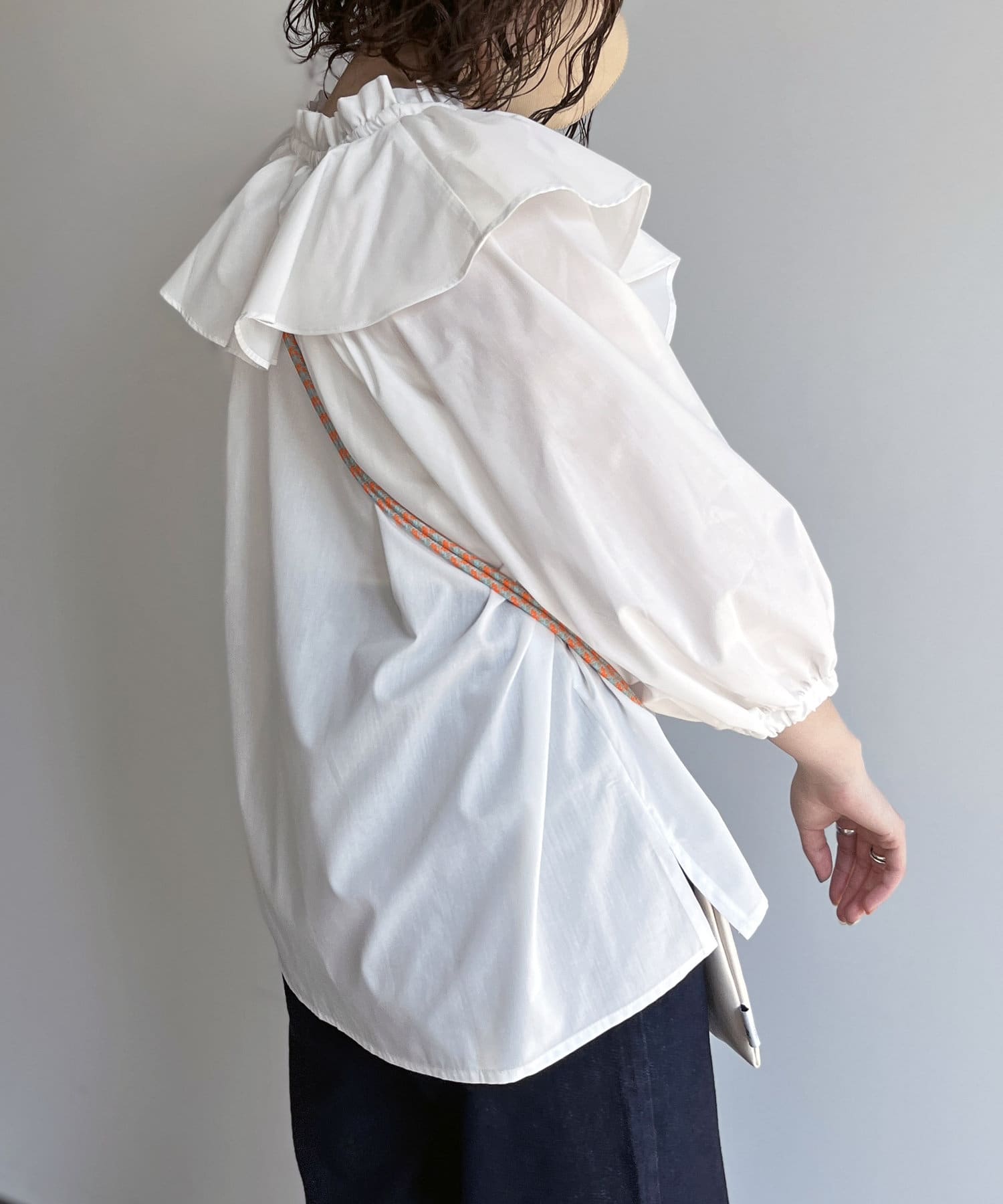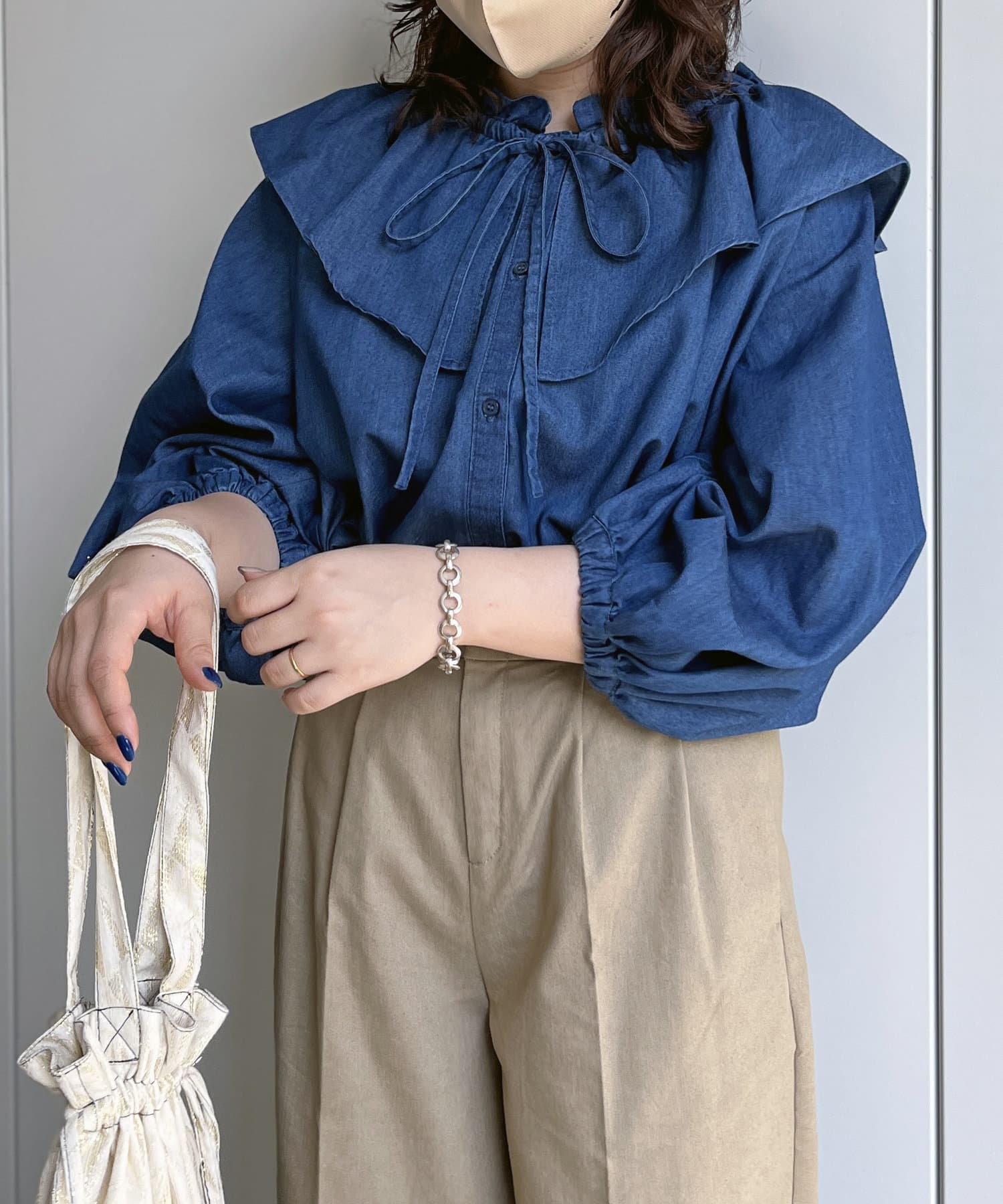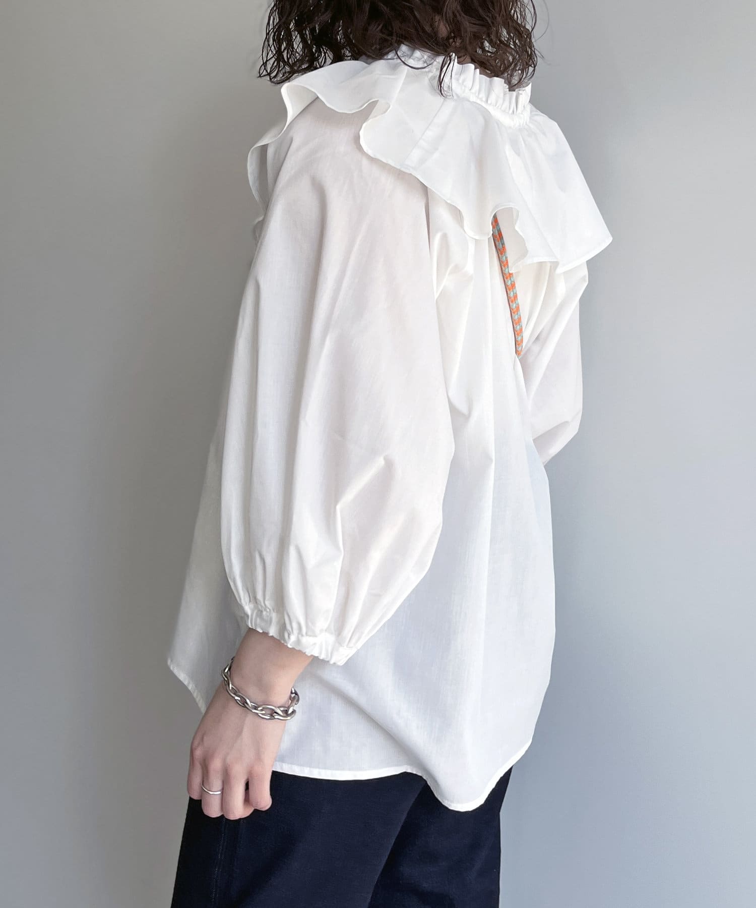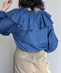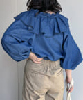 フェミニンな印象のブラウスは、デニムパンツやチノパンと合わせたフレンチカジュアルなスタイリングが今年らしくてオススメです。ラッフルカラーを活かしてキャミワンピやオールインワンのインナーとしての着用や、ニットやカーディガンとのレイヤードスタイルをお楽しみいただける万能な1着です。